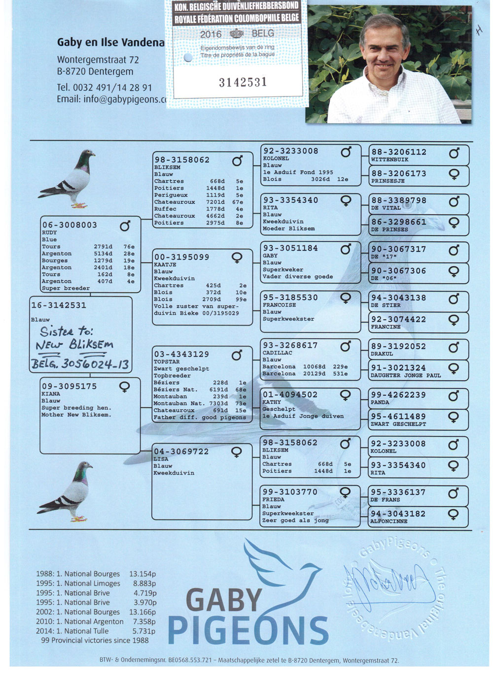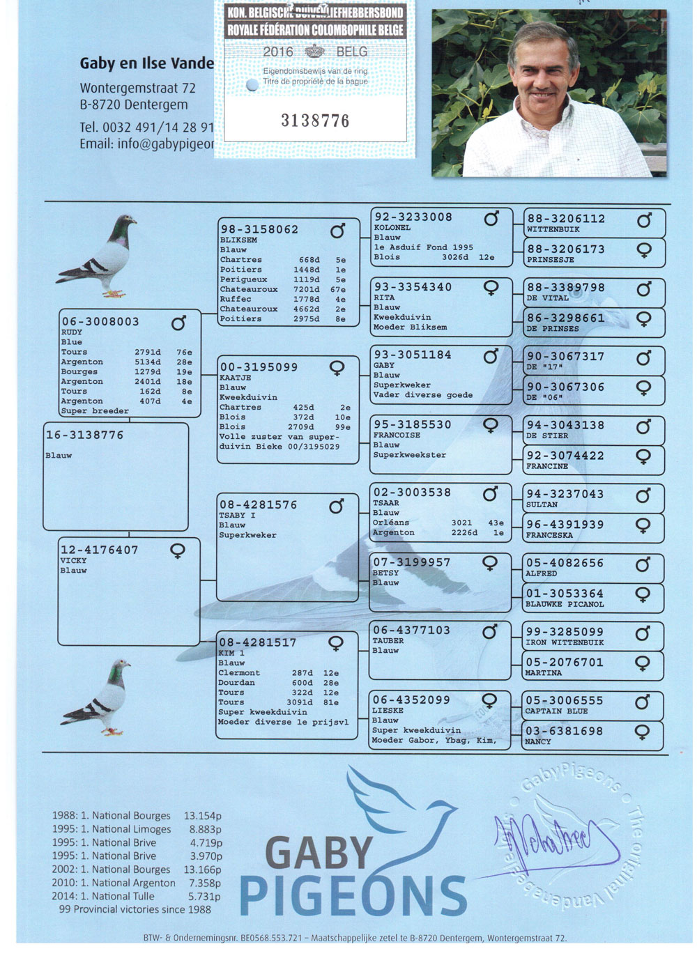 荣获8个冠军奖项 2009年KBDB全国大中距离鸽王冠军 2008年KBDB全国大中距离鸽王4位 2008年KBDB全省中距离鸽王亚军 萨布利斯联省4774羽冠军 奥尔良联省3132羽冠军 图利联省3256羽冠军 莫伦联省1946羽冠军