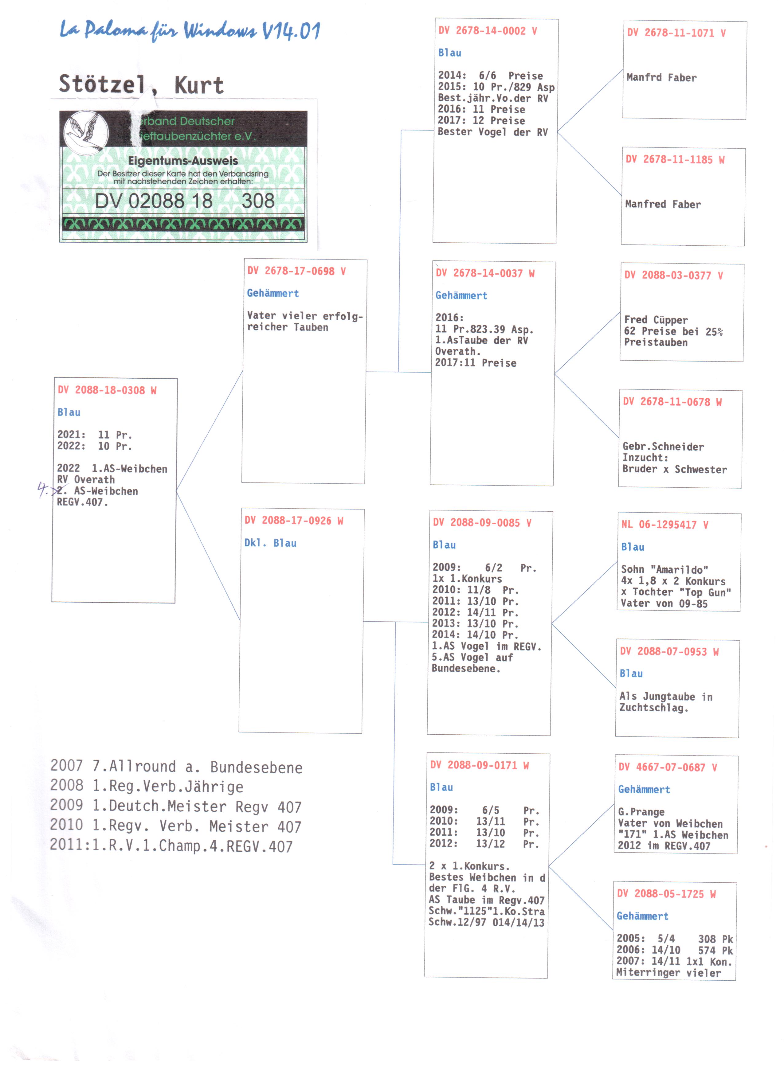 考夫曼 德国22年联合会鸽王冠军,省鸽王4名,21年联合会鸽王3名 省一岁鸽79名4548羽441公里,省一岁鸽88名4013羽441公里,省一岁鸽67名2225羽533公里,省12名3940羽302公里,省38名4262羽441公里,省25名4145羽441公里,省57名2336羽533公里