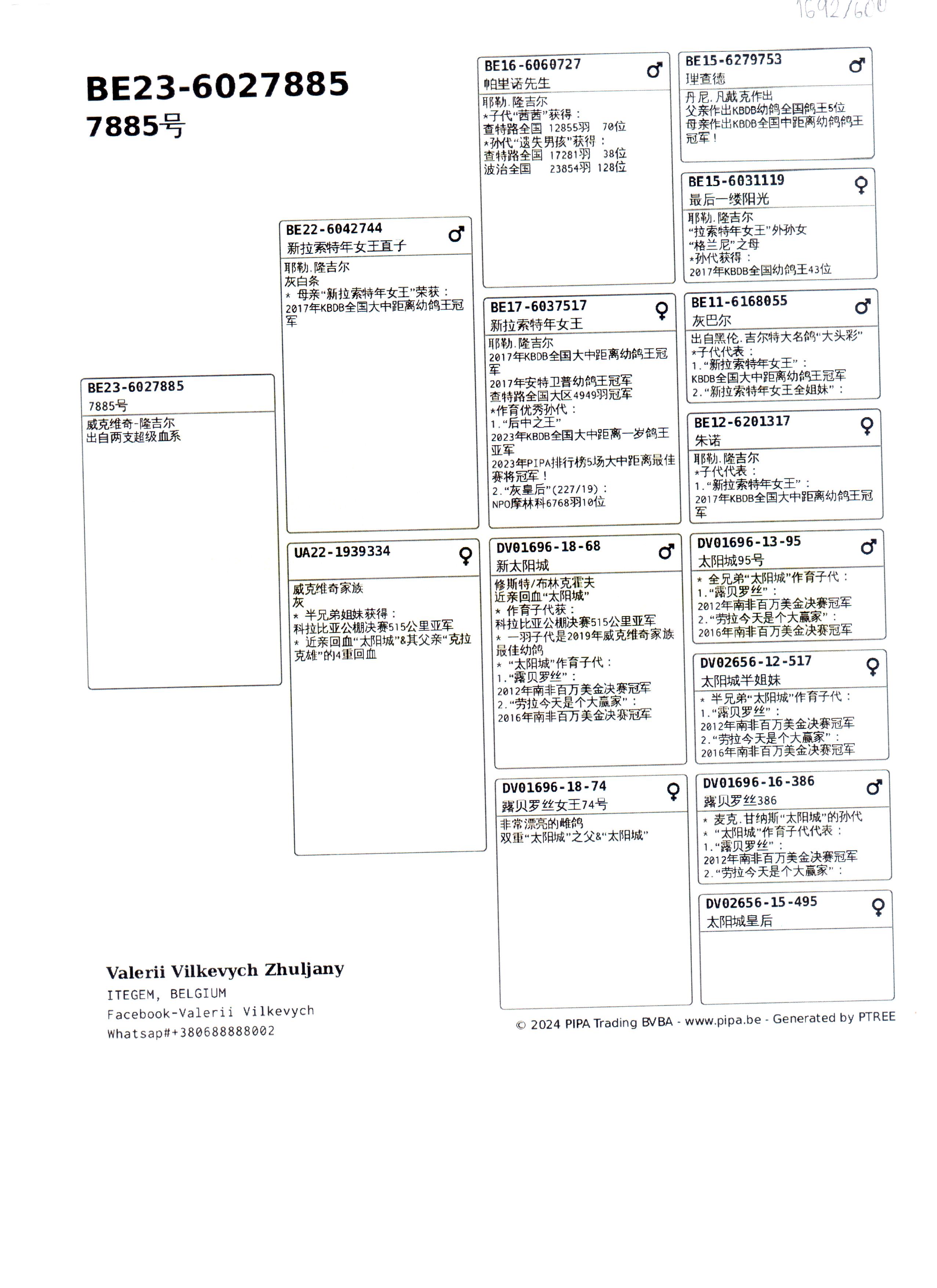 隆吉尔原舍 与美国瑞克.帕里诺合作育种作出 作出子代“茜茜”:查特鲁12855羽70名 作出孙代“遗失男孩”: 查特鲁全国17281羽38名 波治全国128名