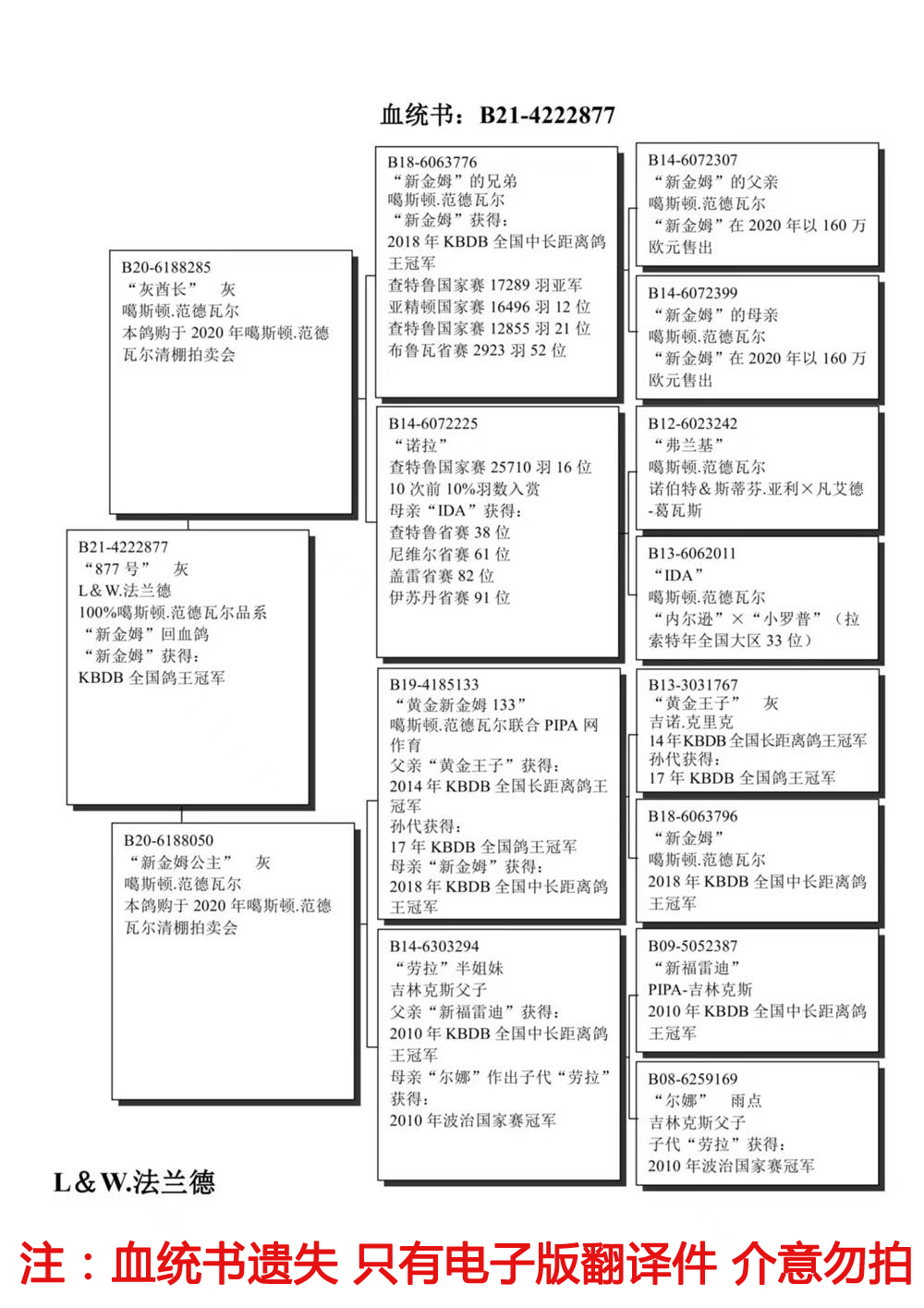 父:B20-6188285 灰酋长 灰 噶斯顿.范德瓦尔本鸽购于2020年噶斯顿.范德瓦尔清棚拍卖会