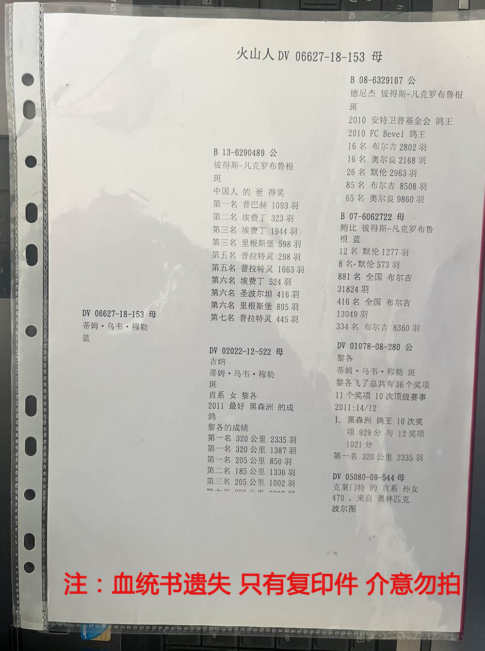 父:B13-6290489 彼得斯-凡克罗布鲁根 斑 中国的得奖:第一名 普巴赫1093羽;第二名 埃费丁323羽;第三名 埃费丁1944羽;第三名 里根斯堡598羽;第五名 普拉特灵298羽;第五名 普拉特灵1663羽;第六名 埃费丁524羽;第六名 圣波尔坦416羽;第六名 里根斯堡895羽;第七名 普拉特灵445羽