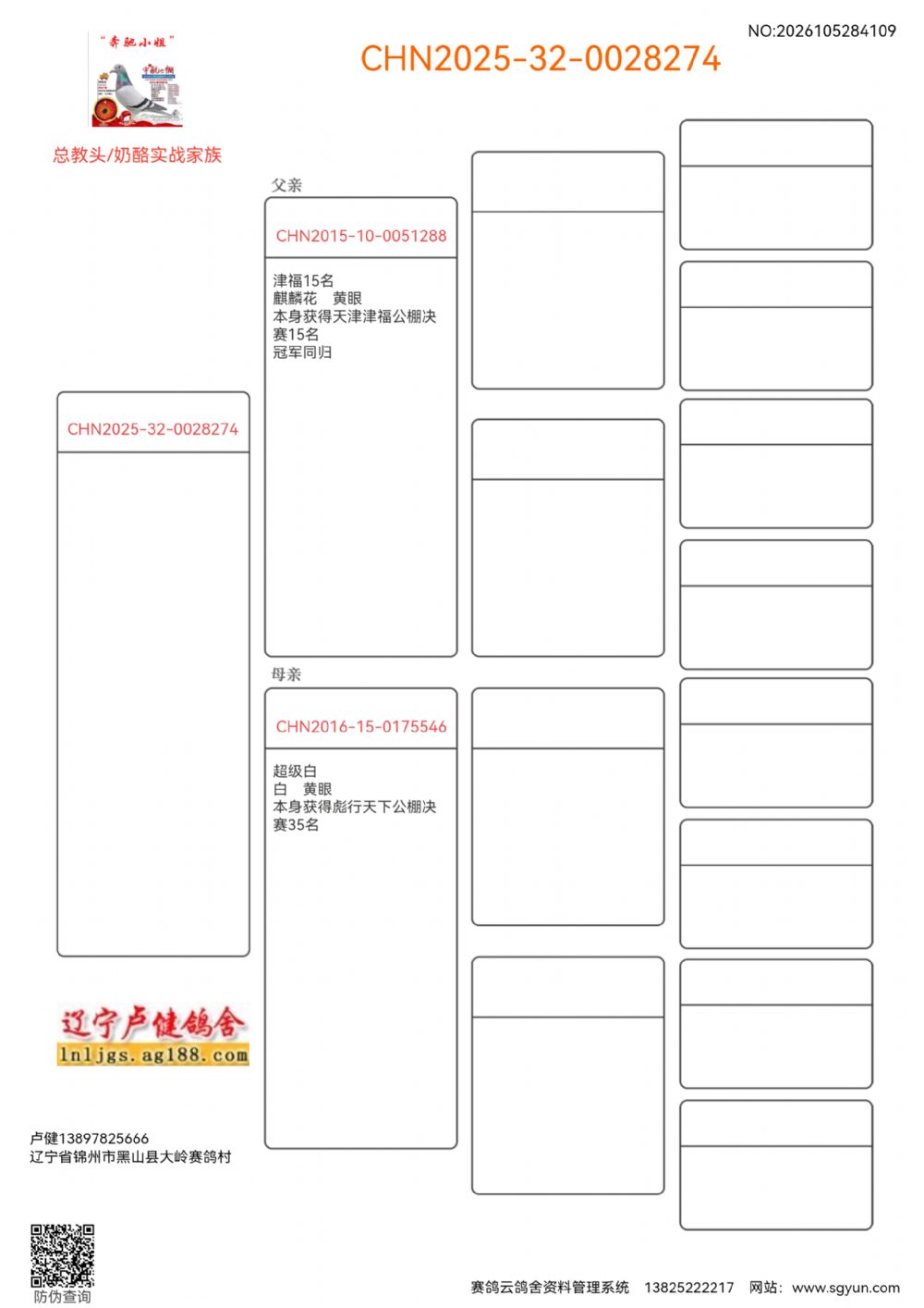 1645176 131.名轩鸽王十直子 X总教头四关冠军直女 ¥600元 1次