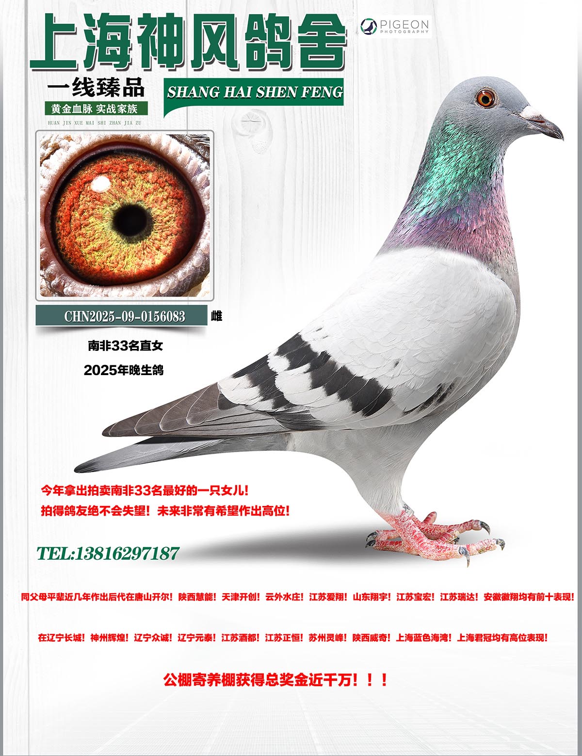 母亲:AU2017-T-33“金矿”本舍胡本头号中鸽“鸽王缔造者”直女!本身和全平辈后代西安威力。唐山开尔!山东翔宇!辽宁长城宁夏黄河。安徽万佛。江苏爱翔。浙江先锋。上海君冠。等等众多公棚都有高位获奖!