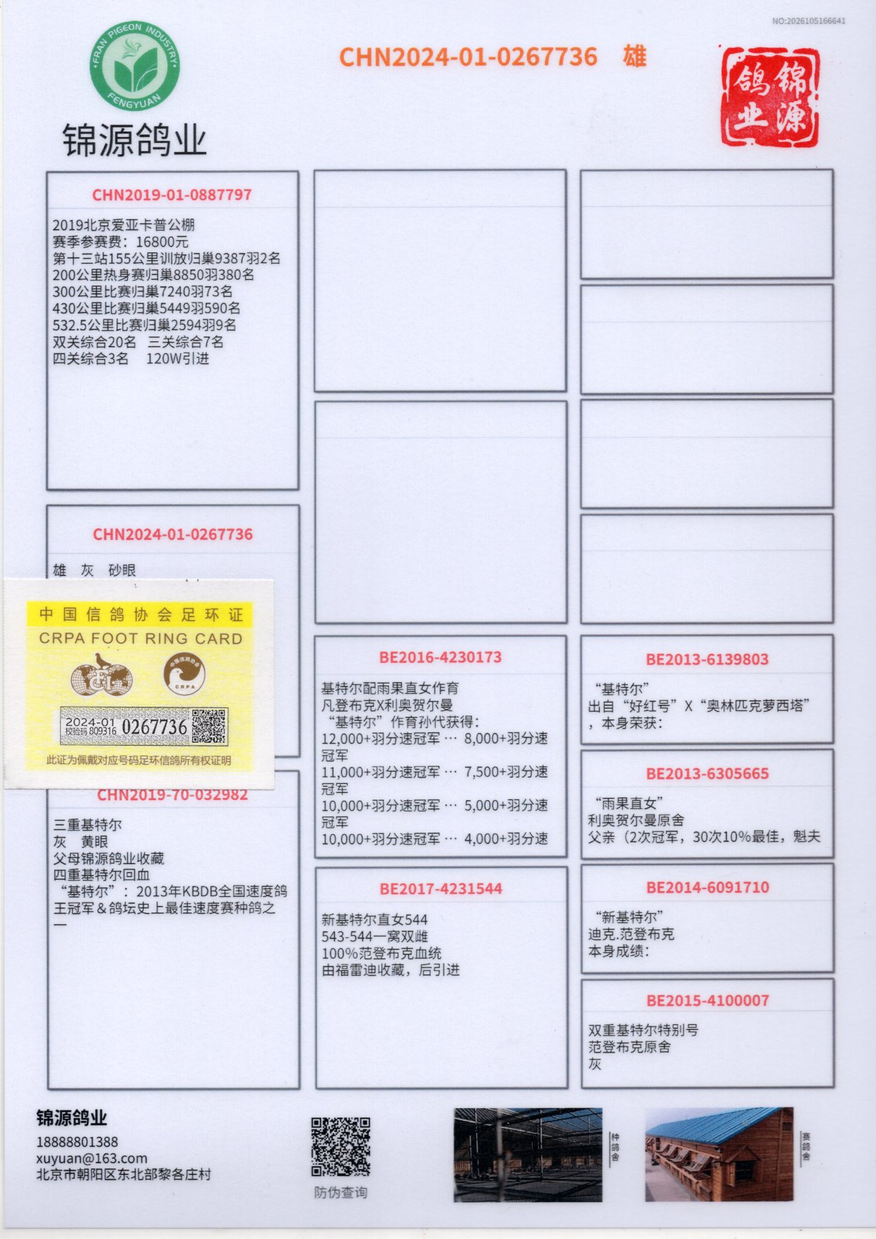 - 当前查看拍卖鸽:鸽王基特尔24-0267736雄