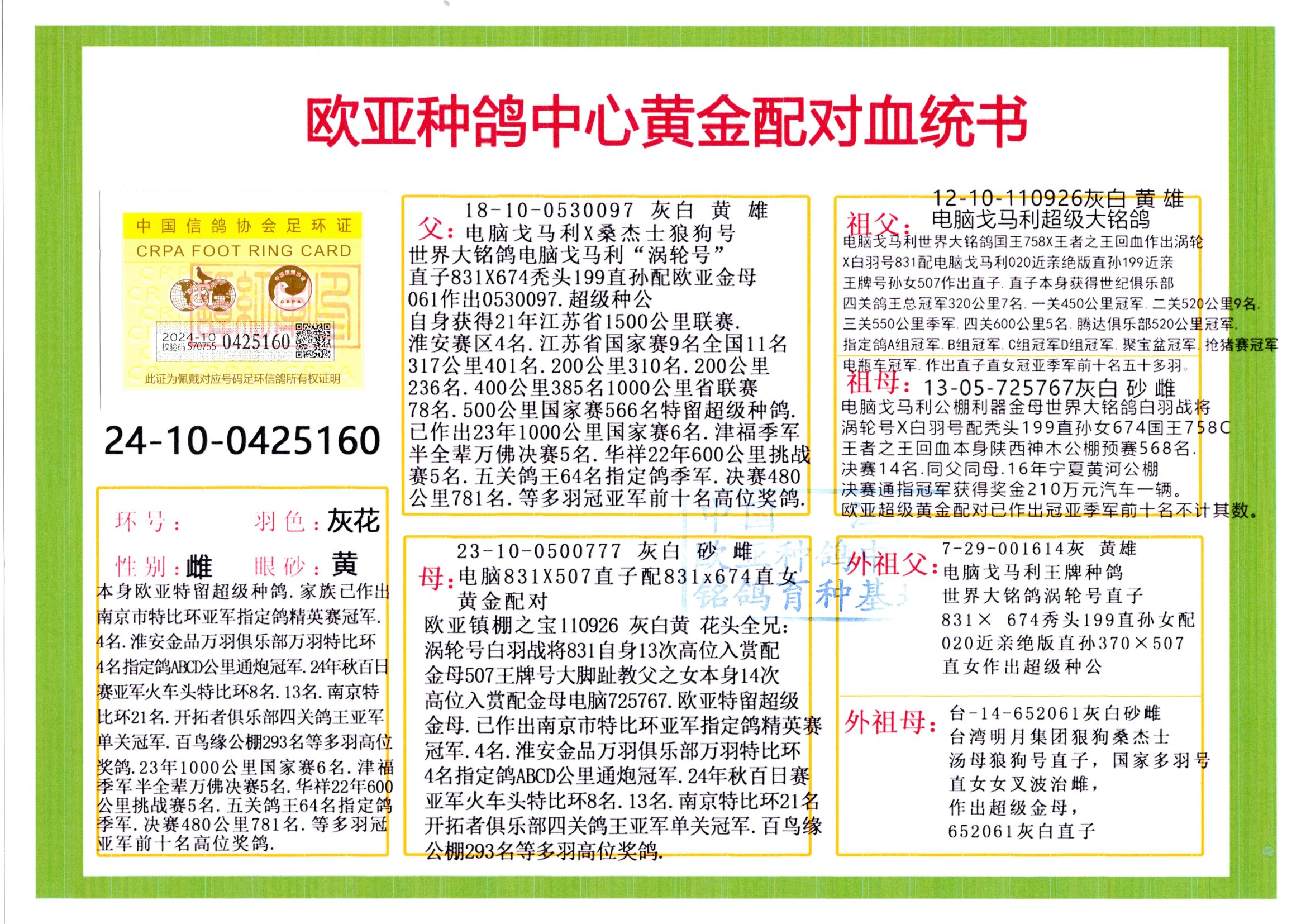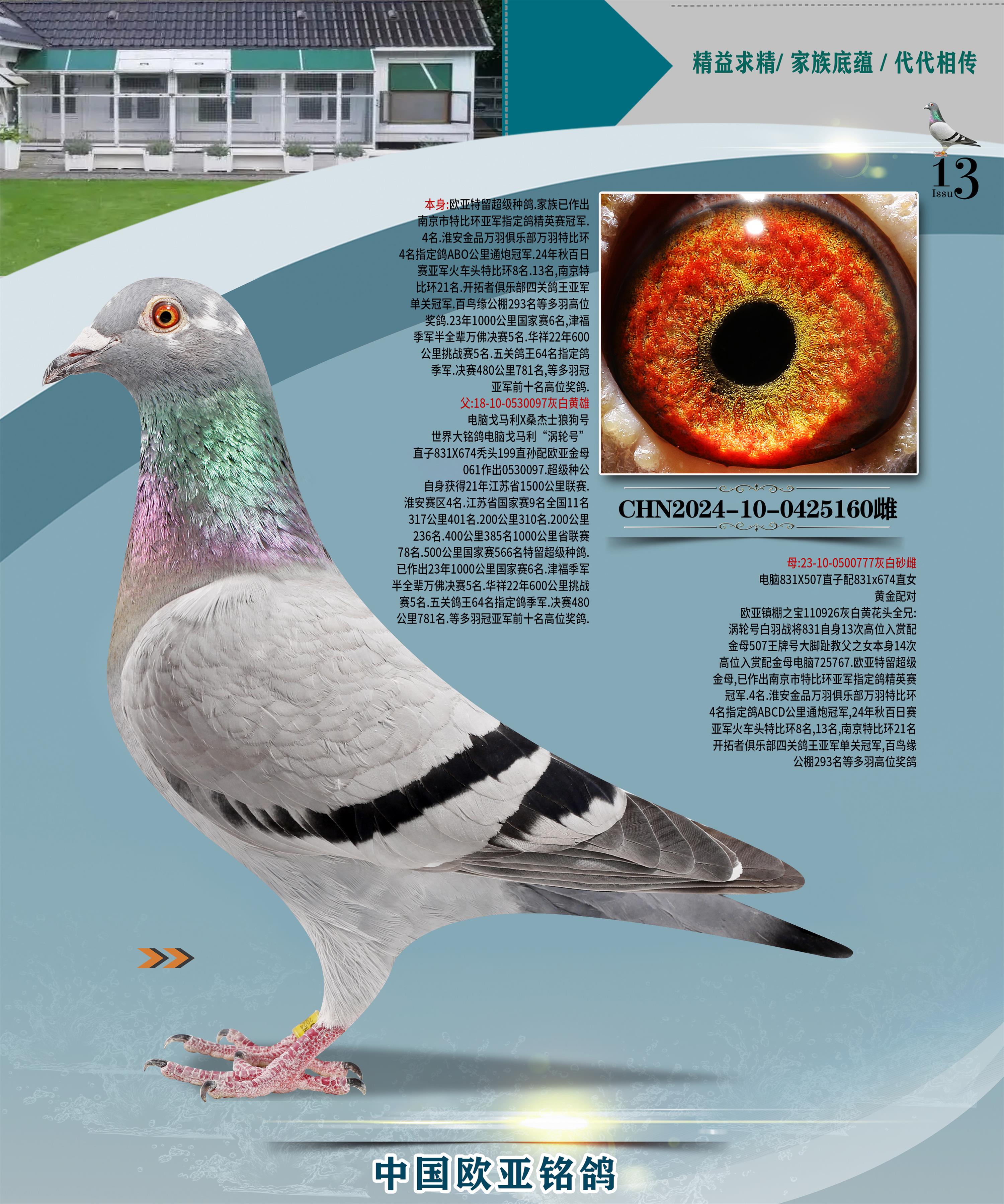 24年秋南京特比环欧亚荣获大团体冠军.小团体冠军551公里大特比13名.14名.16名.19名.20名.21名.24名.26名.27名.28名.42名.52名.54名.57名.65名.66名.68名.70名.71名.72名.74名.76名.80名.82名.83名.84名.85名.86名.90名.92名.110名.116名.121名.122名.128名.131名.158名.161名.164名.165名.166名.172名.174名.177名.182名.195名.196名.201名.205名.208名.210名.216名.253名.269名.275名.276名.294名.296名.299名,,24年秋云南天南铜都公棚决赛415名.天南铜都小棚决赛409名.云南玉活公棚决赛102名.490名.团体32名上笼二羽进二羽,天南铜都大棚506公里决赛445名。热烈祝贺河北省巨鹿县李兰生老师用欧亚泰山号血系连续十一年夺冠军,河北省国家赛冠军.全国季军等多次前十名高位,扬州王军王总用欧亚利奥24年春季获山东翔宇公棚决赛33名盖比53名。南京刘正龙刘总用欧亚盖比获得24年秋山东潍坊国际公棚决赛42名.精英赛30名.三关鸽王71名.决赛86名.加站赛16名.南京市特比环A组鸽王9名.B组鸽王5名.6名.C组鸽王5名.精英赛冠军4名.技能赛A组冠军4名.5名.秦淮区特比环荣获15名.46名.48名.87名。四川西昌徐亮徐总用欧亚利奥获得凉山州聚友决赛177名.第二关亚军双关鸽王19名.三关鸽王105名.云南豪庭公棚决赛603名。热烈祝贺24年四川重庆翔园鸽舍用欧亚泰山号荣获春季400公里冠军.秋季500公里冠军,河北王总用詹森X利奥获得千羽千翔公棚400公里冠军,广东蔡楷焕荣获24年秋爱好者 赛鸽俱乐部三关鸽王季军.一关420公里99名.二关450公里11名.三关520公里32名.单关季军.7名.12名,江西李卫兴荣获贵州红枫公棚8名.共翔俱乐部寄养棚四关综合鸽王30名.一关400公里78名.二关500公里55名.三关520公里37名.四关500公里57名.同父母获公棚18名.雷鸣获得武汉黄浦育翔中心冠军,四川陈文获得四川明鸿俱乐部300公里梦幻2名.3名.4名.9名.10名.13名.14名.15名.31名.34名.40名.41名.42名.43名.69名.71名.72名.73名.74名.94名.95名.97名.98名.99名.419公里决赛荣获总冠军7名.总共归巢9羽,四川徐亮获豪庭决赛603名,山西郑勇获得山西泰鑫公棚决赛255名詹森红狐,热烈祝贺马总获得开尔(飞跃队)决赛9名获奖金1310000万元.第一关52名,天津津福资赛180公里96名.获奖金429543万元,欧亚支持全国鸽友24年秋多人报喜 祝大家取得更好成绩,给欧亚报喜鸽友欧亚决定给每人赠送一羽超级种鸽。欧亚俱乐部特比环多关鸽王成绩:15年秋淮安特比环黑色星期一全会上笼9700多羽,当天无鸽归巢,第二天全会归巢357羽,本舍归巢158羽.前十名八羽.前一百名归巢57羽,16年春季获五关鸽王总冠军,总亚军四名.六名.七名.九名.十名.晶艺俱乐部520公里冠亚季军5名.6名.7名.9名.11名等,火车头冠军.季军6名.8名.9名.10名,16年秋晶艺俱乐部特比环520公里亚军.季军4名.6名.7名.9名,15年春南京白下特比环冠军.亚军.季军6名.7名.8名.9名.10名.指定鸽A B组获得冠军.亚军.季军4名.5名.,17年淮安特比环亚军.4名.5名.7名.8名.10名.六关鸽王总冠军.4名.6名.9名.10名,寄养棚宿迁刘总20羽特比环获冠军.季军.4名.7名.8名.9名等。18年荣获万羽特比环六关鸽王总冠军.总亚军.总季军.6名.8名.十名.单关四羽冠军.二羽亚军.四羽季军.前十名27羽。19年秋万羽特比环六关鸽王总亚军.总季军.5名.8名等,单关二羽冠军.三羽亚军.一羽季军前十名31羽。20年秋淮安市鸽会四关特比环大赛风雨无阻鸽王亚军.鸽王六名,金品俱乐部万羽特比环六关鸽王总冠军,总亚军.四名.五名.六名.七名.八名.十名.前二百名鸽王35羽,单关冠亚季军前十名四十多羽,火车头五关鸽王季军.六名.八名.前二百名鸽王十七羽。20年春荣获淮安五区一市四关鸽王总冠军.亚军.四名.八名.九名。21年秋荣获金品万羽特比环大赛六关鸽王总亚军.总季军.四名.七名.九名.十名.单关冠亚军季军前十名三十多羽。火车头协会鸽王六名.七名.十名.单关前十名十七羽。22年秋荣获鸽王总冠军.总亚军.5名.7名.8名.9名.11名.单关冠亚季军前十名三十多羽,第一关单关前二百名四十多羽,第二关前二百名三十多羽,第三关前二百名四十多羽,第四关前二百名四十多羽,第五关前一百名53羽。23年秋荣获鸽王季军.五名.八名.十名.13名.17名.20名.27名等多羽鸽王.单关前十名二十多羽。公棚.寄养棚部分成绩:16年秋宁夏黄河公棚总冠军电脑戈马力指定通炮冠军,17年送八羽参赛获得鸽王八名进奖四名,支持韩总荣获八名。支持鸽友荣获宁夏中卫公棚决赛总冠军.精英赛冠军,支持18年宁夏黄河公棚决赛冠军詹森X泰山。安徽鼎博寄养棚院内外四关鸽王总冠军.鸽王十七名.三十七名同窝,鸽王39名.42名.58名.67名。18年山东公棚预赛冠军.决赛65名.送八羽进奖五羽.指定获奔驰汽车一辆。支持鸽友获得云南蓝云公棚冠军.盖比X佛卡门。支持鸽友荣获云南银集公棚决赛冠军 詹森427X520血系 速度赛6700羽冠军。17年荣获金马俱乐部寄养棚四关鸽王总冠军.季军.六名.八名.第一关冠军.亚军.季军四名.七名.十一名.金牌教练奖。支持鸽友18年北京费翔公棚预赛九名电脑X桑杰士,支持鸽友荣获陕西威力公棚决赛11名.内蒙古临河寄养棚四关鸽王六名.詹森配泰山,支持河北王总用欧亚詹森427配胡本喜获20年秋开尔青年棚季军。云南东荣公棚16年预赛冠军.决赛77名.17年决赛12名.詹森红狐X泰山,17年平安公棚决赛4名 詹森427。欧亚获得21年金母寄养棚第一关四名.第二关5名.第三关5名.6名.7名.10名.三关鸽王总冠军,四关鸽王14名.十羽鸽王。支持河