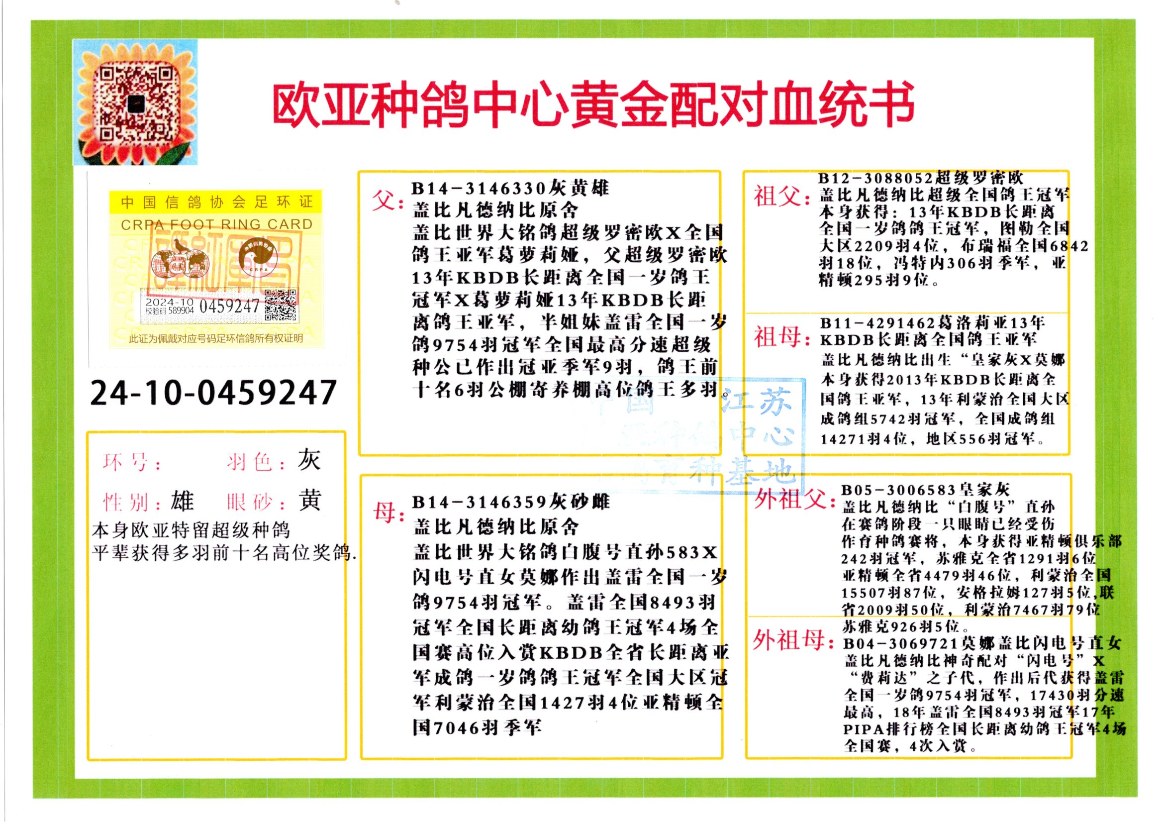 24年秋南京特比环欧亚荣获大团体冠军.小团体冠军551公里大特比13名.14名.16名.19名.20名.21名.24名.26名.27名.28名.42名.52名.54名.57名.65名.66名.68名.70名.71名.72名.74名.76名.80名.82名.83名.84名.85名.86名.90名.92名.110名.116名.121名.122名.128名.131名.158名.161名.164名.165名.166名.172名.174名.177名.182名.195名.196名.201名.205名.208名.210名.216名.253名.269名.275名.276名.294名.296名.299名,,24年秋云南天南铜都公棚决赛415名.天南铜都小棚决赛409名.云南玉活公棚决赛102名.490名.团体32名上笼二羽进二羽,天南铜都大棚506公里决赛445名。热烈祝贺河北省巨鹿县李兰生老师用欧亚泰山号血系连续十一年夺冠军,河北省国家赛冠军.全国季军等多次前十名高位,扬州王军王总用欧亚利奥24年春季获山东翔宇公棚决赛33名盖比53名。南京刘正龙刘总用欧亚盖比获得24年秋山东潍坊国际公棚决赛42名.精英赛30名.三关鸽王71名.决赛86名.加站赛16名.南京市特比环A组鸽王9名.B组鸽王5名.6名.C组鸽王5名.精英赛冠军4名.技能赛A组冠军4名.5名.秦淮区特比环荣获15名.46名.48名.87名。四川西昌徐亮徐总用欧亚利奥获得凉山州聚友决赛177名.第二关亚军双关鸽王19名.三关鸽王105名.云南豪庭公棚决赛603名。热烈祝贺24年四川重庆翔园鸽舍用欧亚泰山号荣获春季400公里冠军.秋季500公里冠军,河北王总用詹森X利奥获得千羽千翔公棚400公里冠军,广东蔡楷焕荣获24年秋爱好者 赛鸽俱乐部三关鸽王季军.一关420公里99名.二关450公里11名.三关520公里32名.单关季军.7名.12名,江西李卫兴荣获贵州红枫公棚8名.共翔俱乐部寄养棚四关综合鸽王30名.一关400公里78名.二关500公里55名.三关520公里37名.四关500公里57名.同父母获公棚18名.雷鸣获得武汉黄浦育翔中心冠军,四川陈文获得四川明鸿俱乐部300公里梦幻2名.3名.4名.9名.10名.13名.14名.15名.31名.34名.40名.41名.42名.43名.69名.71名.72名.73名.74名.94名.95名.97名.98名.99名.419公里决赛荣获总冠军7名.总共归巢9羽,四川徐亮获豪庭决赛603名,山西郑勇获得山西泰鑫公棚决赛255名詹森红狐,热烈祝贺马总获得开尔(飞跃队)决赛9名获奖金1310000万元.第一关52名,天津津福资赛180公里96名.获奖金429543万元,欧亚支持全国鸽友24年秋多人报喜 祝大家取得更好成绩,给欧亚报喜鸽友欧亚决定给每人赠送一羽超级种鸽。欧亚俱乐部特比环多关鸽王成绩:15年秋淮安特比环黑色星期一全会上笼9700多羽,当天无鸽归巢,第二天全会归巢357羽,本舍归巢158羽.前十名八羽.前一百名归巢57羽,16年春季获五关鸽王总冠军,总亚军四名.六名.七名.九名.十名.晶艺俱乐部520公里冠亚季军5名.6名.7名.9名.11名等,火车头冠军.季军6名.8名.9名.10名,16年秋晶艺俱乐部特比环520公里亚军.季军4名.6名.7名.9名,15年春南京白下特比环冠军.亚军.季军6名.7名.8名.9名.10名.指定鸽A B组获得冠军.亚军.季军4名.5名.,17年淮安特比环亚军.4名.5名.7名.8名.10名.六关鸽王总冠军.4名.6名.9名.10名,寄养棚宿迁刘总20羽特比环获冠军.季军.4名.7名.8名.9名等。18年荣获万羽特比环六关鸽王总冠军.总亚军.总季军.6名.8名.十名.单关四羽冠军.二羽亚军.四羽季军.前十名27羽。19年秋万羽特比环六关鸽王总亚军.总季军.5名.8名等,单关二羽冠军.三羽亚军.一羽季军前十名31羽。20年秋淮安市鸽会四关特比环大赛风雨无阻鸽王亚军.鸽王六名,金品俱乐部万羽特比环六关鸽王总冠军,总亚军.四名.五名.六名.七名.八名.十名.前二百名鸽王35羽,单关冠亚季军前十名四十多羽,火车头五关鸽王季军.六名.八名.前二百名鸽王十七羽。20年春荣获淮安五区一市四关鸽王总冠军.亚军.四名.八名.九名。21年秋荣获金品万羽特比环大赛六关鸽王总亚军.总季军.四名.七名.九名.十名.单关冠亚军季军前十名三十多羽。火车头协会鸽王六名.七名.十名.单关前十名十七羽。22年秋荣获鸽王总冠军.总亚军.5名.7名.8名.9名.11名.单关冠亚季军前十名三十多羽,第一关单关前二百名四十多羽,第二关前二百名三十多羽,第三关前二百名四十多羽,第四关前二百名四十多羽,第五关前一百名53羽。23年秋荣获鸽王季军.五名.八名.十名.13名.17名.20名.27名等多羽鸽王.单关前十名二十多羽。公棚.寄养棚部分成绩:16年秋宁夏黄河公棚总冠军电脑戈马力指定通炮冠军,17年送八羽参赛获得鸽王八名进奖四名,支持韩总荣获八名。支持鸽友荣获宁夏中卫公棚决赛总冠军.精英赛冠军,支持18年宁夏黄河公棚决赛冠军詹森X泰山。安徽鼎博寄养棚院内外四关鸽王总冠军.鸽王十七名.三十七名同窝,鸽王39名.42名.58名.67名。18年山东公棚预赛冠军.决赛65名.送八羽进奖五羽.指定获奔驰汽车一辆。支持鸽友获得云南蓝云公棚冠军.盖比X佛卡门。支持鸽友荣获云南银集公棚决赛冠军 詹森427X520血系 速度赛6700羽冠军。17年荣获金马俱乐部寄养棚四关鸽王总冠军.季军.六名.八名.第一关冠军.亚军.季军四名.七名.十一名.金牌教练奖。支持鸽友18年北京费翔公棚预赛九名电脑X桑杰士,支持鸽友荣获陕西威力公棚决赛11名.内蒙古临河寄养棚四关鸽王六名.詹森配泰山,支持河北王总用欧亚詹森427配胡本喜获20年秋开尔青年棚季军。云南东荣公棚16年预赛冠军.决赛77名.17年决赛12名.詹森红狐X泰山,17年平安公棚决赛4名 詹森427。欧亚获得21年金母寄养棚第一关四名.第二关5名.第三关5名.6名.7名.10名.三关鸽王总冠军,四关鸽王14名.十羽鸽王。支持河