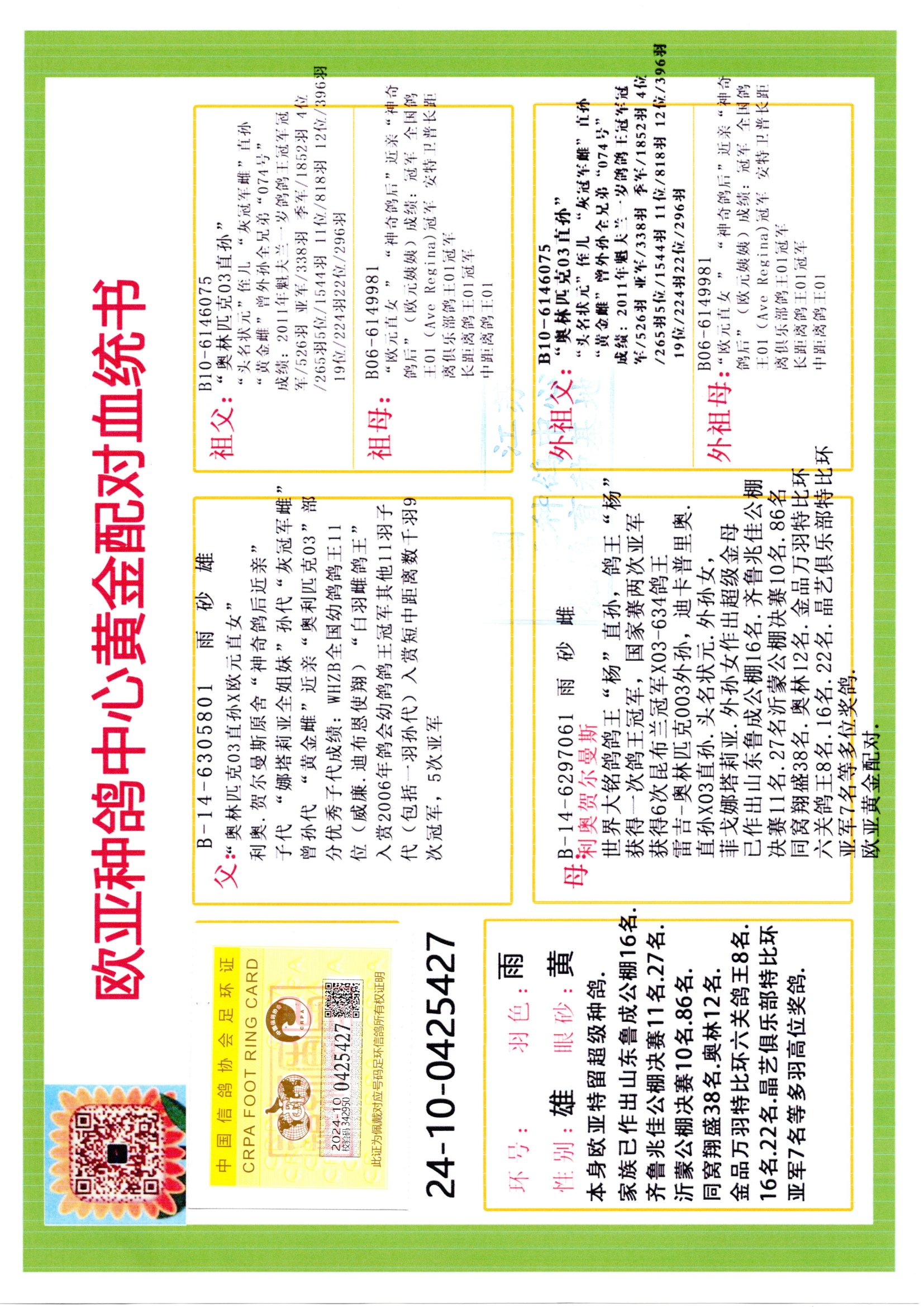 24年秋南京特比环欧亚荣获大团体冠军.小团体冠军551公里大特比13名.14名.16名.19名.20名.21名.24名.26名.27名.28名.42名.52名.54名.57名.65名.66名.68名.70名.71名.72名.74名.76名.80名.82名.83名.84名.85名.86名.90名.92名.110名.116名.121名.122名.128名.131名.158名.161名.164名.165名.166名.172名.174名.177名.182名.195名.196名.201名.205名.208名.210名.216名.253名.269名.275名.276名.294名.296名.299名,,24年秋云南天南铜都公棚决赛415名.天南铜都小棚决赛409名.云南玉活公棚决赛102名.490名.团体32名上笼二羽进二羽,天南铜都大棚506公里决赛445名。热烈祝贺河北省巨鹿县李兰生老师用欧亚泰山号血系连续十一年夺冠军,河北省国家赛冠军.全国季军等多次前十名高位,扬州王军王总用欧亚利奥24年春季获山东翔宇公棚决赛33名盖比53名。南京刘正龙刘总用欧亚盖比获得24年秋山东潍坊国际公棚决赛42名.精英赛30名.三关鸽王71名.决赛86名.加站赛16名.南京市特比环A组鸽王9名.B组鸽王5名.6名.C组鸽王5名.精英赛冠军4名.技能赛A组冠军4名.5名.秦淮区特比环荣获15名.46名.48名.87名。四川西昌徐亮徐总用欧亚利奥获得凉山州聚友决赛177名.第二关亚军双关鸽王19名.三关鸽王105名.云南豪庭公棚决赛603名。热烈祝贺24年四川重庆翔园鸽舍用欧亚泰山号荣获春季400公里冠军.秋季500公里冠军,河北王总用詹森X利奥获得千羽千翔公棚400公里冠军,广东蔡楷焕荣获24年秋爱好者 赛鸽俱乐部三关鸽王季军.一关420公里99名.二关450公里11名.三关520公里32名.单关季军.7名.12名,江西李卫兴荣获贵州红枫公棚8名.共翔俱乐部寄养棚四关综合鸽王30名.一关400公里78名.二关500公里55名.三关520公里37名.四关500公里57名.同父母获公棚18名.雷鸣获得武汉黄浦育翔中心冠军,四川陈文获得四川明鸿俱乐部300公里梦幻2名.3名.4名.9名.10名.13名.14名.15名.31名.34名.40名.41名.42名.43名.69名.71名.72名.73名.74名.94名.95名.97名.98名.99名.419公里决赛荣获总冠军7名.总共归巢9羽,四川徐亮获豪庭决赛603名,山西郑勇获得山西泰鑫公棚决赛255名詹森红狐,热烈祝贺马总获得开尔(飞跃队)决赛9名获奖金1310000万元.第一关52名,天津津福资赛180公里96名.获奖金429543万元,欧亚支持全国鸽友24年秋多人报喜 祝大家取得更好成绩,给欧亚报喜鸽友欧亚决定给每人赠送一羽超级种鸽。欧亚俱乐部特比环多关鸽王成绩:15年秋淮安特比环黑色星期一全会上笼9700多羽,当天无鸽归巢,第二天全会归巢357羽,本舍归巢158羽.前十名八羽.前一百名归巢57羽,16年春季获五关鸽王总冠军,总亚军四名.六名.七名.九名.十名.晶艺俱乐部520公里冠亚季军5名.6名.7名.9名.11名等,火车头冠军.季军6名.8名.9名.10名,16年秋晶艺俱乐部特比环520公里亚军.季军4名.6名.7名.9名,15年春南京白下特比环冠军.亚军.季军6名.7名.8名.9名.10名.指定鸽A B组获得冠军.亚军.季军4名.5名.,17年淮安特比环亚军.4名.5名.7名.8名.10名.六关鸽王总冠军.4名.6名.9名.10名,寄养棚宿迁刘总20羽特比环获冠军.季军.4名.7名.8名.9名等。18年荣获万羽特比环六关鸽王总冠军.总亚军.总季军.6名.8名.十名.单关四羽冠军.二羽亚军.四羽季军.前十名27羽。19年秋万羽特比环六关鸽王总亚军.总季军.5名.8名等,单关二羽冠军.三羽亚军.一羽季军前十名31羽。20年秋淮安市鸽会四关特比环大赛风雨无阻鸽王亚军.鸽王六名,金品俱乐部万羽特比环六关鸽王总冠军,总亚军.四名.五名.六名.七名.八名.十名.前二百名鸽王35羽,单关冠亚季军前十名四十多羽,火车头五关鸽王季军.六名.八名.前二百名鸽王十七羽。20年春荣获淮安五区一市四关鸽王总冠军.亚军.四名.八名.九名。21年秋荣获金品万羽特比环大赛六关鸽王总亚军.总季军.四名.七名.九名.十名.单关冠亚军季军前十名三十多羽。火车头协会鸽王六名.七名.十名.单关前十名十七羽。22年秋荣获鸽王总冠军.总亚军.5名.7名.8名.9名.11名.单关冠亚季军前十名三十多羽,第一关单关前二百名四十多羽,第二关前二百名三十多羽,第三关前二百名四十多羽,第四关前二百名四十多羽,第五关前一百名53羽。23年秋荣获鸽王季军.五名.八名.十名.13名.17名.20名.27名等多羽鸽王.单关前十名二十多羽。公棚.寄养棚部分成绩:16年秋宁夏黄河公棚总冠军电脑戈马力指定通炮冠军,17年送八羽参赛获得鸽王八名进奖四名,支持韩总荣获八名。支持鸽友荣获宁夏中卫公棚决赛总冠军.精英赛冠军,支持18年宁夏黄河公棚决赛冠军詹森X泰山。安徽鼎博寄养棚院内外四关鸽王总冠军.鸽王十七名.三十七名同窝,鸽王39名.42名.58名.67名。18年山东公棚预赛冠军.决赛65名.送八羽进奖五羽.指定获奔驰汽车一辆。支持鸽友获得云南蓝云公棚冠军.盖比X佛卡门。支持鸽友荣获云南银集公棚决赛冠军 詹森427X520血系 速度赛6700羽冠军。17年荣获金马俱乐部寄养棚四关鸽王总冠军.季军.六名.八名.第一关冠军.亚军.季军四名.七名.十一名.金牌教练奖。支持鸽友18年北京费翔公棚预赛九名电脑X桑杰士,支持鸽友荣获陕西威力公棚决赛11名.内蒙古临河寄养棚四关鸽王六名.詹森配泰山,支持河北王总用欧亚詹森427配胡本喜获20年秋开尔青年棚季军。云南东荣公棚16年预赛冠军.决赛77名.17年决赛12名.詹森红狐X泰山,17年平安公棚决赛4名 詹森427。欧亚获得21年金母寄养棚第一关四名.第二关5名.第三关5名.6名.7名.10名.三关鸽王总冠军,四关鸽王14名.十羽鸽王。支持河