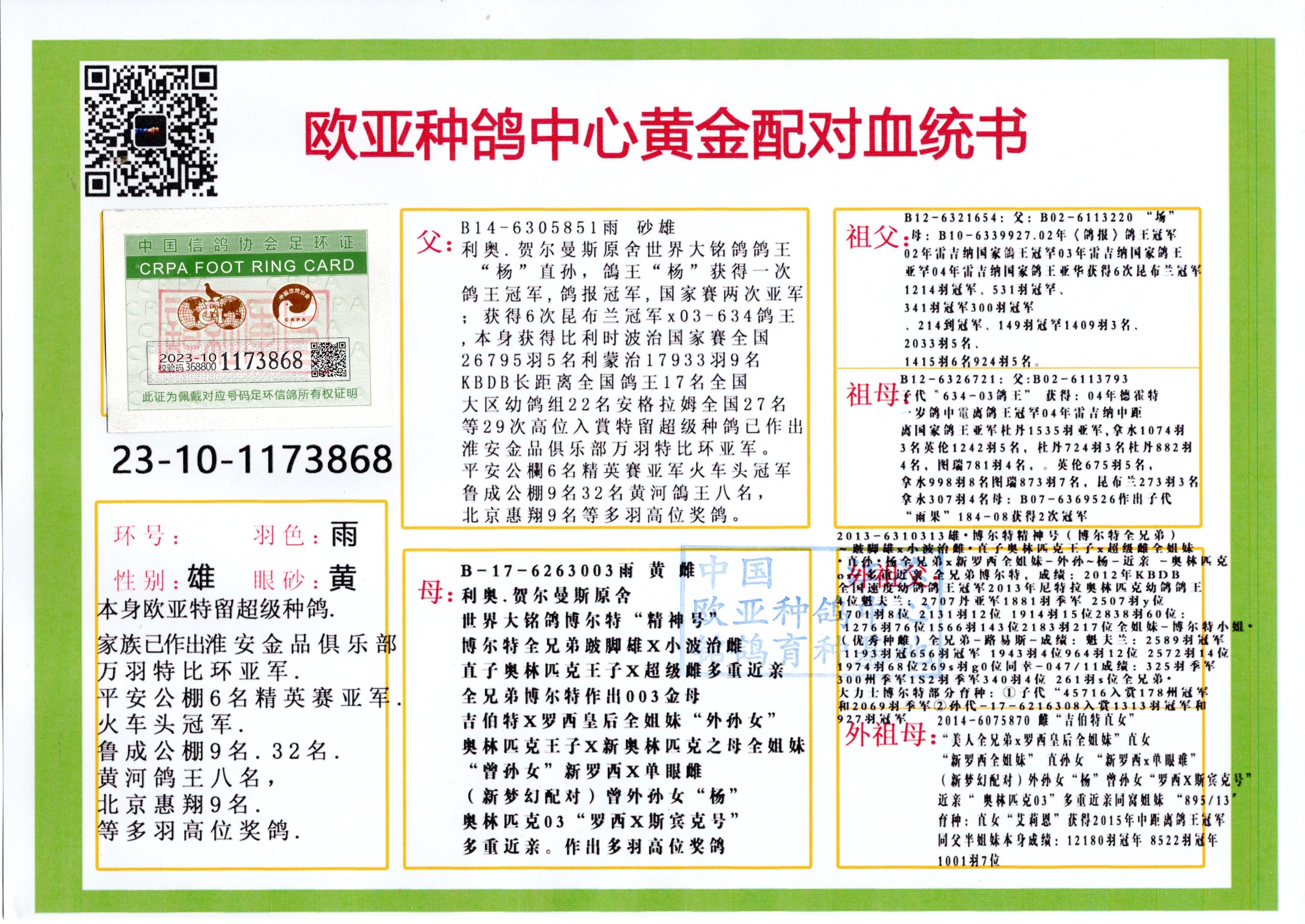 | 1646050 | 利奥原舍03近亲868X鸽王杨金母713 | ¥500元 | 0次 |