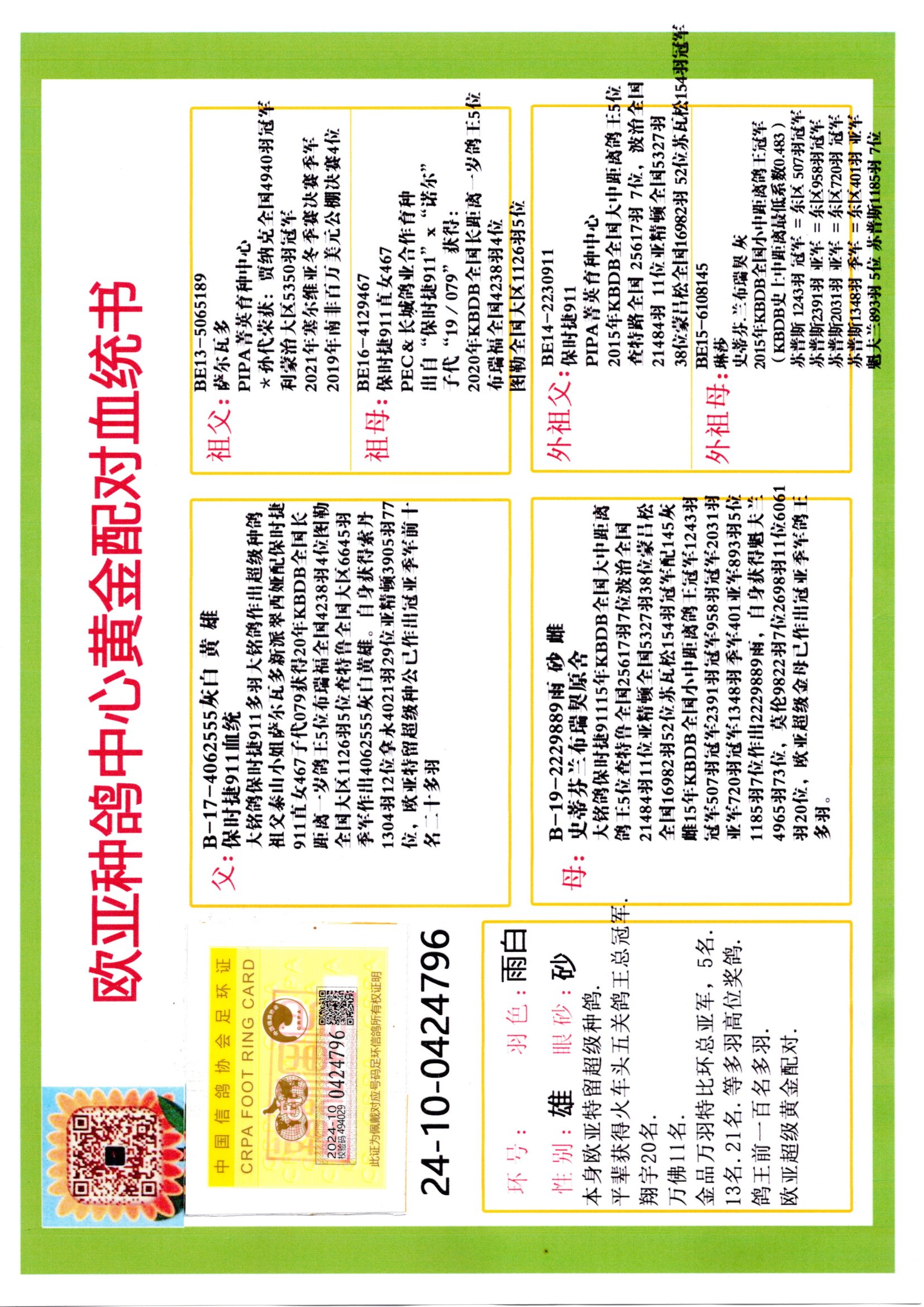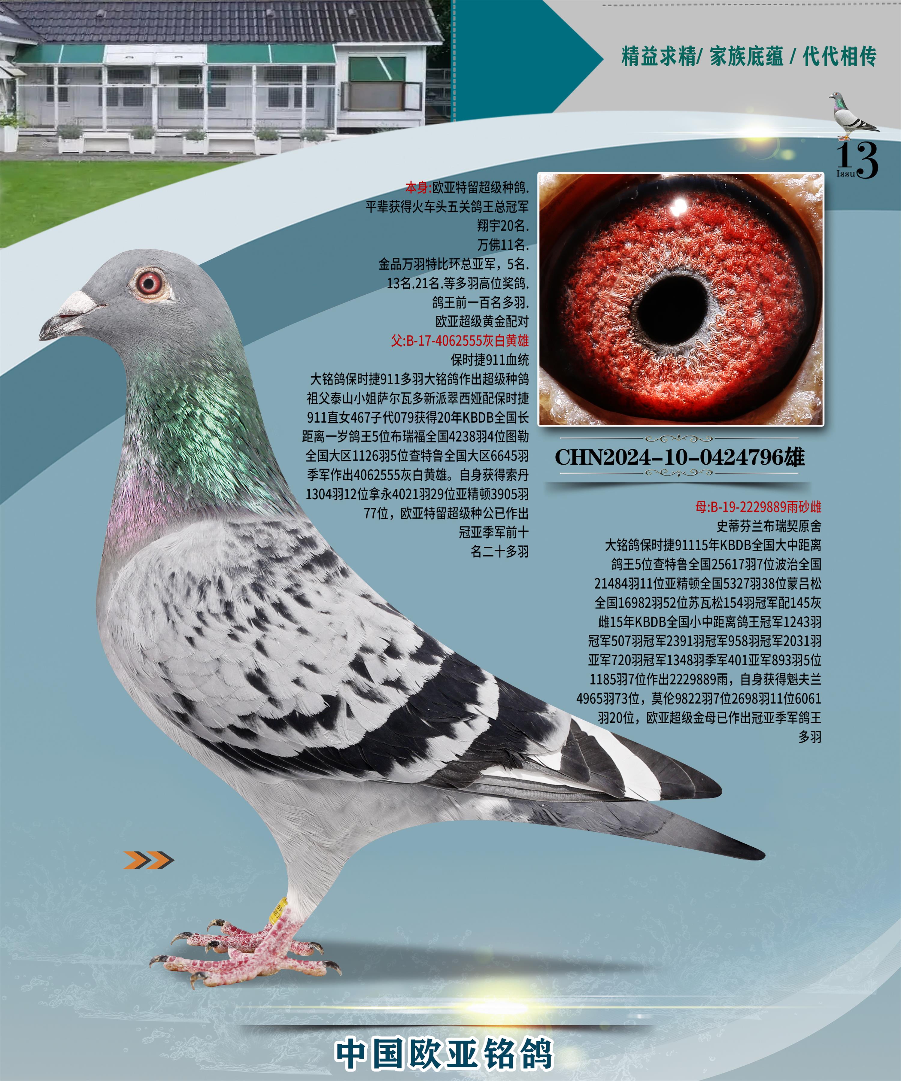 24年秋南京特比环欧亚荣获大团体冠军.小团体冠军551公里大特比13名.14名.16名.19名.20名.21名.24名.26名.27名.28名.42名.52名.54名.57名.65名.66名.68名.70名.71名.72名.74名.76名.80名.82名.83名.84名.85名.86名.90名.92名.110名.116名.121名.122名.128名.131名.158名.161名.164名.165名.166名.172名.174名.177名.182名.195名.196名.201名.205名.208名.210名.216名.253名.269名.275名.276名.294名.296名.299名,,24年秋云南天南铜都公棚决赛415名.天南铜都小棚决赛409名.云南玉活公棚决赛102名.490名.团体32名上笼二羽进二羽,天南铜都大棚506公里决赛445名。热烈祝贺河北省巨鹿县李兰生老师用欧亚泰山号血系连续十一年夺冠军,河北省国家赛冠军.全国季军等多次前十名高位,扬州王军王总用欧亚利奥24年春季获山东翔宇公棚决赛33名盖比53名。南京刘正龙刘总用欧亚盖比获得24年秋山东潍坊国际公棚决赛42名.精英赛30名.三关鸽王71名.决赛86名.加站赛16名.南京市特比环A组鸽王9名.B组鸽王5名.6名.C组鸽王5名.精英赛冠军4名.技能赛A组冠军4名.5名.秦淮区特比环荣获15名.46名.48名.87名。四川西昌徐亮徐总用欧亚利奥获得凉山州聚友决赛177名.第二关亚军双关鸽王19名.三关鸽王105名.云南豪庭公棚决赛603名。热烈祝贺24年四川重庆翔园鸽舍用欧亚泰山号荣获春季400公里冠军.秋季500公里冠军,河北王总用詹森X利奥获得千羽千翔公棚400公里冠军,广东蔡楷焕荣获24年秋爱好者 赛鸽俱乐部三关鸽王季军.一关420公里99名.二关450公里11名.三关520公里32名.单关季军.7名.12名,江西李卫兴荣获贵州红枫公棚8名.共翔俱乐部寄养棚四关综合鸽王30名.一关400公里78名.二关500公里55名.三关520公里37名.四关500公里57名.同父母获公棚18名.雷鸣获得武汉黄浦育翔中心冠军,四川陈文获得四川明鸿俱乐部300公里梦幻2名.3名.4名.9名.10名.13名.14名.15名.31名.34名.40名.41名.42名.43名.69名.71名.72名.73名.74名.94名.95名.97名.98名.99名.419公里决赛荣获总冠军7名.总共归巢9羽,四川徐亮获豪庭决赛603名,山西郑勇获得山西泰鑫公棚决赛255名詹森红狐,热烈祝贺马总获得开尔(飞跃队)决赛9名获奖金1310000万元.第一关52名,天津津福资赛180公里96名.获奖金429543万元,欧亚支持全国鸽友24年秋多人报喜 祝大家取得更好成绩,给欧亚报喜鸽友欧亚决定给每人赠送一羽超级种鸽。欧亚俱乐部特比环多关鸽王成绩:15年秋淮安特比环黑色星期一全会上笼9700多羽,当天无鸽归巢,第二天全会归巢357羽,本舍归巢158羽.前十名八羽.前一百名归巢57羽,16年春季获五关鸽王总冠军,总亚军四名.六名.七名.九名.十名.晶艺俱乐部520公里冠亚季军5名.6名.7名.9名.11名等,火车头冠军.季军6名.8名.9名.10名,16年秋晶艺俱乐部特比环520公里亚军.季军4名.6名.7名.9名,15年春南京白下特比环冠军.亚军.季军6名.7名.8名.9名.10名.指定鸽A B组获得冠军.亚军.季军4名.5名.,17年淮安特比环亚军.4名.5名.7名.8名.10名.六关鸽王总冠军.4名.6名.9名.10名,寄养棚宿迁刘总20羽特比环获冠军.季军.4名.7名.8名.9名等。18年荣获万羽特比环六关鸽王总冠军.总亚军.总季军.6名.8名.十名.单关四羽冠军.二羽亚军.四羽季军.前十名27羽。19年秋万羽特比环六关鸽王总亚军.总季军.5名.8名等,单关二羽冠军.三羽亚军.一羽季军前十名31羽。20年秋淮安市鸽会四关特比环大赛风雨无阻鸽王亚军.鸽王六名,金品俱乐部万羽特比环六关鸽王总冠军,总亚军.四名.五名.六名.七名.八名.十名.前二百名鸽王35羽,单关冠亚季军前十名四十多羽,火车头五关鸽王季军.六名.八名.前二百名鸽王十七羽。20年春荣获淮安五区一市四关鸽王总冠军.亚军.四名.八名.九名。21年秋荣获金品万羽特比环大赛六关鸽王总亚军.总季军.四名.七名.九名.十名.单关冠亚军季军前十名三十多羽。火车头协会鸽王六名.七名.十名.单关前十名十七羽。22年秋荣获鸽王总冠军.总亚军.5名.7名.8名.9名.11名.单关冠亚季军前十名三十多羽,第一关单关前二百名四十多羽,第二关前二百名三十多羽,第三关前二百名四十多羽,第四关前二百名四十多羽,第五关前一百名53羽。23年秋荣获鸽王季军.五名.八名.十名.13名.17名.20名.27名等多羽鸽王.单关前十名二十多羽。公棚.寄养棚部分成绩:16年秋宁夏黄河公棚总冠军电脑戈马力指定通炮冠军,17年送八羽参赛获得鸽王八名进奖四名,支持韩总荣获八名。支持鸽友荣获宁夏中卫公棚决赛总冠军.精英赛冠军,支持18年宁夏黄河公棚决赛冠军詹森X泰山。安徽鼎博寄养棚院内外四关鸽王总冠军.鸽王十七名.三十七名同窝,鸽王39名.42名.58名.67名。18年山东公棚预赛冠军.决赛65名.送八羽进奖五羽.指定获奔驰汽车一辆。支持鸽友获得云南蓝云公棚冠军.盖比X佛卡门。支持鸽友荣获云南银集公棚决赛冠军 詹森427X520血系 速度赛6700羽冠军。17年荣获金马俱乐部寄养棚四关鸽王总冠军.季军.六名.八名.第一关冠军.亚军.季军四名.七名.十一名.金牌教练奖。支持鸽友18年北京费翔公棚预赛九名电脑X桑杰士,支持鸽友荣获陕西威力公棚决赛11名.内蒙古临河寄养棚四关鸽王六名.詹森配泰山,支持河北王总用欧亚詹森427配胡本喜获20年秋开尔青年棚季军。云南东荣公棚16年预赛冠军.决赛77名.17年决赛12名.詹森红狐X泰山,17年平安公棚决赛4名 詹森427。欧亚获得21年金母寄养棚第一关四名.第二关5名.第三关5名.6名.7名.10名.三关鸽王总冠军,四关鸽王14名.十羽鸽王。支持河