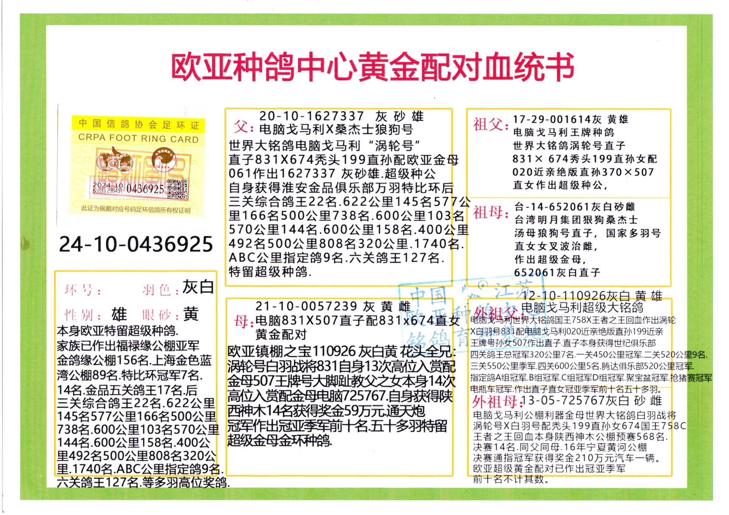 24年秋南京特比环欧亚荣获大团体冠军.小团体冠军551公里大特比13名.14名.16名.19名.20名.21名.24名.26名.27名.28名.42名.52名.54名.57名.65名.66名.68名.70名.71名.72名.74名.76名.80名.82名.83名.84名.85名.86名.90名.92名.110名.116名.121名.122名.128名.131名.158名.161名.164名.165名.166名.172名.174名.177名.182名.195名.196名.201名.205名.208名.210名.216名.253名.269名.275名.276名.294名.296名.299名,,24年秋云南天南铜都公棚决赛415名.天南铜都小棚决赛409名.云南玉活公棚决赛102名.490名.团体32名上笼二羽进二羽,天南铜都大棚506公里决赛445名。热烈祝贺河北省巨鹿县李兰生老师用欧亚泰山号血系连续十一年夺冠军,河北省国家赛冠军.全国季军等多次前十名高位,扬州王军王总用欧亚利奥24年春季获山东翔宇公棚决赛33名盖比53名。南京刘正龙刘总用欧亚盖比获得24年秋山东潍坊国际公棚决赛42名.精英赛30名.三关鸽王71名.决赛86名.加站赛16名.南京市特比环A组鸽王9名.B组鸽王5名.6名.C组鸽王5名.精英赛冠军4名.技能赛A组冠军4名.5名.秦淮区特比环荣获15名.46名.48名.87名。四川西昌徐亮徐总用欧亚利奥获得凉山州聚友决赛177名.第二关亚军双关鸽王19名.三关鸽王105名.云南豪庭公棚决赛603名。热烈祝贺24年四川重庆翔园鸽舍用欧亚泰山号荣获春季400公里冠军.秋季500公里冠军,河北王总用詹森X利奥获得千羽千翔公棚400公里冠军,广东蔡楷焕荣获24年秋爱好者 赛鸽俱乐部三关鸽王季军.一关420公里99名.二关450公里11名.三关520公里32名.单关季军.7名.12名,江西李卫兴荣获贵州红枫公棚8名.共翔俱乐部寄养棚四关综合鸽王30名.一关400公里78名.二关500公里55名.三关520公里37名.四关500公里57名.同父母获公棚18名.雷鸣获得武汉黄浦育翔中心冠军,四川陈文获得四川明鸿俱乐部300公里梦幻2名.3名.4名.9名.10名.13名.14名.15名.31名.34名.40名.41名.42名.43名.69名.71名.72名.73名.74名.94名.95名.97名.98名.99名.419公里决赛荣获总冠军7名.总共归巢9羽,四川徐亮获豪庭决赛603名,山西郑勇获得山西泰鑫公棚决赛255名詹森红狐,热烈祝贺马总获得开尔(飞跃队)决赛9名获奖金1310000万元.第一关52名,天津津福资赛180公里96名.获奖金429543万元,欧亚支持全国鸽友24年秋多人报喜 祝大家取得更好成绩,给欧亚报喜鸽友欧亚决定给每人赠送一羽超级种鸽。欧亚俱乐部特比环多关鸽王成绩:15年秋淮安特比环黑色星期一全会上笼9700多羽,当天无鸽归巢,第二天全会归巢357羽,本舍归巢158羽.前十名八羽.前一百名归巢57羽,16年春季获五关鸽王总冠军,总亚军四名.六名.七名.九名.十名.晶艺俱乐部520公里冠亚季军5名.6名.7名.9名.11名等,火车头冠军.季军6名.8名.9名.10名,16年秋晶艺俱乐部特比环520公里亚军.季军4名.6名.7名.9名,15年春南京白下特比环冠军.亚军.季军6名.7名.8名.9名.10名.指定鸽A B组获得冠军.亚军.季军4名.5名.,17年淮安特比环亚军.4名.5名.7名.8名.10名.六关鸽王总冠军.4名.6名.9名.10名,寄养棚宿迁刘总20羽特比环获冠军.季军.4名.7名.8名.9名等。18年荣获万羽特比环六关鸽王总冠军.总亚军.总季军.6名.8名.十名.单关四羽冠军.二羽亚军.四羽季军.前十名27羽。19年秋万羽特比环六关鸽王总亚军.总季军.5名.8名等,单关二羽冠军.三羽亚军.一羽季军前十名31羽。20年秋淮安市鸽会四关特比环大赛风雨无阻鸽王亚军.鸽王六名,金品俱乐部万羽特比环六关鸽王总冠军,总亚军.四名.五名.六名.七名.八名.十名.前二百名鸽王35羽,单关冠亚季军前十名四十多羽,火车头五关鸽王季军.六名.八名.前二百名鸽王十七羽。20年春荣获淮安五区一市四关鸽王总冠军.亚军.四名.八名.九名。21年秋荣获金品万羽特比环大赛六关鸽王总亚军.总季军.四名.七名.九名.十名.单关冠亚军季军前十名三十多羽。火车头协会鸽王六名.七名.十名.单关前十名十七羽。22年秋荣获鸽王总冠军.总亚军.5名.7名.8名.9名.11名.单关冠亚季军前十名三十多羽,第一关单关前二百名四十多羽,第二关前二百名三十多羽,第三关前二百名四十多羽,第四关前二百名四十多羽,第五关前一百名53羽。23年秋荣获鸽王季军.五名.八名.十名.13名.17名.20名.27名等多羽鸽王.单关前十名二十多羽。公棚.寄养棚部分成绩:16年秋宁夏黄河公棚总冠军电脑戈马力指定通炮冠军,17年送八羽参赛获得鸽王八名进奖四名,支持韩总荣获八名。支持鸽友荣获宁夏中卫公棚决赛总冠军.精英赛冠军,支持18年宁夏黄河公棚决赛冠军詹森X泰山。安徽鼎博寄养棚院内外四关鸽王总冠军.鸽王十七名.三十七名同窝,鸽王39名.42名.58名.67名。18年山东公棚预赛冠军.决赛65名.送八羽进奖五羽.指定获奔驰汽车一辆。支持鸽友获得云南蓝云公棚冠军.盖比X佛卡门。支持鸽友荣获云南银集公棚决赛冠军 詹森427X520血系 速度赛6700羽冠军。17年荣获金马俱乐部寄养棚四关鸽王总冠军.季军.六名.八名.第一关冠军.亚军.季军四名.七名.十一名.金牌教练奖。支持鸽友18年北京费翔公棚预赛九名电脑X桑杰士,支持鸽友荣获陕西威力公棚决赛11名.内蒙古临河寄养棚四关鸽王六名.詹森配泰山,支持河北王总用欧亚詹森427配胡本喜获20年秋开尔青年棚季军。云南东荣公棚16年预赛冠军.决赛77名.17年决赛12名.詹森红狐X泰山,17年平安公棚决赛4名 詹森427。欧亚获得21年金母寄养棚第一关四名.第二关5名.第三关5名.6名.7名.10名.三关鸽王总冠军,四关鸽王14名.十羽鸽王。支持河