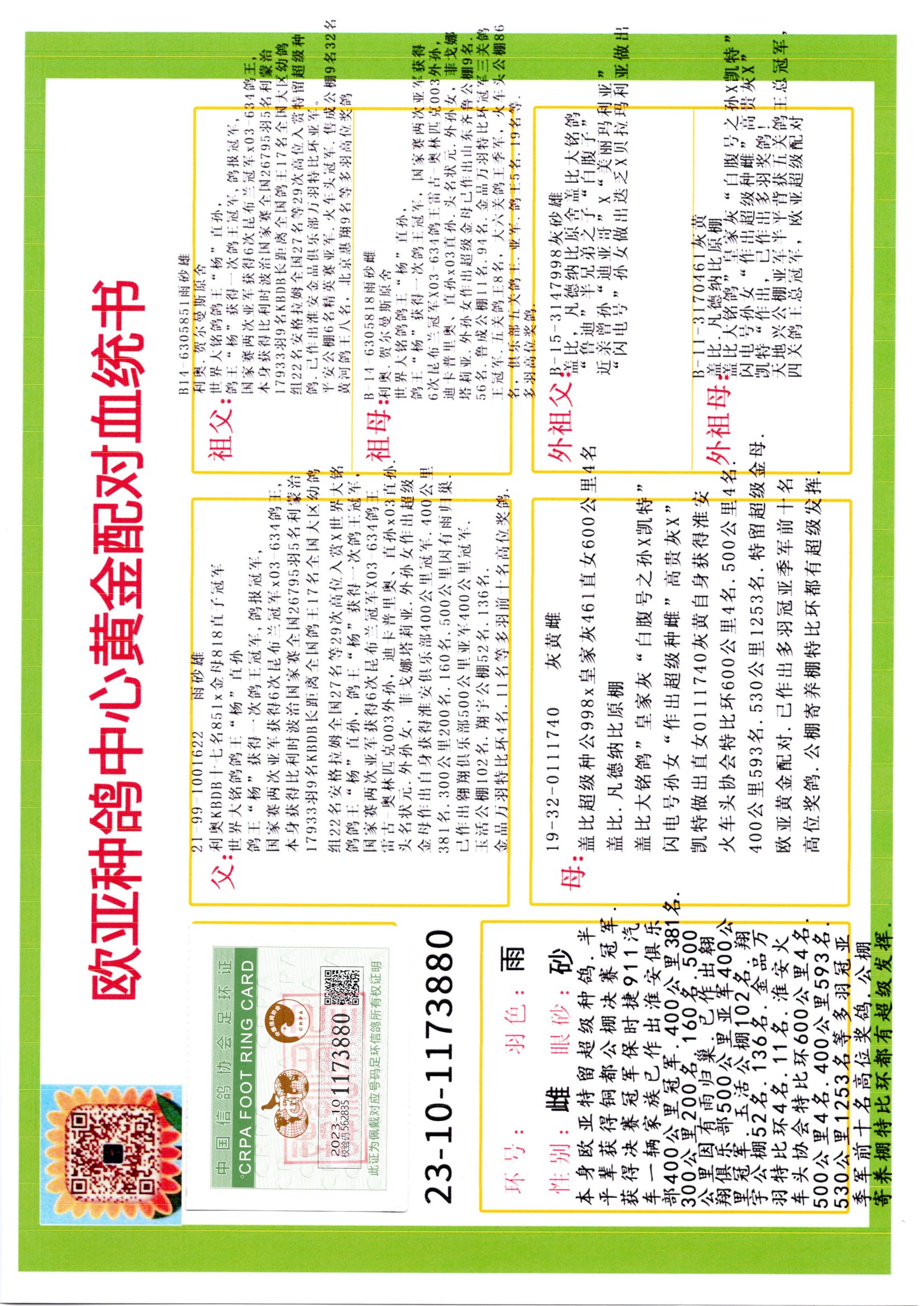 24年秋南京特比环欧亚荣获大团体冠军.小团体冠军551公里大特比13名.14名.16名.19名.20名.21名.24名.26名.27名.28名.42名.52名.54名.57名.65名.66名.68名.70名.71名.72名.74名.76名.80名.82名.83名.84名.85名.86名.90名.92名.110名.116名.121名.122名.128名.131名.158名.161名.164名.165名.166名.172名.174名.177名.182名.195名.196名.201名.205名.208名.210名.216名.253名.269名.275名.276名.294名.296名.299名,,24年秋云南天南铜都公棚决赛415名.天南铜都小棚决赛409名.云南玉活公棚决赛102名.490名.团体32名上笼二羽进二羽,天南铜都大棚506公里决赛445名。热烈祝贺河北省巨鹿县李兰生老师用欧亚泰山号血系连续十一年夺冠军,河北省国家赛冠军.全国季军等多次前十名高位,扬州王军王总用欧亚利奥24年春季获山东翔宇公棚决赛33名盖比53名。南京刘正龙刘总用欧亚盖比获得24年秋山东潍坊国际公棚决赛42名.精英赛30名.三关鸽王71名.决赛86名.加站赛16名.南京市特比环A组鸽王9名.B组鸽王5名.6名.C组鸽王5名.精英赛冠军4名.技能赛A组冠军4名.5名.秦淮区特比环荣获15名.46名.48名.87名。四川西昌徐亮徐总用欧亚利奥获得凉山州聚友决赛177名.第二关亚军双关鸽王19名.三关鸽王105名.云南豪庭公棚决赛603名。热烈祝贺24年四川重庆翔园鸽舍用欧亚泰山号荣获春季400公里冠军.秋季500公里冠军,河北王总用詹森X利奥获得千羽千翔公棚400公里冠军,广东蔡楷焕荣获24年秋爱好者 赛鸽俱乐部三关鸽王季军.一关420公里99名.二关450公里11名.三关520公里32名.单关季军.7名.12名,江西李卫兴荣获贵州红枫公棚8名.共翔俱乐部寄养棚四关综合鸽王30名.一关400公里78名.二关500公里55名.三关520公里37名.四关500公里57名.同父母获公棚18名.雷鸣获得武汉黄浦育翔中心冠军,四川陈文获得四川明鸿俱乐部300公里梦幻2名.3名.4名.9名.10名.13名.14名.15名.31名.34名.40名.41名.42名.43名.69名.71名.72名.73名.74名.94名.95名.97名.98名.99名.419公里决赛荣获总冠军7名.总共归巢9羽,四川徐亮获豪庭决赛603名,山西郑勇获得山西泰鑫公棚决赛255名詹森红狐,热烈祝贺马总获得开尔(飞跃队)决赛9名获奖金1310000万元.第一关52名,天津津福资赛180公里96名.获奖金429543万元,欧亚支持全国鸽友24年秋多人报喜 祝大家取得更好成绩,给欧亚报喜鸽友欧亚决定给每人赠送一羽超级种鸽。欧亚俱乐部特比环多关鸽王成绩:15年秋淮安特比环黑色星期一全会上笼9700多羽,当天无鸽归巢,第二天全会归巢357羽,本舍归巢158羽.前十名八羽.前一百名归巢57羽,16年春季获五关鸽王总冠军,总亚军四名.六名.七名.九名.十名.晶艺俱乐部520公里冠亚季军5名.6名.7名.9名.11名等,火车头冠军.季军6名.8名.9名.10名,16年秋晶艺俱乐部特比环520公里亚军.季军4名.6名.7名.9名,15年春南京白下特比环冠军.亚军.季军6名.7名.8名.9名.10名.指定鸽A B组获得冠军.亚军.季军4名.5名.,17年淮安特比环亚军.4名.5名.7名.8名.10名.六关鸽王总冠军.4名.6名.9名.10名,寄养棚宿迁刘总20羽特比环获冠军.季军.4名.7名.8名.9名等。18年荣获万羽特比环六关鸽王总冠军.总亚军.总季军.6名.8名.十名.单关四羽冠军.二羽亚军.四羽季军.前十名27羽。19年秋万羽特比环六关鸽王总亚军.总季军.5名.8名等,单关二羽冠军.三羽亚军.一羽季军前十名31羽。20年秋淮安市鸽会四关特比环大赛风雨无阻鸽王亚军.鸽王六名,金品俱乐部万羽特比环六关鸽王总冠军,总亚军.四名.五名.六名.七名.八名.十名.前二百名鸽王35羽,单关冠亚季军前十名四十多羽,火车头五关鸽王季军.六名.八名.前二百名鸽王十七羽。20年春荣获淮安五区一市四关鸽王总冠军.亚军.四名.八名.九名。21年秋荣获金品万羽特比环大赛六关鸽王总亚军.总季军.四名.七名.九名.十名.单关冠亚军季军前十名三十多羽。火车头协会鸽王六名.七名.十名.单关前十名十七羽。22年秋荣获鸽王总冠军.总亚军.5名.7名.8名.9名.11名.单关冠亚季军前十名三十多羽,第一关单关前二百名四十多羽,第二关前二百名三十多羽,第三关前二百名四十多羽,第四关前二百名四十多羽,第五关前一百名53羽。23年秋荣获鸽王季军.五名.八名.十名.13名.17名.20名.27名等多羽鸽王.单关前十名二十多羽。公棚.寄养棚部分成绩:16年秋宁夏黄河公棚总冠军电脑戈马力指定通炮冠军,17年送八羽参赛获得鸽王八名进奖四名,支持韩总荣获八名。支持鸽友荣获宁夏中卫公棚决赛总冠军.精英赛冠军,支持18年宁夏黄河公棚决赛冠军詹森X泰山。安徽鼎博寄养棚院内外四关鸽王总冠军.鸽王十七名.三十七名同窝,鸽王39名.42名.58名.67名。18年山东公棚预赛冠军.决赛65名.送八羽进奖五羽.指定获奔驰汽车一辆。支持鸽友获得云南蓝云公棚冠军.盖比X佛卡门。支持鸽友荣获云南银集公棚决赛冠军 詹森427X520血系 速度赛6700羽冠军。17年荣获金马俱乐部寄养棚四关鸽王总冠军.季军.六名.八名.第一关冠军.亚军.季军四名.七名.十一名.金牌教练奖。支持鸽友18年北京费翔公棚预赛九名电脑X桑杰士,支持鸽友荣获陕西威力公棚决赛11名.内蒙古临河寄养棚四关鸽王六名.詹森配泰山,支持河北王总用欧亚詹森427配胡本喜获20年秋开尔青年棚季军。云南东荣公棚16年预赛冠军.决赛77名.17年决赛12名.詹森红狐X泰山,17年平安公棚决赛4名 詹森427。欧亚获得21年金母寄养棚第一关四名.第二关5名.第三关5名.6名.7名.10名.三关鸽王总冠军,四关鸽王14名.十羽鸽王。支持河
