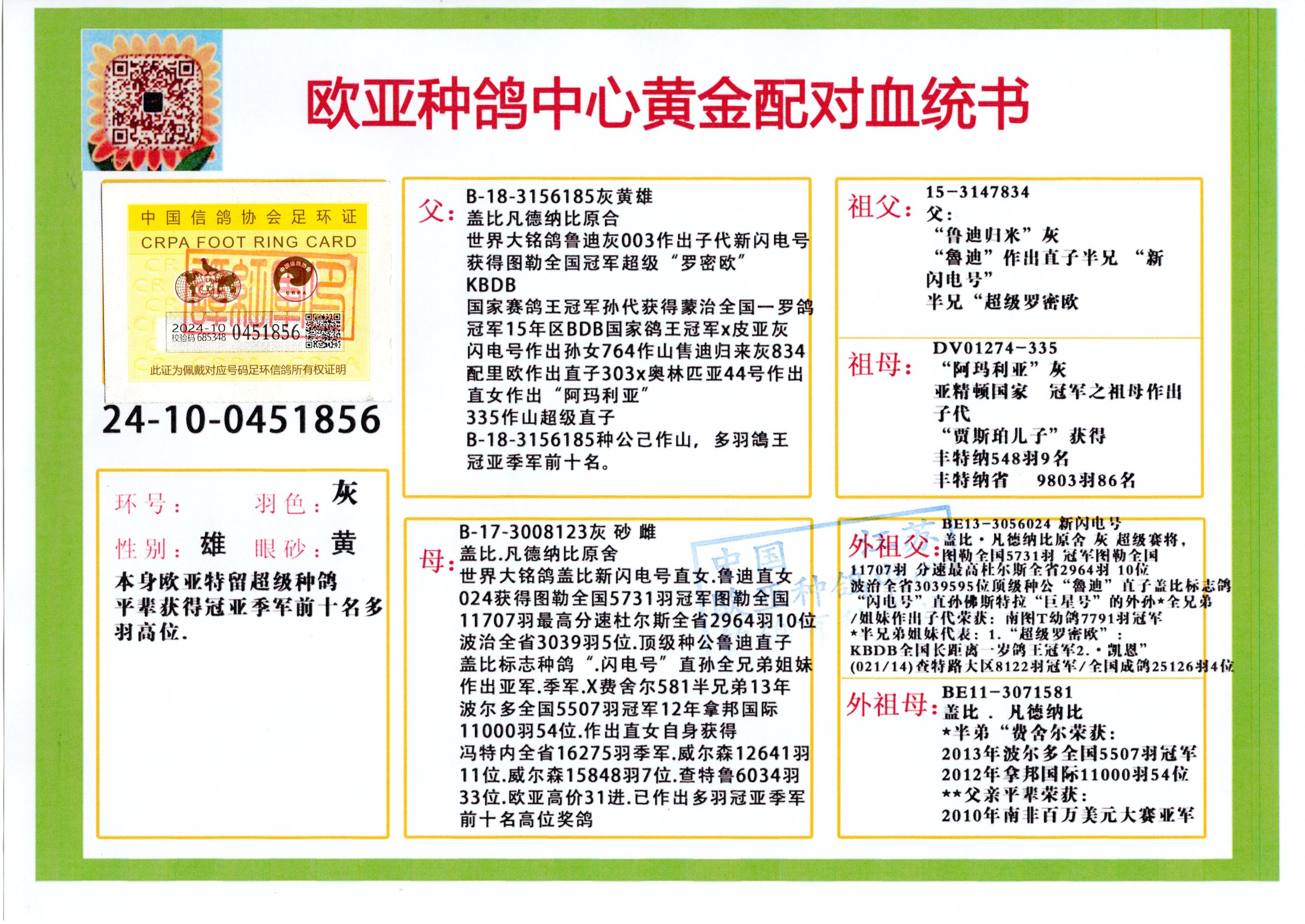 24年秋南京特比环欧亚荣获大团体冠军.小团体冠军551公里大特比13名.14名.16名.19名.20名.21名.24名.26名.27名.28名.42名.52名.54名.57名.65名.66名.68名.70名.71名.72名.74名.76名.80名.82名.83名.84名.85名.86名.90名.92名.110名.116名.121名.122名.128名.131名.158名.161名.164名.165名.166名.172名.174名.177名.182名.195名.196名.201名.205名.208名.210名.216名.253名.269名.275名.276名.294名.296名.299名,,24年秋云南天南铜都公棚决赛415名.天南铜都小棚决赛409名.云南玉活公棚决赛102名.490名.团体32名上笼二羽进二羽,天南铜都大棚506公里决赛445名。热烈祝贺河北省巨鹿县李兰生老师用欧亚泰山号血系连续十一年夺冠军,河北省国家赛冠军.全国季军等多次前十名高位,扬州王军王总用欧亚利奥24年春季获山东翔宇公棚决赛33名盖比53名。南京刘正龙刘总用欧亚盖比获得24年秋山东潍坊国际公棚决赛42名.精英赛30名.三关鸽王71名.决赛86名.加站赛16名.南京市特比环A组鸽王9名.B组鸽王5名.6名.C组鸽王5名.精英赛冠军4名.技能赛A组冠军4名.5名.秦淮区特比环荣获15名.46名.48名.87名。四川西昌徐亮徐总用欧亚利奥获得凉山州聚友决赛177名.第二关亚军双关鸽王19名.三关鸽王105名.云南豪庭公棚决赛603名。热烈祝贺24年四川重庆翔园鸽舍用欧亚泰山号荣获春季400公里冠军.秋季500公里冠军,河北王总用詹森X利奥获得千羽千翔公棚400公里冠军,广东蔡楷焕荣获24年秋爱好者 赛鸽俱乐部三关鸽王季军.一关420公里99名.二关450公里11名.三关520公里32名.单关季军.7名.12名,江西李卫兴荣获贵州红枫公棚8名.共翔俱乐部寄养棚四关综合鸽王30名.一关400公里78名.二关500公里55名.三关520公里37名.四关500公里57名.同父母获公棚18名.雷鸣获得武汉黄浦育翔中心冠军,四川陈文获得四川明鸿俱乐部300公里梦幻2名.3名.4名.9名.10名.13名.14名.15名.31名.34名.40名.41名.42名.43名.69名.71名.72名.73名.74名.94名.95名.97名.98名.99名.419公里决赛荣获总冠军7名.总共归巢9羽,四川徐亮获豪庭决赛603名,山西郑勇获得山西泰鑫公棚决赛255名詹森红狐,热烈祝贺马总获得开尔(飞跃队)决赛9名获奖金1310000万元.第一关52名,天津津福资赛180公里96名.获奖金429543万元,欧亚支持全国鸽友24年秋多人报喜 祝大家取得更好成绩,给欧亚报喜鸽友欧亚决定给每人赠送一羽超级种鸽。欧亚俱乐部特比环多关鸽王成绩:15年秋淮安特比环黑色星期一全会上笼9700多羽,当天无鸽归巢,第二天全会归巢357羽,本舍归巢158羽.前十名八羽.前一百名归巢57羽,16年春季获五关鸽王总冠军,总亚军四名.六名.七名.九名.十名.晶艺俱乐部520公里冠亚季军5名.6名.7名.9名.11名等,火车头冠军.季军6名.8名.9名.10名,16年秋晶艺俱乐部特比环520公里亚军.季军4名.6名.7名.9名,15年春南京白下特比环冠军.亚军.季军6名.7名.8名.9名.10名.指定鸽A B组获得冠军.亚军.季军4名.5名.,17年淮安特比环亚军.4名.5名.7名.8名.10名.六关鸽王总冠军.4名.6名.9名.10名,寄养棚宿迁刘总20羽特比环获冠军.季军.4名.7名.8名.9名等。18年荣获万羽特比环六关鸽王总冠军.总亚军.总季军.6名.8名.十名.单关四羽冠军.二羽亚军.四羽季军.前十名27羽。19年秋万羽特比环六关鸽王总亚军.总季军.5名.8名等,单关二羽冠军.三羽亚军.一羽季军前十名31羽。20年秋淮安市鸽会四关特比环大赛风雨无阻鸽王亚军.鸽王六名,金品俱乐部万羽特比环六关鸽王总冠军,总亚军.四名.五名.六名.七名.八名.十名.前二百名鸽王35羽,单关冠亚季军前十名四十多羽,火车头五关鸽王季军.六名.八名.前二百名鸽王十七羽。20年春荣获淮安五区一市四关鸽王总冠军.亚军.四名.八名.九名。21年秋荣获金品万羽特比环大赛六关鸽王总亚军.总季军.四名.七名.九名.十名.单关冠亚军季军前十名三十多羽。火车头协会鸽王六名.七名.十名.单关前十名十七羽。22年秋荣获鸽王总冠军.总亚军.5名.7名.8名.9名.11名.单关冠亚季军前十名三十多羽,第一关单关前二百名四十多羽,第二关前二百名三十多羽,第三关前二百名四十多羽,第四关前二百名四十多羽,第五关前一百名53羽。23年秋荣获鸽王季军.五名.八名.十名.13名.17名.20名.27名等多羽鸽王.单关前十名二十多羽。公棚.寄养棚部分成绩:16年秋宁夏黄河公棚总冠军电脑戈马力指定通炮冠军,17年送八羽参赛获得鸽王八名进奖四名,支持韩总荣获八名。支持鸽友荣获宁夏中卫公棚决赛总冠军.精英赛冠军,支持18年宁夏黄河公棚决赛冠军詹森X泰山。安徽鼎博寄养棚院内外四关鸽王总冠军.鸽王十七名.三十七名同窝,鸽王39名.42名.58名.67名。18年山东公棚预赛冠军.决赛65名.送八羽进奖五羽.指定获奔驰汽车一辆。支持鸽友获得云南蓝云公棚冠军.盖比X佛卡门。支持鸽友荣获云南银集公棚决赛冠军 詹森427X520血系 速度赛6700羽冠军。17年荣获金马俱乐部寄养棚四关鸽王总冠军.季军.六名.八名.第一关冠军.亚军.季军四名.七名.十一名.金牌教练奖。支持鸽友18年北京费翔公棚预赛九名电脑X桑杰士,支持鸽友荣获陕西威力公棚决赛11名.内蒙古临河寄养棚四关鸽王六名.詹森配泰山,支持河北王总用欧亚詹森427配胡本喜获20年秋开尔青年棚季军。云南东荣公棚16年预赛冠军.决赛77名.17年决赛12名.詹森红狐X泰山,17年平安公棚决赛4名 詹森427。欧亚获得21年金母寄养棚第一关四名.第二关5名.第三关5名.6名.7名.10名.三关鸽王总冠军,四关鸽王14名.十羽鸽王。支持河
