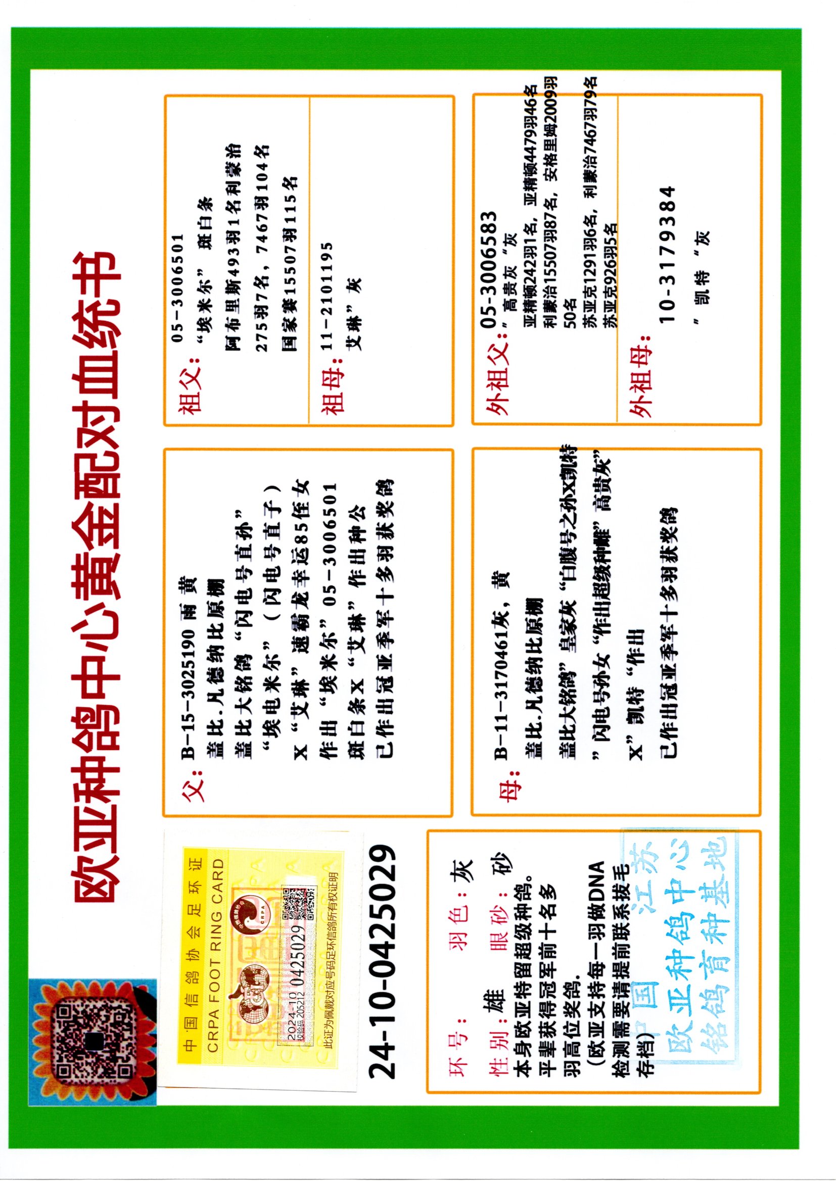 24年秋南京特比环欧亚荣获大团体冠军.小团体冠军551公里大特比13名.14名.16名.19名.20名.21名.24名.26名.27名.28名.42名.52名.54名.57名.65名.66名.68名.70名.71名.72名.74名.76名.80名.82名.83名.84名.85名.86名.90名.92名.110名.116名.121名.122名.128名.131名.158名.161名.164名.165名.166名.172名.174名.177名.182名.195名.196名.201名.205名.208名.210名.216名.253名.269名.275名.276名.294名.296名.299名,,24年秋云南天南铜都公棚决赛415名.天南铜都小棚决赛409名.云南玉活公棚决赛102名.490名.团体32名上笼二羽进二羽,天南铜都大棚506公里决赛445名。热烈祝贺河北省巨鹿县李兰生老师用欧亚泰山号血系连续十一年夺冠军,河北省国家赛冠军.全国季军等多次前十名高位,扬州王军王总用欧亚利奥24年春季获山东翔宇公棚决赛33名盖比53名。南京刘正龙刘总用欧亚盖比获得24年秋山东潍坊国际公棚决赛42名.精英赛30名.三关鸽王71名.决赛86名.加站赛16名.南京市特比环A组鸽王9名.B组鸽王5名.6名.C组鸽王5名.精英赛冠军4名.技能赛A组冠军4名.5名.秦淮区特比环荣获15名.46名.48名.87名。四川西昌徐亮徐总用欧亚利奥获得凉山州聚友决赛177名.第二关亚军双关鸽王19名.三关鸽王105名.云南豪庭公棚决赛603名。热烈祝贺24年四川重庆翔园鸽舍用欧亚泰山号荣获春季400公里冠军.秋季500公里冠军,河北王总用詹森X利奥获得千羽千翔公棚400公里冠军,广东蔡楷焕荣获24年秋爱好者 赛鸽俱乐部三关鸽王季军.一关420公里99名.二关450公里11名.三关520公里32名.单关季军.7名.12名,江西李卫兴荣获贵州红枫公棚8名.共翔俱乐部寄养棚四关综合鸽王30名.一关400公里78名.二关500公里55名.三关520公里37名.四关500公里57名.同父母获公棚18名.雷鸣获得武汉黄浦育翔中心冠军,四川陈文获得四川明鸿俱乐部300公里梦幻2名.3名.4名.9名.10名.13名.14名.15名.31名.34名.40名.41名.42名.43名.69名.71名.72名.73名.74名.94名.95名.97名.98名.99名.419公里决赛荣获总冠军7名.总共归巢9羽,四川徐亮获豪庭决赛603名,山西郑勇获得山西泰鑫公棚决赛255名詹森红狐,热烈祝贺马总获得开尔(飞跃队)决赛9名获奖金1310000万元.第一关52名,天津津福资赛180公里96名.获奖金429543万元,欧亚支持全国鸽友24年秋多人报喜 祝大家取得更好成绩,给欧亚报喜鸽友欧亚决定给每人赠送一羽超级种鸽。欧亚俱乐部特比环多关鸽王成绩:15年秋淮安特比环黑色星期一全会上笼9700多羽,当天无鸽归巢,第二天全会归巢357羽,本舍归巢158羽.前十名八羽.前一百名归巢57羽,16年春季获五关鸽王总冠军,总亚军四名.六名.七名.九名.十名.晶艺俱乐部520公里冠亚季军5名.6名.7名.9名.11名等,火车头冠军.季军6名.8名.9名.10名,16年秋晶艺俱乐部特比环520公里亚军.季军4名.6名.7名.9名,15年春南京白下特比环冠军.亚军.季军6名.7名.8名.9名.10名.指定鸽A B组获得冠军.亚军.季军4名.5名.,17年淮安特比环亚军.4名.5名.7名.8名.10名.六关鸽王总冠军.4名.6名.9名.10名,寄养棚宿迁刘总20羽特比环获冠军.季军.4名.7名.8名.9名等。18年荣获万羽特比环六关鸽王总冠军.总亚军.总季军.6名.8名.十名.单关四羽冠军.二羽亚军.四羽季军.前十名27羽。19年秋万羽特比环六关鸽王总亚军.总季军.5名.8名等,单关二羽冠军.三羽亚军.一羽季军前十名31羽。20年秋淮安市鸽会四关特比环大赛风雨无阻鸽王亚军.鸽王六名,金品俱乐部万羽特比环六关鸽王总冠军,总亚军.四名.五名.六名.七名.八名.十名.前二百名鸽王35羽,单关冠亚季军前十名四十多羽,火车头五关鸽王季军.六名.八名.前二百名鸽王十七羽。20年春荣获淮安五区一市四关鸽王总冠军.亚军.四名.八名.九名。21年秋荣获金品万羽特比环大赛六关鸽王总亚军.总季军.四名.七名.九名.十名.单关冠亚军季军前十名三十多羽。火车头协会鸽王六名.七名.十名.单关前十名十七羽。22年秋荣获鸽王总冠军.总亚军.5名.7名.8名.9名.11名.单关冠亚季军前十名三十多羽,第一关单关前二百名四十多羽,第二关前二百名三十多羽,第三关前二百名四十多羽,第四关前二百名四十多羽,第五关前一百名53羽。23年秋荣获鸽王季军.五名.八名.十名.13名.17名.20名.27名等多羽鸽王.单关前十名二十多羽。公棚.寄养棚部分成绩:16年秋宁夏黄河公棚总冠军电脑戈马力指定通炮冠军,17年送八羽参赛获得鸽王八名进奖四名,支持韩总荣获八名。支持鸽友荣获宁夏中卫公棚决赛总冠军.精英赛冠军,支持18年宁夏黄河公棚决赛冠军詹森X泰山。安徽鼎博寄养棚院内外四关鸽王总冠军.鸽王十七名.三十七名同窝,鸽王39名.42名.58名.67名。18年山东公棚预赛冠军.决赛65名.送八羽进奖五羽.指定获奔驰汽车一辆。支持鸽友获得云南蓝云公棚冠军.盖比X佛卡门。支持鸽友荣获云南银集公棚决赛冠军 詹森427X520血系 速度赛6700羽冠军。17年荣获金马俱乐部寄养棚四关鸽王总冠军.季军.六名.八名.第一关冠军.亚军.季军四名.七名.十一名.金牌教练奖。支持鸽友18年北京费翔公棚预赛九名电脑X桑杰士,支持鸽友荣获陕西威力公棚决赛11名.内蒙古临河寄养棚四关鸽王六名.詹森配泰山,支持河北王总用欧亚詹森427配胡本喜获20年秋开尔青年棚季军。云南东荣公棚16年预赛冠军.决赛77名.17年决赛12名.詹森红狐X泰山,17年平安公棚决赛4名 詹森427。欧亚获得21年金母寄养棚第一关四名.第二关5名.第三关5名.6名.7名.10名.三关鸽王总冠军,四关鸽王14名.十羽鸽王。支持河