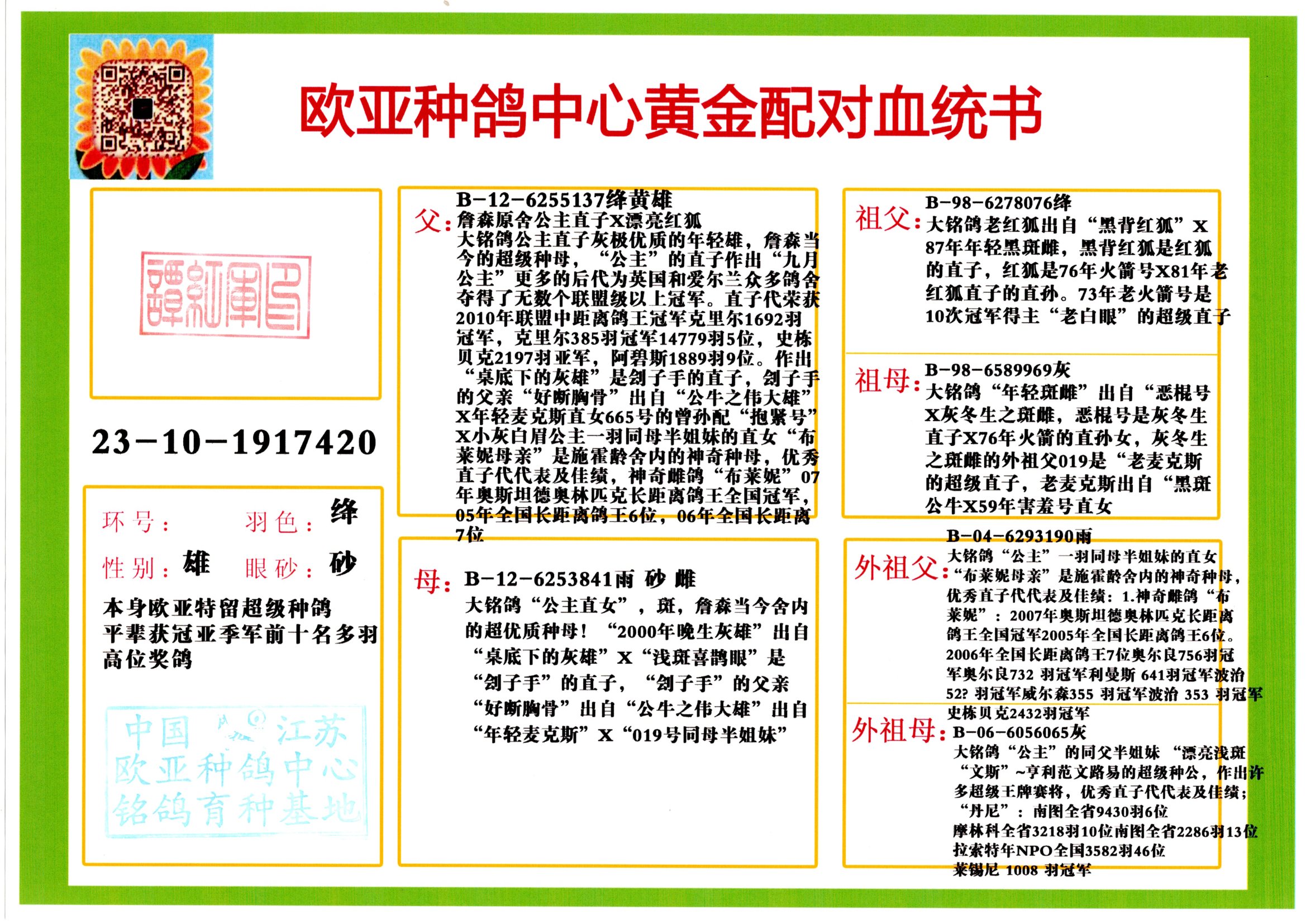 24年秋南京特比环欧亚荣获大团体冠军.小团体冠军551公里大特比13名.14名.16名.19名.20名.21名.24名.26名.27名.28名.42名.52名.54名.57名.65名.66名.68名.70名.71名.72名.74名.76名.80名.82名.83名.84名.85名.86名.90名.92名.110名.116名.121名.122名.128名.131名.158名.161名.164名.165名.166名.172名.174名.177名.182名.195名.196名.201名.205名.208名.210名.216名.253名.269名.275名.276名.294名.296名.299名,,24年秋云南天南铜都公棚决赛415名.天南铜都小棚决赛409名.云南玉活公棚决赛102名.490名.团体32名上笼二羽进二羽,天南铜都大棚506公里决赛445名。热烈祝贺河北省巨鹿县李兰生老师用欧亚泰山号血系连续十一年夺冠军,河北省国家赛冠军.全国季军等多次前十名高位,扬州王军王总用欧亚利奥24年春季获山东翔宇公棚决赛33名盖比53名。南京刘正龙刘总用欧亚盖比获得24年秋山东潍坊国际公棚决赛42名.精英赛30名.三关鸽王71名.决赛86名.加站赛16名.南京市特比环A组鸽王9名.B组鸽王5名.6名.C组鸽王5名.精英赛冠军4名.技能赛A组冠军4名.5名.秦淮区特比环荣获15名.46名.48名.87名。四川西昌徐亮徐总用欧亚利奥获得凉山州聚友决赛177名.第二关亚军双关鸽王19名.三关鸽王105名.云南豪庭公棚决赛603名。热烈祝贺24年四川重庆翔园鸽舍用欧亚泰山号荣获春季400公里冠军.秋季500公里冠军,河北王总用詹森X利奥获得千羽千翔公棚400公里冠军,广东蔡楷焕荣获24年秋爱好者 赛鸽俱乐部三关鸽王季军.一关420公里99名.二关450公里11名.三关520公里32名.单关季军.7名.12名,江西李卫兴荣获贵州红枫公棚8名.共翔俱乐部寄养棚四关综合鸽王30名.一关400公里78名.二关500公里55名.三关520公里37名.四关500公里57名.同父母获公棚18名.雷鸣获得武汉黄浦育翔中心冠军,四川陈文获得四川明鸿俱乐部300公里梦幻2名.3名.4名.9名.10名.13名.14名.15名.31名.34名.40名.41名.42名.43名.69名.71名.72名.73名.74名.94名.95名.97名.98名.99名.419公里决赛荣获总冠军7名.总共归巢9羽,四川徐亮获豪庭决赛603名,山西郑勇获得山西泰鑫公棚决赛255名詹森红狐,热烈祝贺马总获得开尔(飞跃队)决赛9名获奖金1310000万元.第一关52名,天津津福资赛180公里96名.获奖金429543万元,欧亚支持全国鸽友24年秋多人报喜 祝大家取得更好成绩,给欧亚报喜鸽友欧亚决定给每人赠送一羽超级种鸽。欧亚俱乐部特比环多关鸽王成绩:15年秋淮安特比环黑色星期一全会上笼9700多羽,当天无鸽归巢,第二天全会归巢357羽,本舍归巢158羽.前十名八羽.前一百名归巢57羽,16年春季获五关鸽王总冠军,总亚军四名.六名.七名.九名.十名.晶艺俱乐部520公里冠亚季军5名.6名.7名.9名.11名等,火车头冠军.季军6名.8名.9名.10名,16年秋晶艺俱乐部特比环520公里亚军.季军4名.6名.7名.9名,15年春南京白下特比环冠军.亚军.季军6名.7名.8名.9名.10名.指定鸽A B组获得冠军.亚军.季军4名.5名.,17年淮安特比环亚军.4名.5名.7名.8名.10名.六关鸽王总冠军.4名.6名.9名.10名,寄养棚宿迁刘总20羽特比环获冠军.季军.4名.7名.8名.9名等。18年荣获万羽特比环六关鸽王总冠军.总亚军.总季军.6名.8名.十名.单关四羽冠军.二羽亚军.四羽季军.前十名27羽。19年秋万羽特比环六关鸽王总亚军.总季军.5名.8名等,单关二羽冠军.三羽亚军.一羽季军前十名31羽。20年秋淮安市鸽会四关特比环大赛风雨无阻鸽王亚军.鸽王六名,金品俱乐部万羽特比环六关鸽王总冠军,总亚军.四名.五名.六名.七名.八名.十名.前二百名鸽王35羽,单关冠亚季军前十名四十多羽,火车头五关鸽王季军.六名.八名.前二百名鸽王十七羽。20年春荣获淮安五区一市四关鸽王总冠军.亚军.四名.八名.九名。21年秋荣获金品万羽特比环大赛六关鸽王总亚军.总季军.四名.七名.九名.十名.单关冠亚军季军前十名三十多羽。火车头协会鸽王六名.七名.十名.单关前十名十七羽。22年秋荣获鸽王总冠军.总亚军.5名.7名.8名.9名.11名.单关冠亚季军前十名三十多羽,第一关单关前二百名四十多羽,第二关前二百名三十多羽,第三关前二百名四十多羽,第四关前二百名四十多羽,第五关前一百名53羽。23年秋荣获鸽王季军.五名.八名.十名.13名.17名.20名.27名等多羽鸽王.单关前十名二十多羽。公棚.寄养棚部分成绩:16年秋宁夏黄河公棚总冠军电脑戈马力指定通炮冠军,17年送八羽参赛获得鸽王八名进奖四名,支持韩总荣获八名。支持鸽友荣获宁夏中卫公棚决赛总冠军.精英赛冠军,支持18年宁夏黄河公棚决赛冠军詹森X泰山。安徽鼎博寄养棚院内外四关鸽王总冠军.鸽王十七名.三十七名同窝,鸽王39名.42名.58名.67名。18年山东公棚预赛冠军.决赛65名.送八羽进奖五羽.指定获奔驰汽车一辆。支持鸽友获得云南蓝云公棚冠军.盖比X佛卡门。支持鸽友荣获云南银集公棚决赛冠军 詹森427X520血系 速度赛6700羽冠军。17年荣获金马俱乐部寄养棚四关鸽王总冠军.季军.六名.八名.第一关冠军.亚军.季军四名.七名.十一名.金牌教练奖。支持鸽友18年北京费翔公棚预赛九名电脑X桑杰士,支持鸽友荣获陕西威力公棚决赛11名.内蒙古临河寄养棚四关鸽王六名.詹森配泰山,支持河北王总用欧亚詹森427配胡本喜获20年秋开尔青年棚季军。云南东荣公棚16年预赛冠军.决赛77名.17年决赛12名.詹森红狐X泰山,17年平安公棚决赛4名 詹森427。欧亚获得21年金母寄养棚第一关四名.第二关5名.第三关5名.6名.7名.10名.三关鸽王总冠军,四关鸽王14名.十羽鸽王。支持河