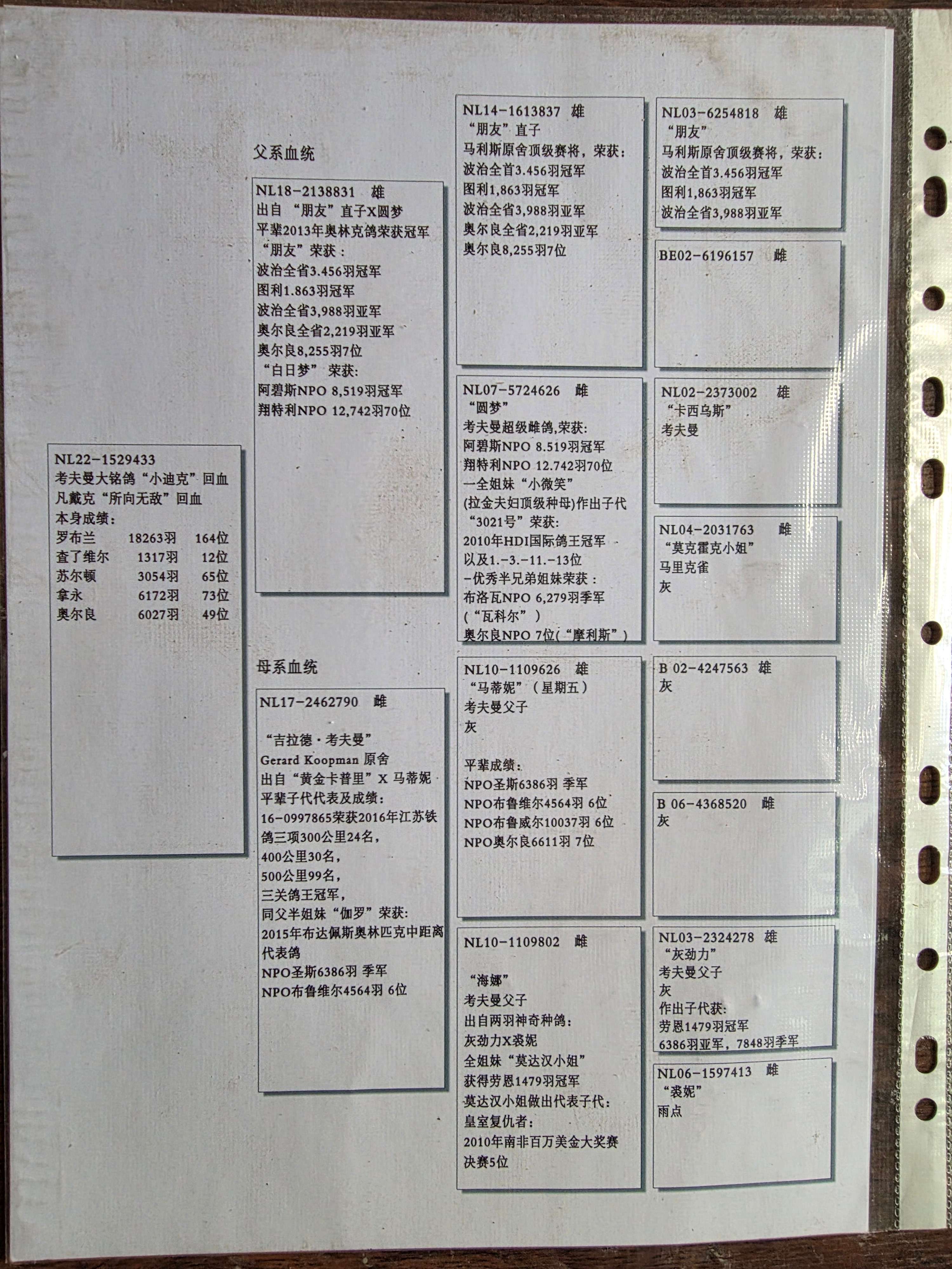 1646299 利奥轩赛鸽舍 444直子X杨半平辈直女 本身成绩2742羽季军 ¥300元 0次