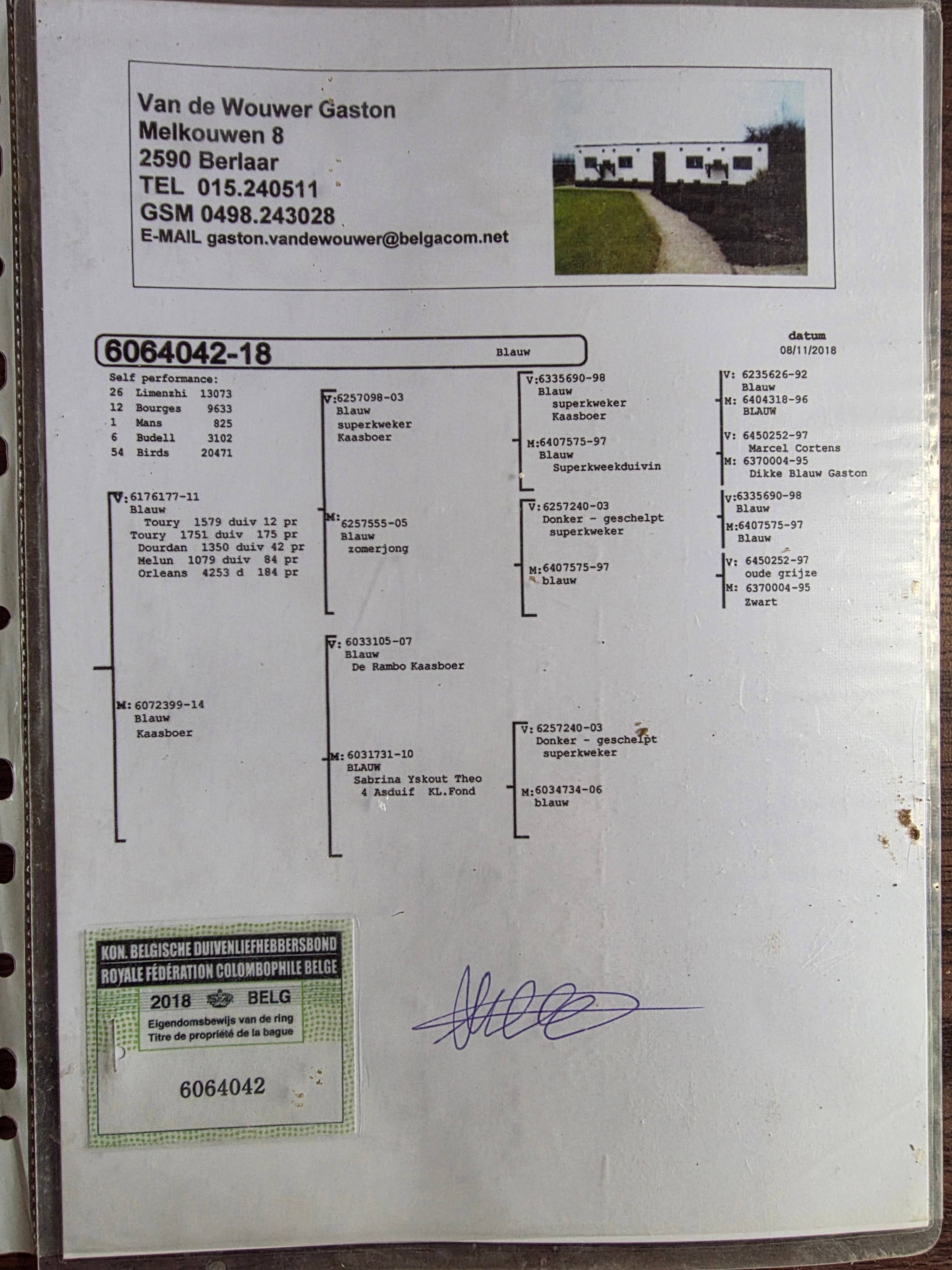 | 1646321 | 葛斯顿.范德瓦尔原舍 本身荣获7291羽冠军 | ¥300元 | 1次 |