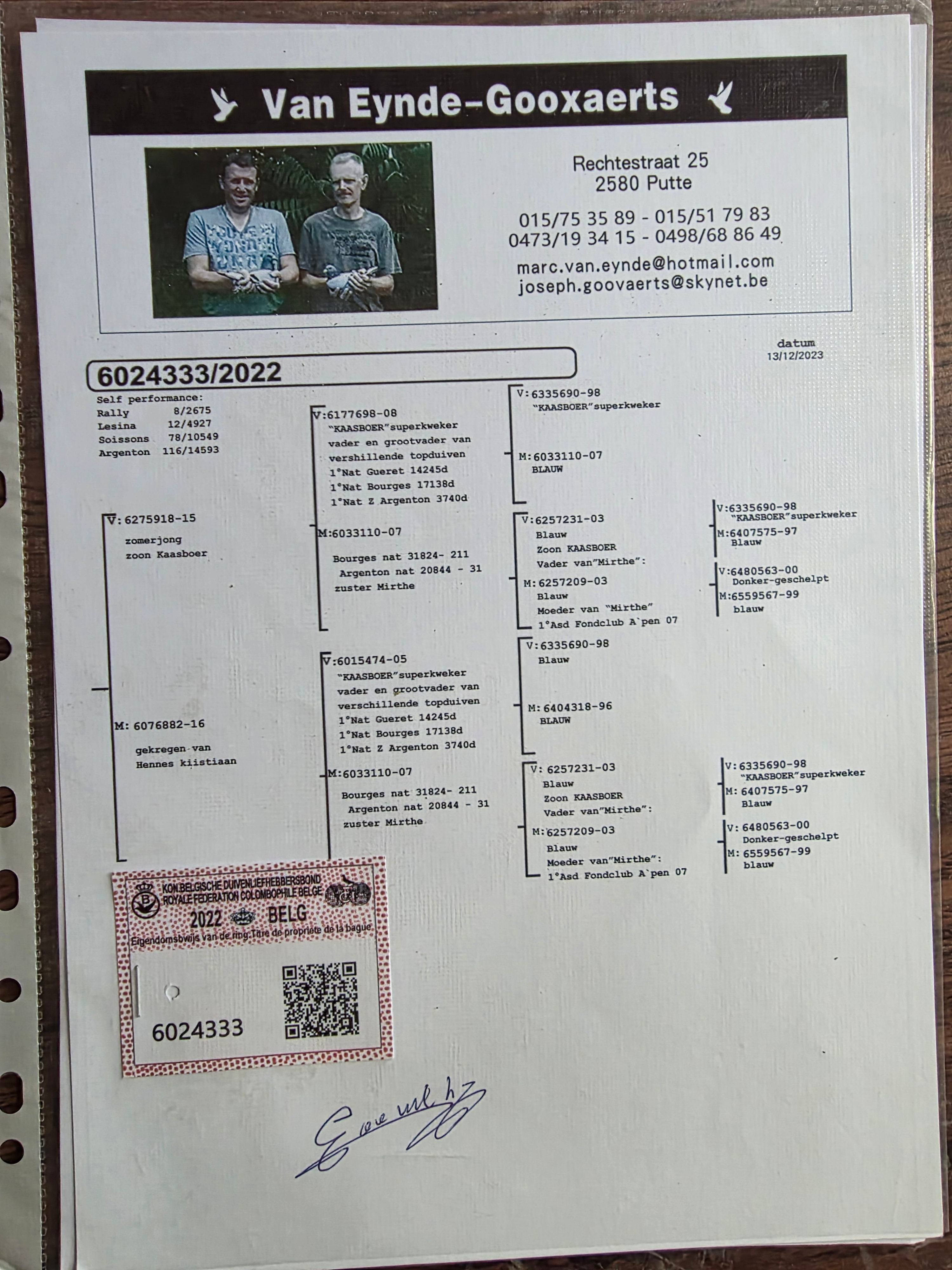 | 1646321 | 葛斯顿.范德瓦尔原舍 本身荣获7291羽冠军 | ¥300元 | 1次 |