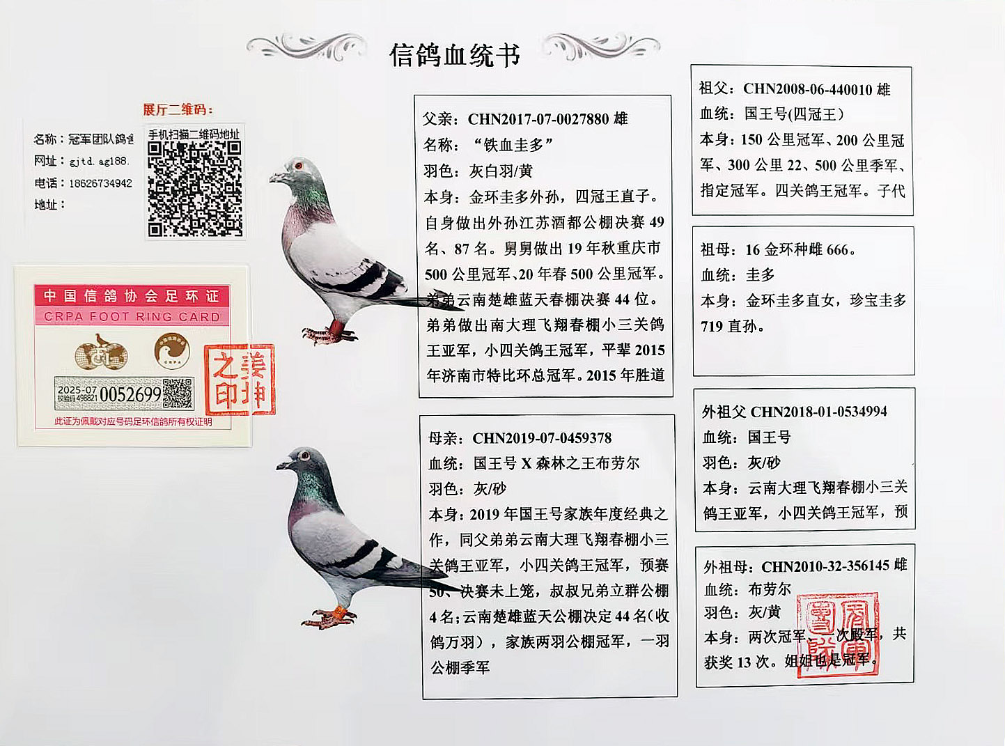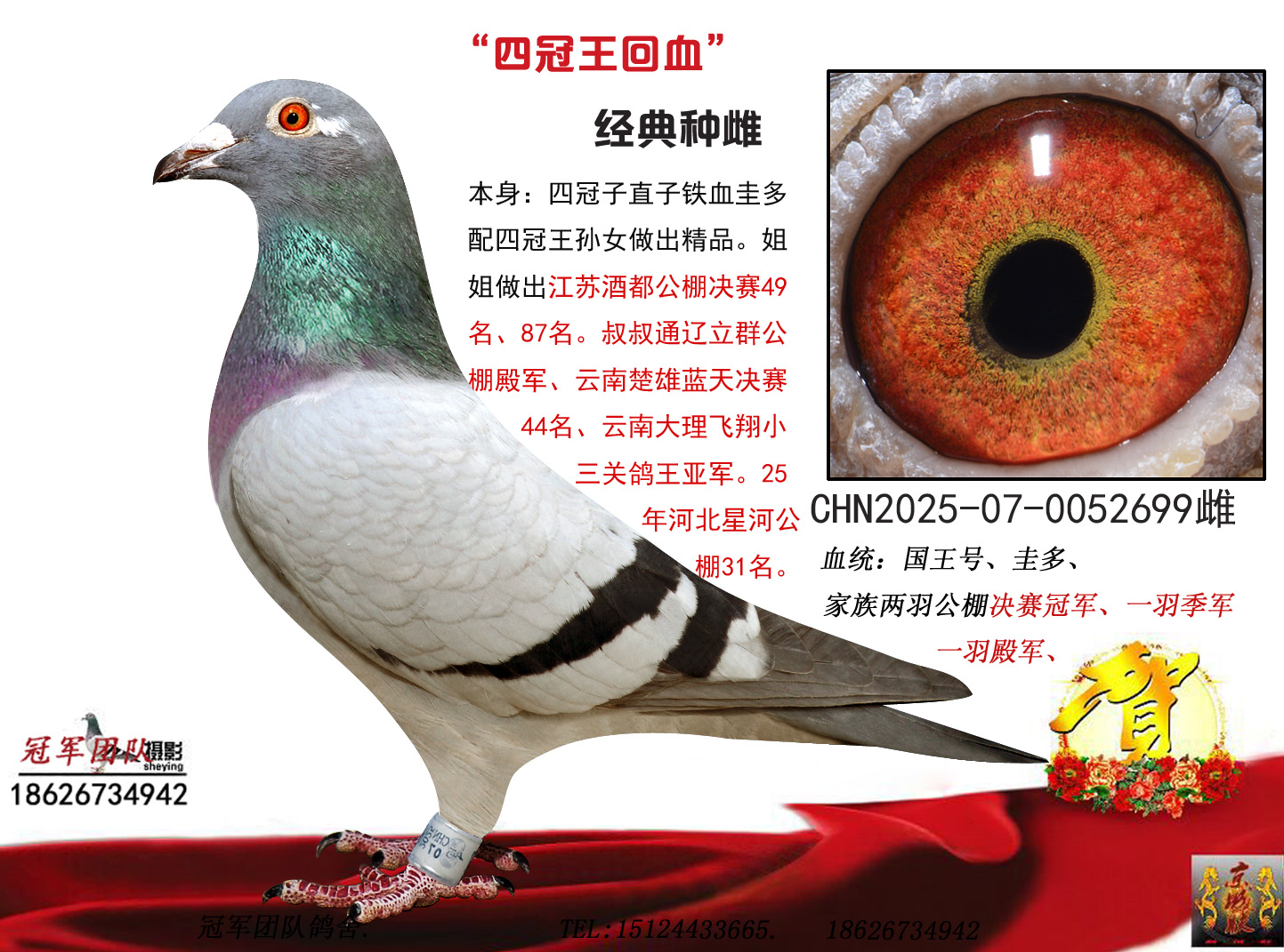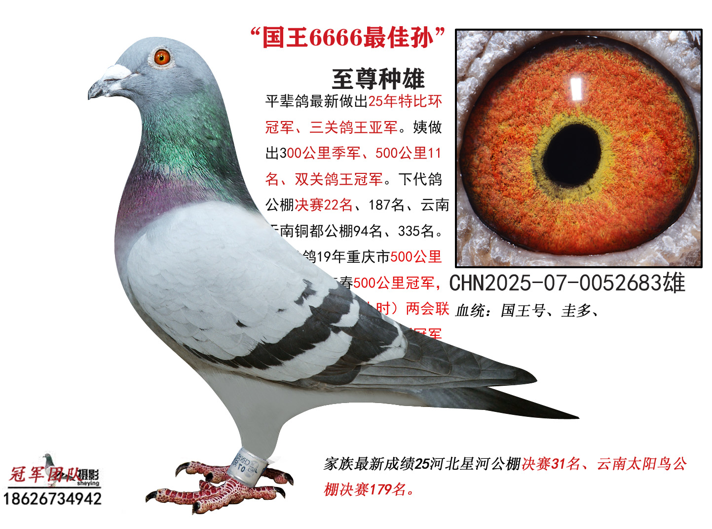 成绩、血统永久保真。血统书足环卡随鸽发出。空间有限低价分享,假一赔百,拒卖百家鸽。机不可失。