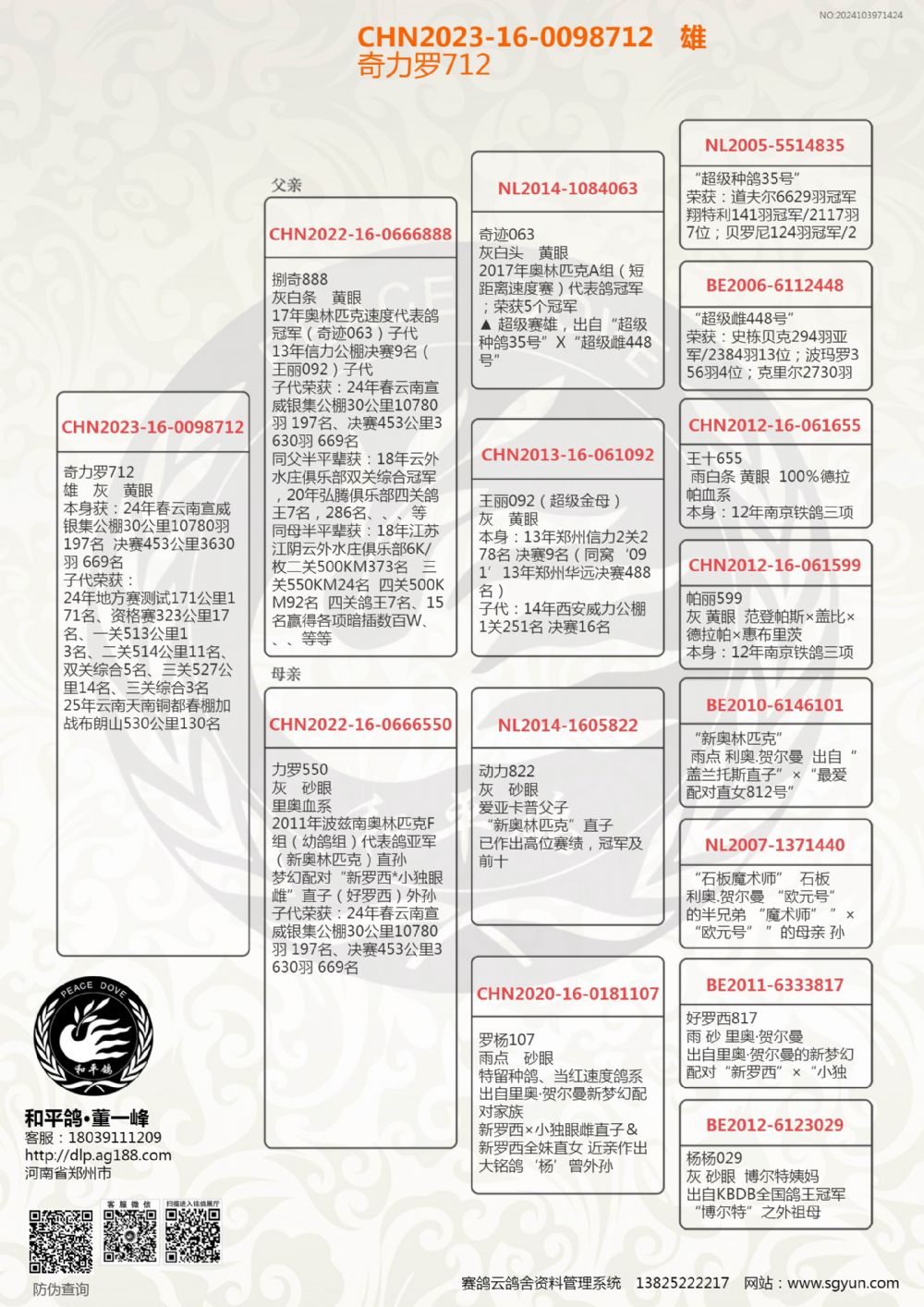 本身获:24年春云南宣威银集公棚30公里10780羽 197名 决赛453公里3630羽 669名