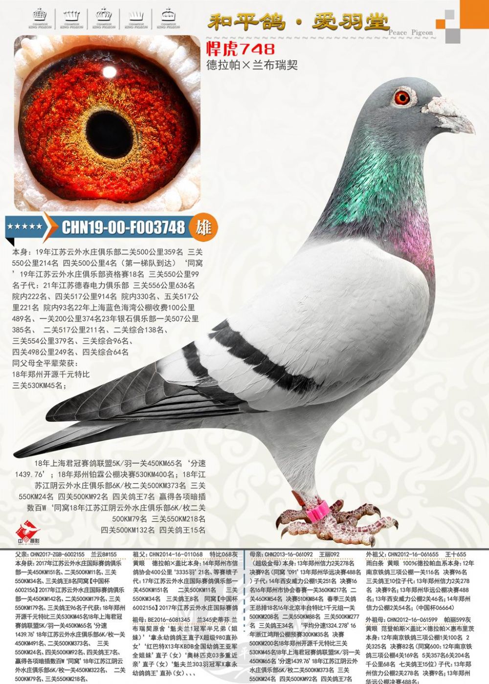 同父母全平辈荣获:18年郑州开源千元特比三关530KM45名;18年上海君冠赛鸽联盟5K/羽一关450KM65名‘分速1439.76’;18年郑州铂霖公棚决赛530KM400名;18年江苏江阴云外水庄俱乐部6K/枚二关500KM373名 三关550KM24名 四关500KM92名 四关鸽王7名 赢得各项暗插数百W‘同窝18年江苏江阴云外水庄俱乐部6K/枚二关500KM79名 三关550KM218名 四关500KM132名 四关鸽王15名 ’