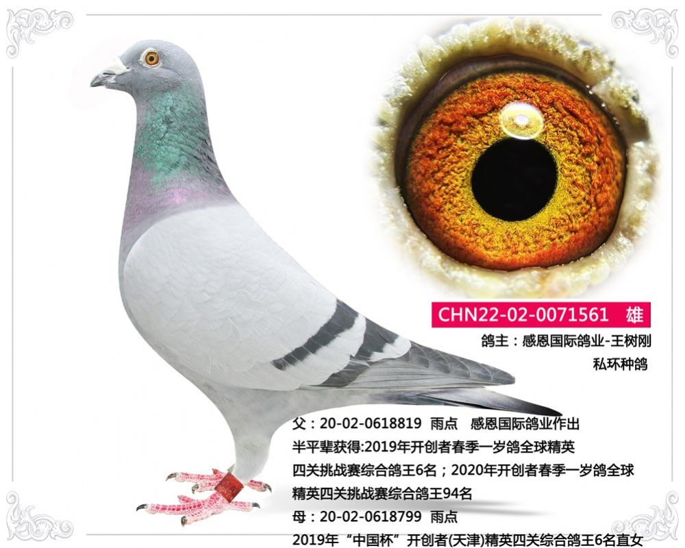 父:20-02-0618819 雨点 感恩国际鸽业作出 半平辈获得:2019年开创者春季一岁鸽全球精英四关挑战赛综合鸽王6名;2020年开创者春季一岁鸽全球