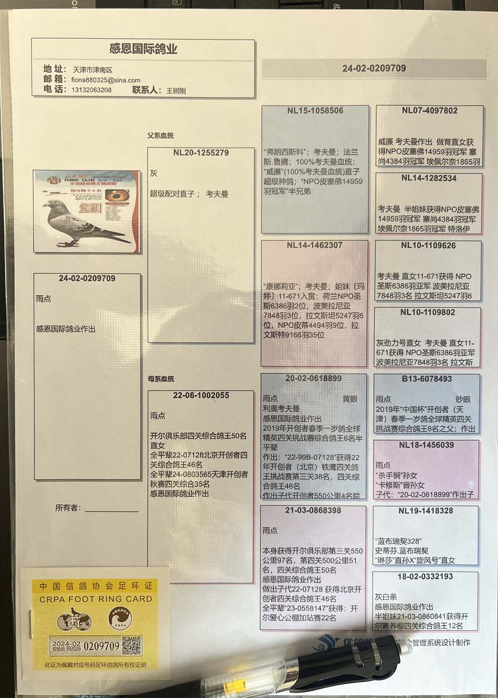 母:22-06-1002055 雨点 开尔俱乐部四关综合鸽王50名直女;全平辈22-07128北京开创者四关综合鸽王46名;全平辈24-0803565天津开创者秋赛四关综合35名 感恩国际鸽业作出;