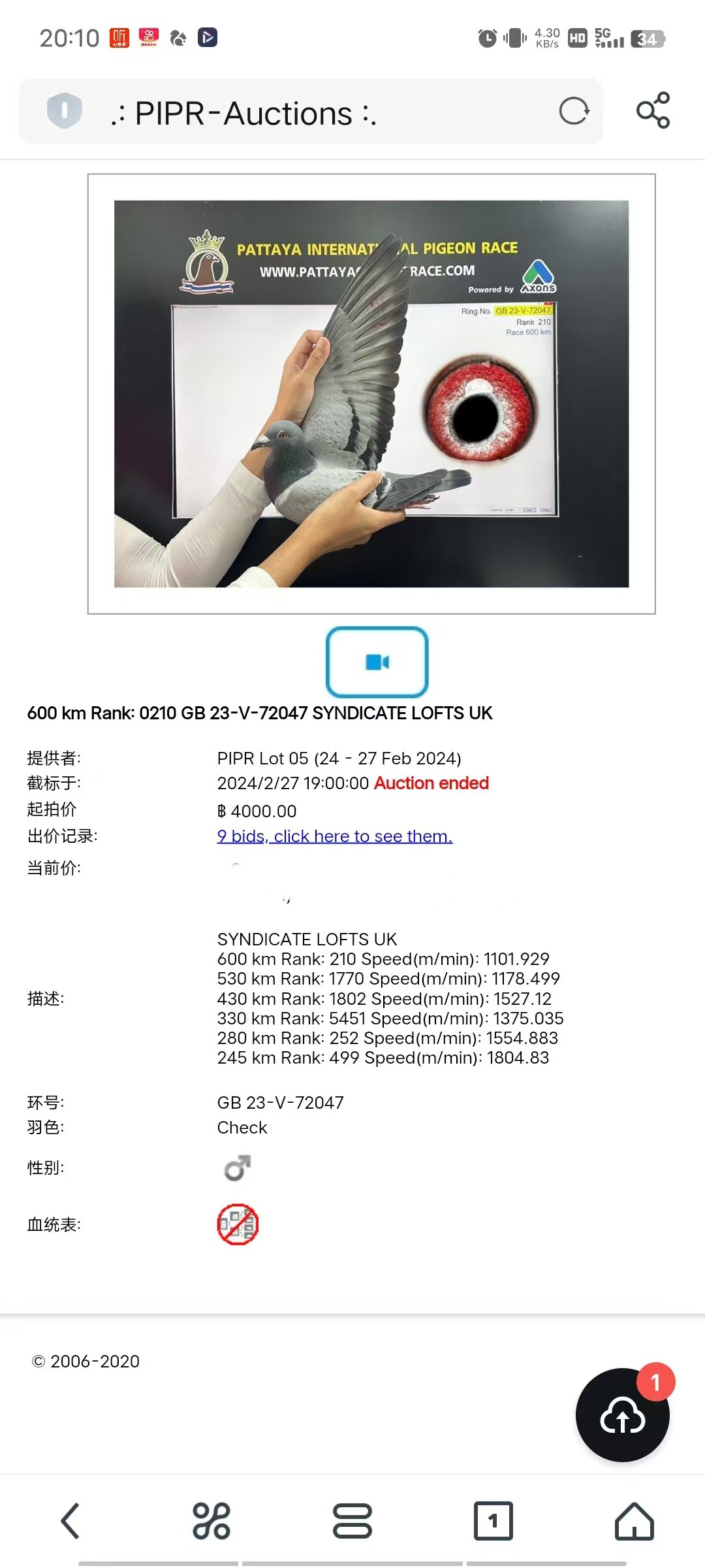 - 当前查看拍卖鸽:泰国芭提雅国际赛鸽公棚600公里加站赛2