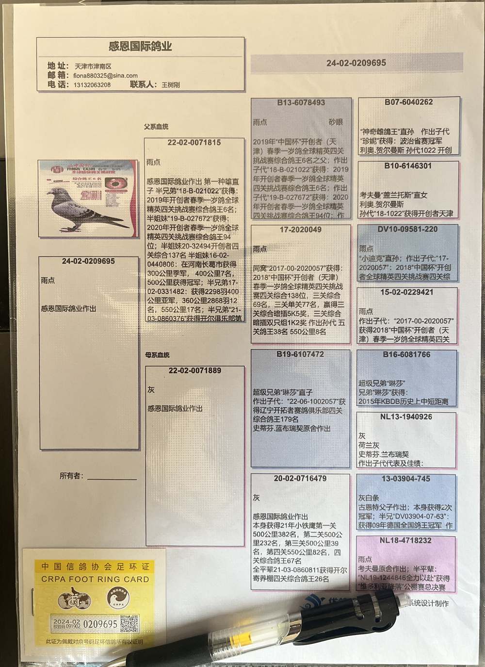 父:22-02-0071815 感恩国际鸽业作出第一种雄直子 半兄弟"18-B-021022获得:2019年开创者春季一岁鸽全球精英四关挑战赛综合鸽王6名;半姐妹"19-B-027672"获得:2020年开创者春季一岁鸽全球精英四关挑战赛综合鸽王94位;半姐妹20-32494开创者四关综合137名;半姐妹16-02-0440806 在河南长葛市获得:300公里季军,400公里7名,500公里获得冠军;半兄弟17-02-0331482:获得2298羽400公里亚军,360公里2868羽12名,550公里17名