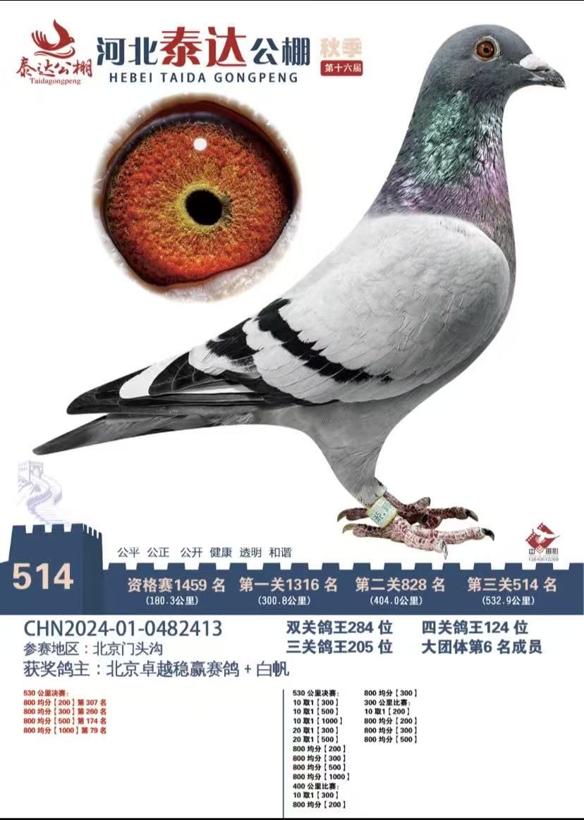 河北泰达赛鸽公棚第二关430公里828名;参与指定:800元;