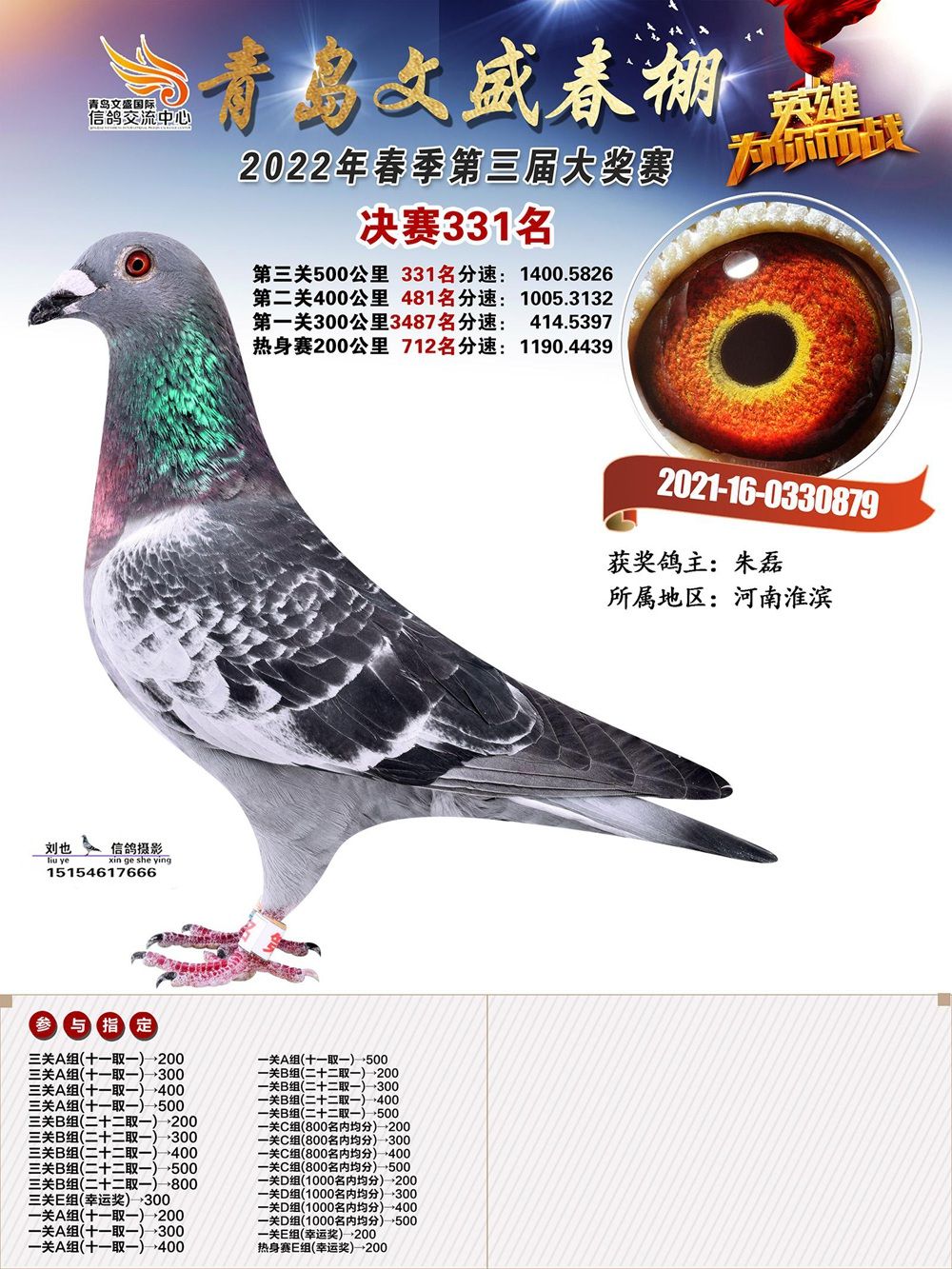 青岛文盛赛鸽春棚500公里决赛331名;参与指定:3900元;