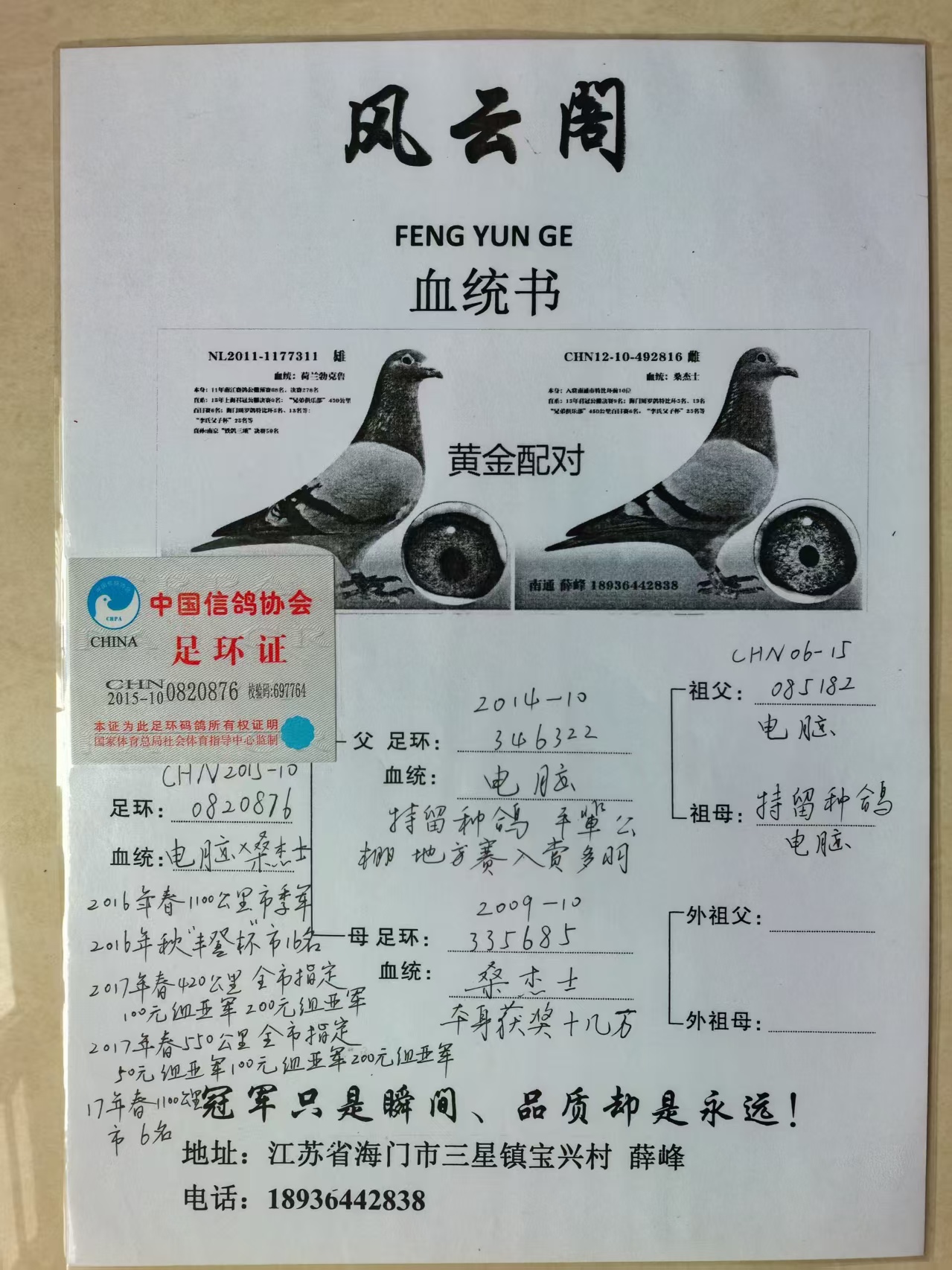韩振华+刘勇是赛鸽实战家,种鸽血统纯正,赛绩突出,他们养的鸽子并不多,本次销售的种鸽都作出过赛绩(只是鸽主不愿意总结,就看哪位鸽友有缘捡漏,拉回这批鸽子的时候,从韩振华的表情就能看出:实在是舍不得),不然早就被淘汰也不会留到现在才出售,本次只是因为机场周边禁飞,打不成地方赛事了,才被迫减少饲养,如果不是这样这些鸽子的子代应该还会在今年的特比和公棚赛场上拿奖。他们以实战为主,没有弄过血统书,(因为都是多代发挥的优良种系,每路鸽子都有很多赛绩,也不是一时就能总结的出来的,这一点你去专题介绍看一下视频录像就明白了,每年的赛绩太多了,这么多年下来,不下点功夫是整理不清的,鸽主也不想详细总结,那就看谁有缘了。)