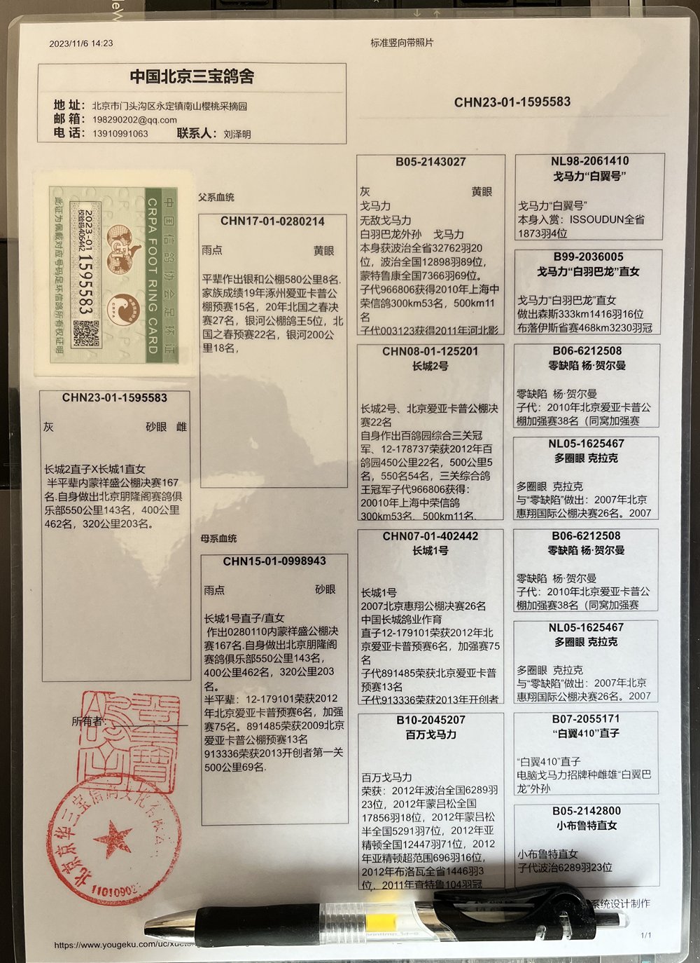 母:CHN15-01-0998943 长城1号直子直女 作出0280110内蒙祥盛公棚决赛167名.自身做出北京朋隆阁赛鸽俱乐部550公里143名400公里462名,320公里203名;