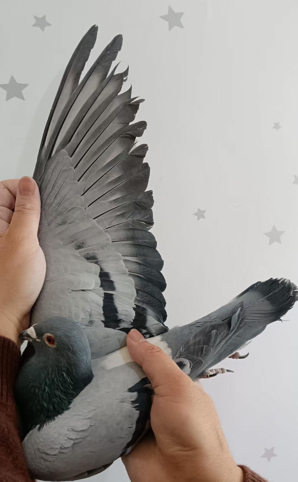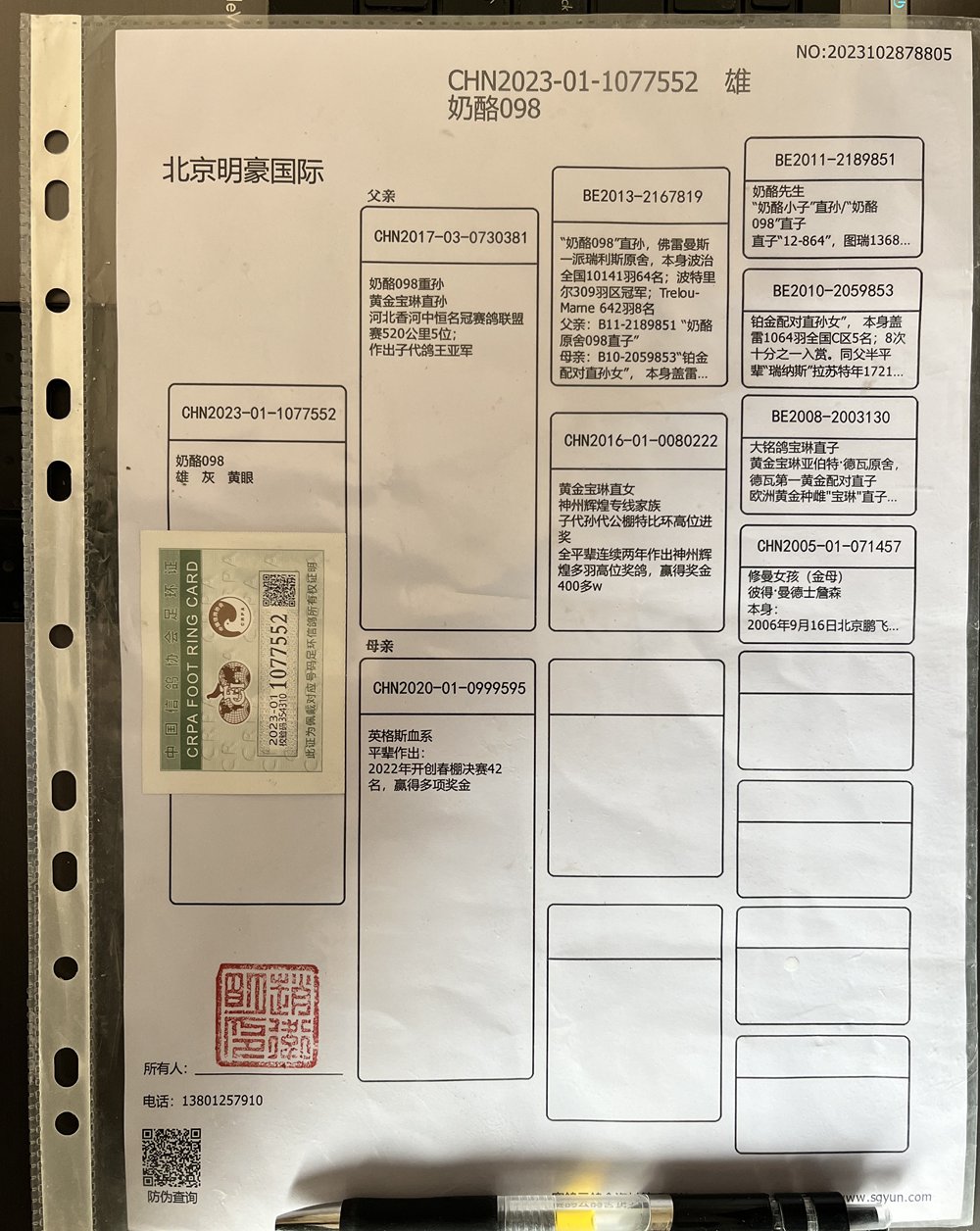 父亲:CHN2017-03-0730381 奶酪098重孙 黄金宝琳直孙 河北香河中恒名冠赛鸽联盟赛520公里5位;作出子代鸽王亚军