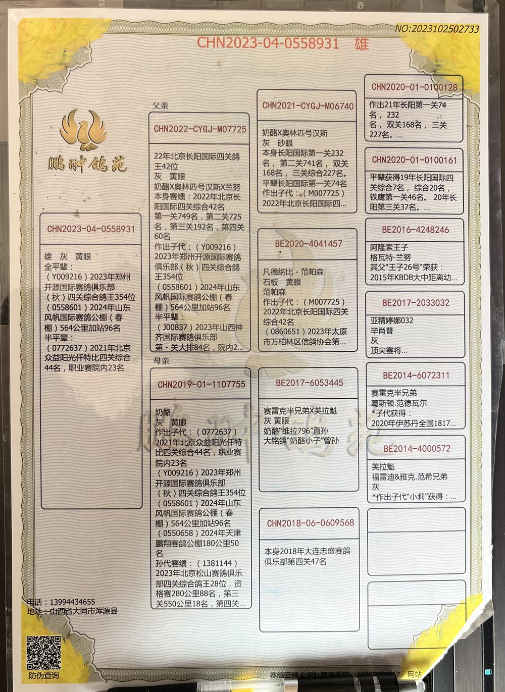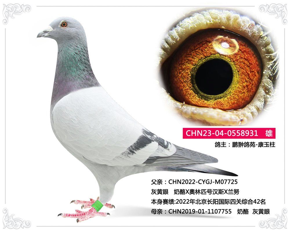 父亲:CHN2022-CYGJ-M07725 22年北京长阳国际四关鸽王42位 灰黄眼 奶酪X奧林匹号汉斯X兰努 本身赛绩:2022年北京长阳国际四关综合42名
