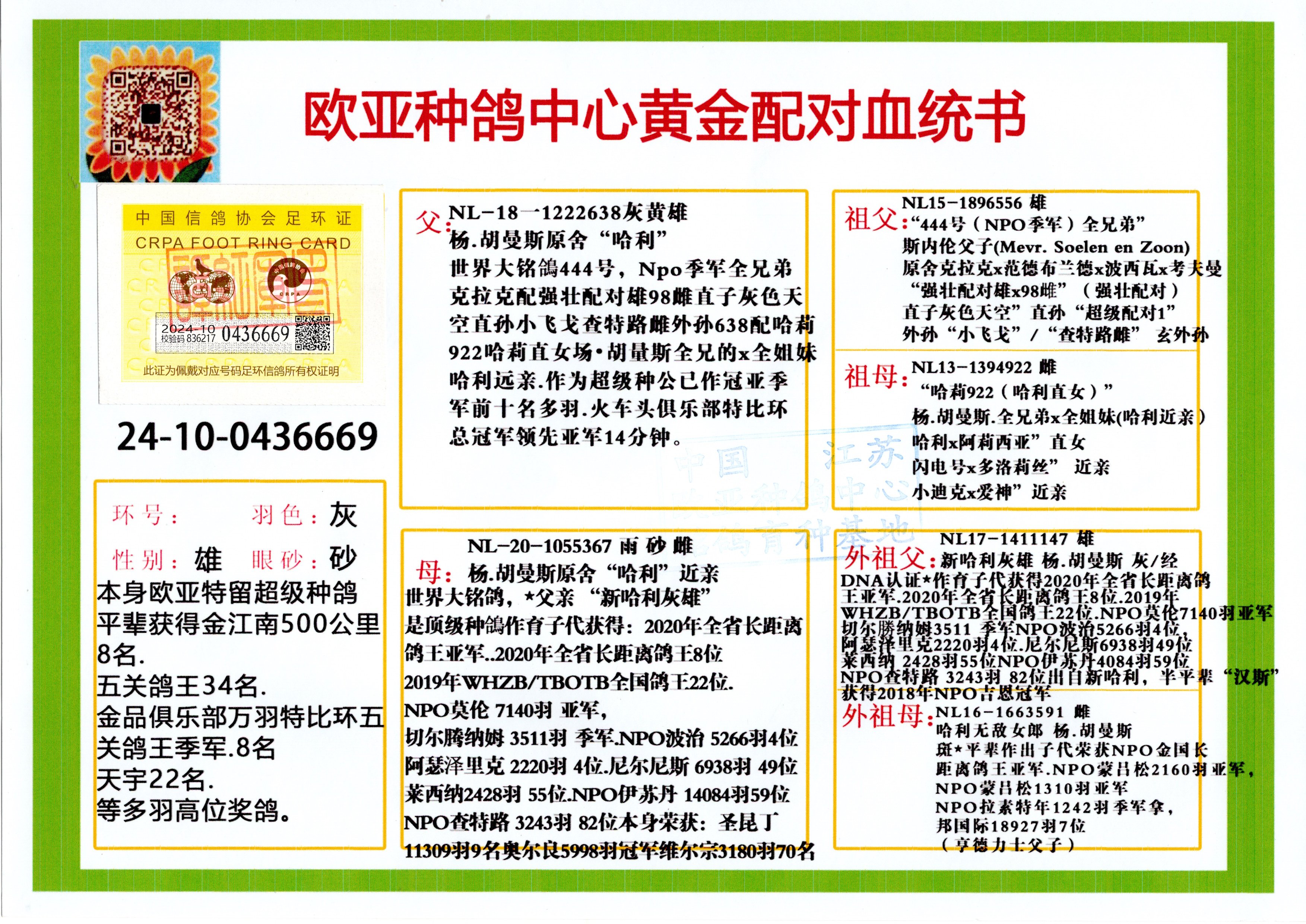 24年秋南京特比环欧亚荣获大团体冠军.小团体冠军551公里大特比13名.14名.16名.19名.20名.21名.24名.26名.27名.28名.42名.52名.54名.57名.65名.66名.68名.70名.71名.72名.74名.76名.80名.82名.83名.84名.85名.86名.90名.92名.110名.116名.121名.122名.128名.131名.158名.161名.164名.165名.166名.172名.174名.177名.182名.195名.196名.201名.205名.208名.210名.216名.253名.269名.275名.276名.294名.296名.299名,,24年秋云南天南铜都公棚决赛415名.天南铜都小棚决赛409名.云南玉活公棚决赛102名.490名.团体32名上笼二羽进二羽,天南铜都大棚506公里决赛445名。热烈祝贺河北省巨鹿县李兰生老师用欧亚泰山号血系连续十一年夺冠军,河北省国家赛冠军.全国季军等多次前十名高位,扬州王军王总用欧亚利奥24年春季获山东翔宇公棚决赛33名盖比53名。南京刘正龙刘总用欧亚盖比获得24年秋山东潍坊国际公棚决赛42名.精英赛30名.三关鸽王71名.决赛86名.加站赛16名.南京市特比环A组鸽王9名.B组鸽王5名.6名.C组鸽王5名.精英赛冠军4名.技能赛A组冠军4名.5名.秦淮区特比环荣获15名.46名.48名.87名。四川西昌徐亮徐总用欧亚利奥获得凉山州聚友决赛177名.第二关亚军双关鸽王19名.三关鸽王105名.云南豪庭公棚决赛603名。热烈祝贺24年四川重庆翔园鸽舍用欧亚泰山号荣获春季400公里冠军.秋季500公里冠军,河北王总用詹森X利奥获得千羽千翔公棚400公里冠军,广东蔡楷焕荣获24年秋爱好者 赛鸽俱乐部三关鸽王季军.一关420公里99名.二关450公里11名.三关520公里32名.单关季军.7名.12名,江西李卫兴荣获贵州红枫公棚8名.共翔俱乐部寄养棚四关综合鸽王30名.一关400公里78名.二关500公里55名.三关520公里37名.四关500公里57名.同父母获公棚18名.雷鸣获得武汉黄浦育翔中心冠军,四川陈文获得四川明鸿俱乐部300公里梦幻2名.3名.4名.9名.10名.13名.14名.15名.31名.34名.40名.41名.42名.43名.69名.71名.72名.73名.74名.94名.95名.97名.98名.99名.419公里决赛荣获总冠军7名.总共归巢9羽,四川徐亮获豪庭决赛603名,山西郑勇获得山西泰鑫公棚决赛255名詹森红狐,热烈祝贺马总获得开尔(飞跃队)决赛9名获奖金1310000万元.第一关52名,天津津福资赛180公里96名.获奖金429543万元,欧亚支持全国鸽友24年秋多人报喜 祝大家取得更好成绩,给欧亚报喜鸽友欧亚决定给每人赠送一羽超级种鸽。欧亚俱乐部特比环多关鸽王成绩:15年秋淮安特比环黑色星期一全会上笼9700多羽,当天无鸽归巢,第二天全会归巢357羽,本舍归巢158羽.前十名八羽.前一百名归巢57羽,16年春季获五关鸽王总冠军,总亚军四名.六名.七名.九名.十名.晶艺俱乐部520公里冠亚季军5名.6名.7名.9名.11名等,火车头冠军.季军6名.8名.9名.10名,16年秋晶艺俱乐部特比环520公里亚军.季军4名.6名.7名.9名,15年春南京白下特比环冠军.亚军.季军6名.7名.8名.9名.10名.指定鸽A B组获得冠军.亚军.季军4名.5名.,17年淮安特比环亚军.4名.5名.7名.8名.10名.六关鸽王总冠军.4名.6名.9名.10名,寄养棚宿迁刘总20羽特比环获冠军.季军.4名.7名.8名.9名等。18年荣获万羽特比环六关鸽王总冠军.总亚军.总季军.6名.8名.十名.单关四羽冠军.二羽亚军.四羽季军.前十名27羽。19年秋万羽特比环六关鸽王总亚军.总季军.5名.8名等,单关二羽冠军.三羽亚军.一羽季军前十名31羽。20年秋淮安市鸽会四关特比环大赛风雨无阻鸽王亚军.鸽王六名,金品俱乐部万羽特比环六关鸽王总冠军,总亚军.四名.五名.六名.七名.八名.十名.前二百名鸽王35羽,单关冠亚季军前十名四十多羽,火车头五关鸽王季军.六名.八名.前二百名鸽王十七羽。20年春荣获淮安五区一市四关鸽王总冠军.亚军.四名.八名.九名。21年秋荣获金品万羽特比环大赛六关鸽王总亚军.总季军.四名.七名.九名.十名.单关冠亚军季军前十名三十多羽。火车头协会鸽王六名.七名.十名.单关前十名十七羽。22年秋荣获鸽王总冠军.总亚军.5名.7名.8名.9名.11名.单关冠亚季军前十名三十多羽,第一关单关前二百名四十多羽,第二关前二百名三十多羽,第三关前二百名四十多羽,第四关前二百名四十多羽,第五关前一百名53羽。23年秋荣获鸽王季军.五名.八名.十名.13名.17名.20名.27名等多羽鸽王.单关前十名二十多羽。公棚.寄养棚部分成绩:16年秋宁夏黄河公棚总冠军电脑戈马力指定通炮冠军,17年送八羽参赛获得鸽王八名进奖四名,支持韩总荣获八名。支持鸽友荣获宁夏中卫公棚决赛总冠军.精英赛冠军,支持18年宁夏黄河公棚决赛冠军詹森X泰山。安徽鼎博寄养棚院内外四关鸽王总冠军.鸽王十七名.三十七名同窝,鸽王39名.42名.58名.67名。18年山东公棚预赛冠军.决赛65名.送八羽进奖五羽.指定获奔驰汽车一辆。支持鸽友获得云南蓝云公棚冠军.盖比X佛卡门。支持鸽友荣获云南银集公棚决赛冠军 詹森427X520血系 速度赛6700羽冠军。17年荣获金马俱乐部寄养棚四关鸽王总冠军.季军.六名.八名.第一关冠军.亚军.季军四名.七名.十一名.金牌教练奖。支持鸽友18年北京费翔公棚预赛九名电脑X桑杰士,支持鸽友荣获陕西威力公棚决赛11名.内蒙古临河寄养棚四关鸽王六名.詹森配泰山,支持河北王总用欧亚詹森427配胡本喜获20年秋开尔青年棚季军。云南东荣公棚16年预赛冠军.决赛77名.17年决赛12名.詹森红狐X泰山,17年平安公棚决赛4名 詹森427。欧亚获得21年金母寄养棚第一关四名.第二关5名.第三关5名.6名.7名.10名.三关鸽王总冠军,四关鸽王14名.十羽鸽王。支持河