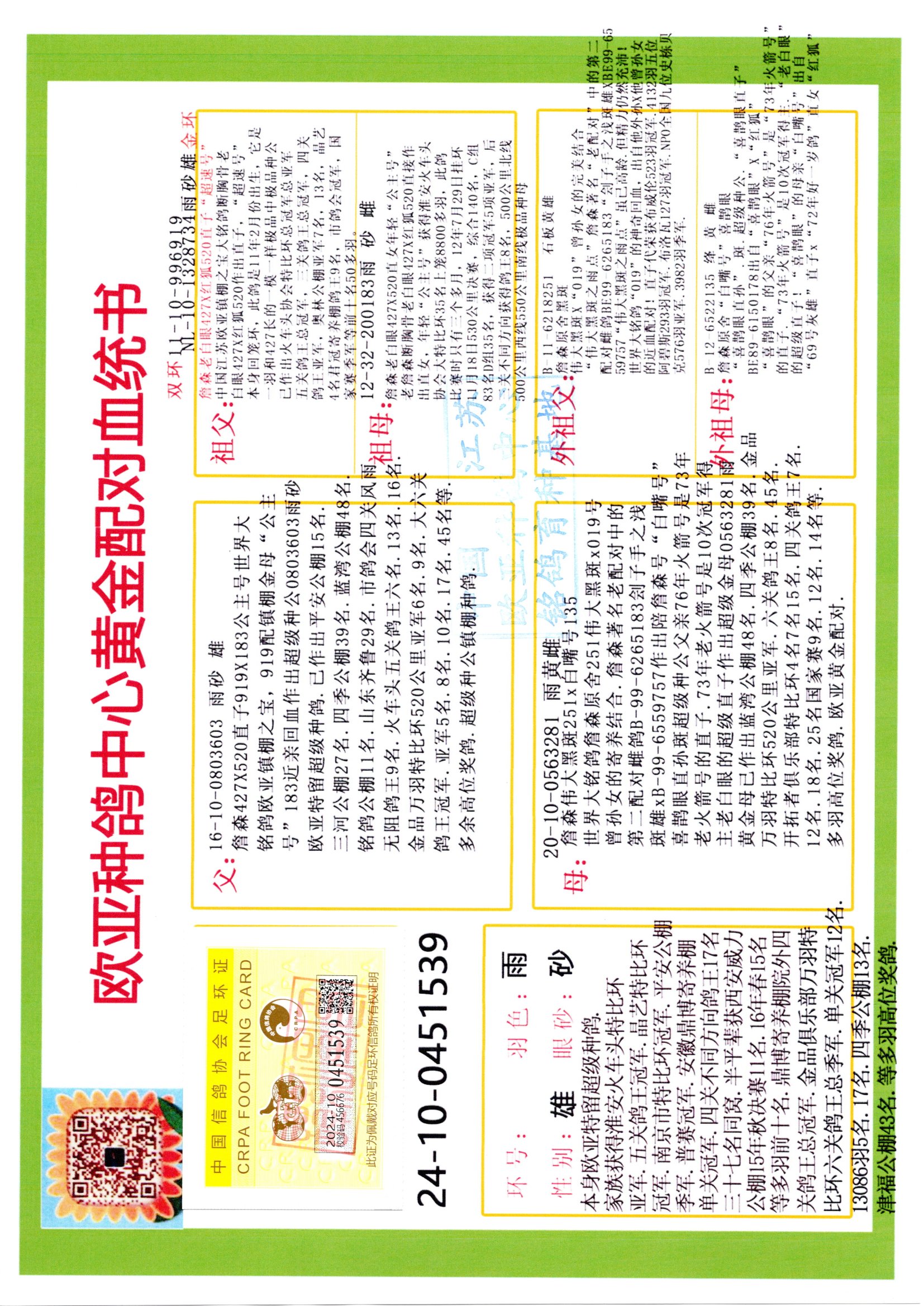 24年秋南京特比环欧亚荣获大团体冠军.小团体冠军551公里大特比13名.14名.16名.19名.20名.21名.24名.26名.27名.28名.42名.52名.54名.57名.65名.66名.68名.70名.71名.72名.74名.76名.80名.82名.83名.84名.85名.86名.90名.92名.110名.116名.121名.122名.128名.131名.158名.161名.164名.165名.166名.172名.174名.177名.182名.195名.196名.201名.205名.208名.210名.216名.253名.269名.275名.276名.294名.296名.299名,,24年秋云南天南铜都公棚决赛415名.天南铜都小棚决赛409名.云南玉活公棚决赛102名.490名.团体32名上笼二羽进二羽,天南铜都大棚506公里决赛445名。热烈祝贺河北省巨鹿县李兰生老师用欧亚泰山号血系连续十一年夺冠军,河北省国家赛冠军.全国季军等多次前十名高位,扬州王军王总用欧亚利奥24年春季获山东翔宇公棚决赛33名盖比53名。南京刘正龙刘总用欧亚盖比获得24年秋山东潍坊国际公棚决赛42名.精英赛30名.三关鸽王71名.决赛86名.加站赛16名.南京市特比环A组鸽王9名.B组鸽王5名.6名.C组鸽王5名.精英赛冠军4名.技能赛A组冠军4名.5名.秦淮区特比环荣获15名.46名.48名.87名。四川西昌徐亮徐总用欧亚利奥获得凉山州聚友决赛177名.第二关亚军双关鸽王19名.三关鸽王105名.云南豪庭公棚决赛603名。热烈祝贺24年四川重庆翔园鸽舍用欧亚泰山号荣获春季400公里冠军.秋季500公里冠军,河北王总用詹森X利奥获得千羽千翔公棚400公里冠军,广东蔡楷焕荣获24年秋爱好者 赛鸽俱乐部三关鸽王季军.一关420公里99名.二关450公里11名.三关520公里32名.单关季军.7名.12名,江西李卫兴荣获贵州红枫公棚8名.共翔俱乐部寄养棚四关综合鸽王30名.一关400公里78名.二关500公里55名.三关520公里37名.四关500公里57名.同父母获公棚18名.雷鸣获得武汉黄浦育翔中心冠军,四川陈文获得四川明鸿俱乐部300公里梦幻2名.3名.4名.9名.10名.13名.14名.15名.31名.34名.40名.41名.42名.43名.69名.71名.72名.73名.74名.94名.95名.97名.98名.99名.419公里决赛荣获总冠军7名.总共归巢9羽,四川徐亮获豪庭决赛603名,山西郑勇获得山西泰鑫公棚决赛255名詹森红狐,热烈祝贺马总获得开尔(飞跃队)决赛9名获奖金1310000万元.第一关52名,天津津福资赛180公里96名.获奖金429543万元,欧亚支持全国鸽友24年秋多人报喜 祝大家取得更好成绩,给欧亚报喜鸽友欧亚决定给每人赠送一羽超级种鸽。欧亚俱乐部特比环多关鸽王成绩:15年秋淮安特比环黑色星期一全会上笼9700多羽,当天无鸽归巢,第二天全会归巢357羽,本舍归巢158羽.前十名八羽.前一百名归巢57羽,16年春季获五关鸽王总冠军,总亚军四名.六名.七名.九名.十名.晶艺俱乐部520公里冠亚季军5名.6名.7名.9名.11名等,火车头冠军.季军6名.8名.9名.10名,16年秋晶艺俱乐部特比环520公里亚军.季军4名.6名.7名.9名,15年春南京白下特比环冠军.亚军.季军6名.7名.8名.9名.10名.指定鸽A B组获得冠军.亚军.季军4名.5名.,17年淮安特比环亚军.4名.5名.7名.8名.10名.六关鸽王总冠军.4名.6名.9名.10名,寄养棚宿迁刘总20羽特比环获冠军.季军.4名.7名.8名.9名等。18年荣获万羽特比环六关鸽王总冠军.总亚军.总季军.6名.8名.十名.单关四羽冠军.二羽亚军.四羽季军.前十名27羽。19年秋万羽特比环六关鸽王总亚军.总季军.5名.8名等,单关二羽冠军.三羽亚军.一羽季军前十名31羽。20年秋淮安市鸽会四关特比环大赛风雨无阻鸽王亚军.鸽王六名,金品俱乐部万羽特比环六关鸽王总冠军,总亚军.四名.五名.六名.七名.八名.十名.前二百名鸽王35羽,单关冠亚季军前十名四十多羽,火车头五关鸽王季军.六名.八名.前二百名鸽王十七羽。20年春荣获淮安五区一市四关鸽王总冠军.亚军.四名.八名.九名。21年秋荣获金品万羽特比环大赛六关鸽王总亚军.总季军.四名.七名.九名.十名.单关冠亚军季军前十名三十多羽。火车头协会鸽王六名.七名.十名.单关前十名十七羽。22年秋荣获鸽王总冠军.总亚军.5名.7名.8名.9名.11名.单关冠亚季军前十名三十多羽,第一关单关前二百名四十多羽,第二关前二百名三十多羽,第三关前二百名四十多羽,第四关前二百名四十多羽,第五关前一百名53羽。23年秋荣获鸽王季军.五名.八名.十名.13名.17名.20名.27名等多羽鸽王.单关前十名二十多羽。公棚.寄养棚部分成绩:16年秋宁夏黄河公棚总冠军电脑戈马力指定通炮冠军,17年送八羽参赛获得鸽王八名进奖四名,支持韩总荣获八名。支持鸽友荣获宁夏中卫公棚决赛总冠军.精英赛冠军,支持18年宁夏黄河公棚决赛冠军詹森X泰山。安徽鼎博寄养棚院内外四关鸽王总冠军.鸽王十七名.三十七名同窝,鸽王39名.42名.58名.67名。18年山东公棚预赛冠军.决赛65名.送八羽进奖五羽.指定获奔驰汽车一辆。支持鸽友获得云南蓝云公棚冠军.盖比X佛卡门。支持鸽友荣获云南银集公棚决赛冠军 詹森427X520血系 速度赛6700羽冠军。17年荣获金马俱乐部寄养棚四关鸽王总冠军.季军.六名.八名.第一关冠军.亚军.季军四名.七名.十一名.金牌教练奖。支持鸽友18年北京费翔公棚预赛九名电脑X桑杰士,支持鸽友荣获陕西威力公棚决赛11名.内蒙古临河寄养棚四关鸽王六名.詹森配泰山,支持河北王总用欧亚詹森427配胡本喜获20年秋开尔青年棚季军。云南东荣公棚16年预赛冠军.决赛77名.17年决赛12名.詹森红狐X泰山,17年平安公棚决赛4名 詹森427。欧亚获得21年金母寄养棚第一关四名.第二关5名.第三关5名.6名.7名.10名.三关鸽王总冠军,四关鸽王14名.十羽鸽王。支持河