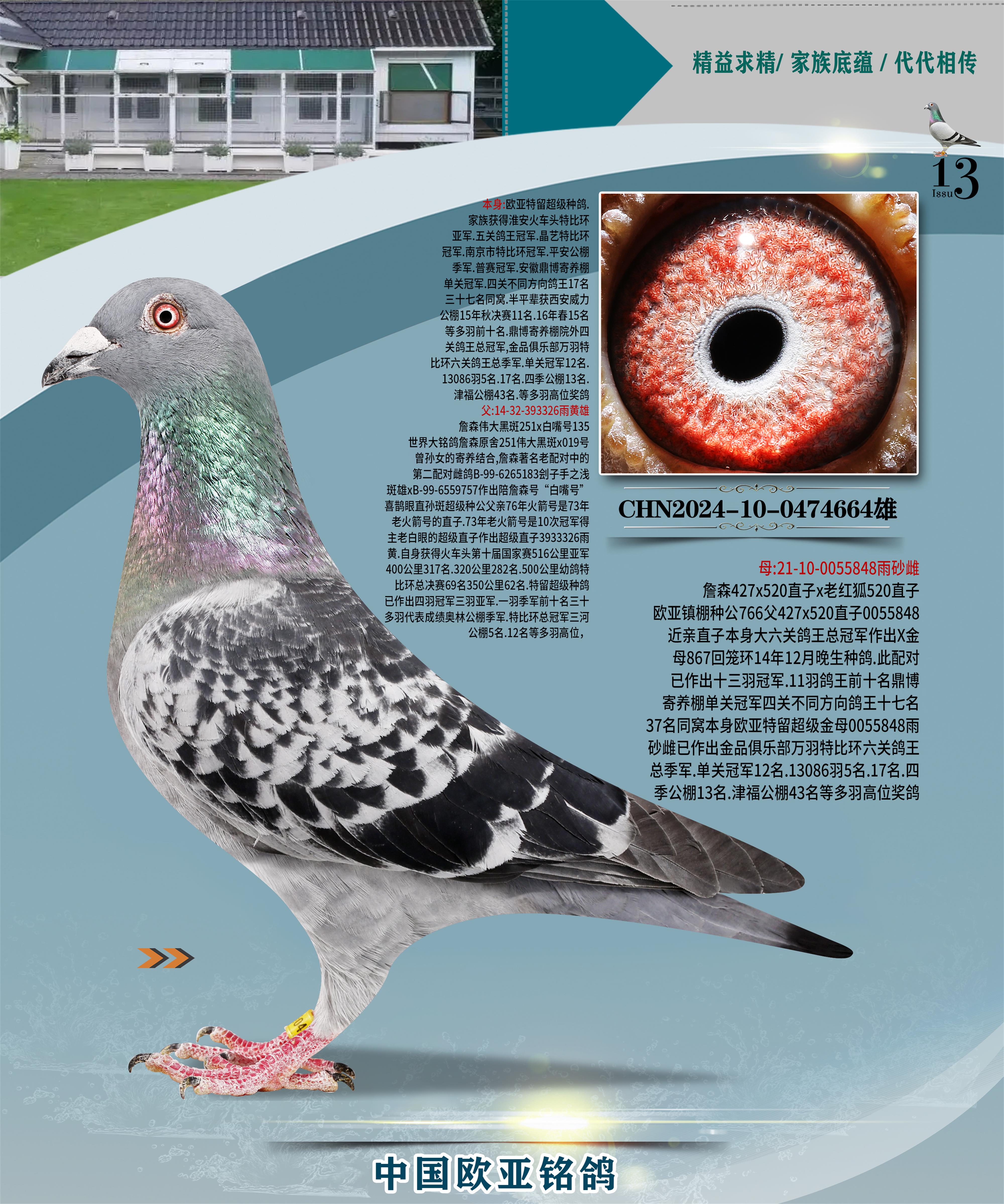 24年秋南京特比环欧亚荣获大团体冠军.小团体冠军551公里大特比13名.14名.16名.19名.20名.21名.24名.26名.27名.28名.42名.52名.54名.57名.65名.66名.68名.70名.71名.72名.74名.76名.80名.82名.83名.84名.85名.86名.90名.92名.110名.116名.121名.122名.128名.131名.158名.161名.164名.165名.166名.172名.174名.177名.182名.195名.196名.201名.205名.208名.210名.216名.253名.269名.275名.276名.294名.296名.299名,,24年秋云南天南铜都公棚决赛415名.天南铜都小棚决赛409名.云南玉活公棚决赛102名.490名.团体32名上笼二羽进二羽,天南铜都大棚506公里决赛445名。热烈祝贺河北省巨鹿县李兰生老师用欧亚泰山号血系连续十一年夺冠军,河北省国家赛冠军.全国季军等多次前十名高位,扬州王军王总用欧亚利奥24年春季获山东翔宇公棚决赛33名盖比53名。南京刘正龙刘总用欧亚盖比获得24年秋山东潍坊国际公棚决赛42名.精英赛30名.三关鸽王71名.决赛86名.加站赛16名.南京市特比环A组鸽王9名.B组鸽王5名.6名.C组鸽王5名.精英赛冠军4名.技能赛A组冠军4名.5名.秦淮区特比环荣获15名.46名.48名.87名。四川西昌徐亮徐总用欧亚利奥获得凉山州聚友决赛177名.第二关亚军双关鸽王19名.三关鸽王105名.云南豪庭公棚决赛603名。热烈祝贺24年四川重庆翔园鸽舍用欧亚泰山号荣获春季400公里冠军.秋季500公里冠军,河北王总用詹森X利奥获得千羽千翔公棚400公里冠军,广东蔡楷焕荣获24年秋爱好者 赛鸽俱乐部三关鸽王季军.一关420公里99名.二关450公里11名.三关520公里32名.单关季军.7名.12名,江西李卫兴荣获贵州红枫公棚8名.共翔俱乐部寄养棚四关综合鸽王30名.一关400公里78名.二关500公里55名.三关520公里37名.四关500公里57名.同父母获公棚18名.雷鸣获得武汉黄浦育翔中心冠军,四川陈文获得四川明鸿俱乐部300公里梦幻2名.3名.4名.9名.10名.13名.14名.15名.31名.34名.40名.41名.42名.43名.69名.71名.72名.73名.74名.94名.95名.97名.98名.99名.419公里决赛荣获总冠军7名.总共归巢9羽,四川徐亮获豪庭决赛603名,山西郑勇获得山西泰鑫公棚决赛255名詹森红狐,热烈祝贺马总获得开尔(飞跃队)决赛9名获奖金1310000万元.第一关52名,天津津福资赛180公里96名.获奖金429543万元,欧亚支持全国鸽友24年秋多人报喜 祝大家取得更好成绩,给欧亚报喜鸽友欧亚决定给每人赠送一羽超级种鸽。欧亚俱乐部特比环多关鸽王成绩:15年秋淮安特比环黑色星期一全会上笼9700多羽,当天无鸽归巢,第二天全会归巢357羽,本舍归巢158羽.前十名八羽.前一百名归巢57羽,16年春季获五关鸽王总冠军,总亚军四名.六名.七名.九名.十名.晶艺俱乐部520公里冠亚季军5名.6名.7名.9名.11名等,火车头冠军.季军6名.8名.9名.10名,16年秋晶艺俱乐部特比环520公里亚军.季军4名.6名.7名.9名,15年春南京白下特比环冠军.亚军.季军6名.7名.8名.9名.10名.指定鸽A B组获得冠军.亚军.季军4名.5名.,17年淮安特比环亚军.4名.5名.7名.8名.10名.六关鸽王总冠军.4名.6名.9名.10名,寄养棚宿迁刘总20羽特比环获冠军.季军.4名.7名.8名.9名等。18年荣获万羽特比环六关鸽王总冠军.总亚军.总季军.6名.8名.十名.单关四羽冠军.二羽亚军.四羽季军.前十名27羽。19年秋万羽特比环六关鸽王总亚军.总季军.5名.8名等,单关二羽冠军.三羽亚军.一羽季军前十名31羽。20年秋淮安市鸽会四关特比环大赛风雨无阻鸽王亚军.鸽王六名,金品俱乐部万羽特比环六关鸽王总冠军,总亚军.四名.五名.六名.七名.八名.十名.前二百名鸽王35羽,单关冠亚季军前十名四十多羽,火车头五关鸽王季军.六名.八名.前二百名鸽王十七羽。20年春荣获淮安五区一市四关鸽王总冠军.亚军.四名.八名.九名。21年秋荣获金品万羽特比环大赛六关鸽王总亚军.总季军.四名.七名.九名.十名.单关冠亚军季军前十名三十多羽。火车头协会鸽王六名.七名.十名.单关前十名十七羽。22年秋荣获鸽王总冠军.总亚军.5名.7名.8名.9名.11名.单关冠亚季军前十名三十多羽,第一关单关前二百名四十多羽,第二关前二百名三十多羽,第三关前二百名四十多羽,第四关前二百名四十多羽,第五关前一百名53羽。23年秋荣获鸽王季军.五名.八名.十名.13名.17名.20名.27名等多羽鸽王.单关前十名二十多羽。公棚.寄养棚部分成绩:16年秋宁夏黄河公棚总冠军电脑戈马力指定通炮冠军,17年送八羽参赛获得鸽王八名进奖四名,支持韩总荣获八名。支持鸽友荣获宁夏中卫公棚决赛总冠军.精英赛冠军,支持18年宁夏黄河公棚决赛冠军詹森X泰山。安徽鼎博寄养棚院内外四关鸽王总冠军.鸽王十七名.三十七名同窝,鸽王39名.42名.58名.67名。18年山东公棚预赛冠军.决赛65名.送八羽进奖五羽.指定获奔驰汽车一辆。支持鸽友获得云南蓝云公棚冠军.盖比X佛卡门。支持鸽友荣获云南银集公棚决赛冠军 詹森427X520血系 速度赛6700羽冠军。17年荣获金马俱乐部寄养棚四关鸽王总冠军.季军.六名.八名.第一关冠军.亚军.季军四名.七名.十一名.金牌教练奖。支持鸽友18年北京费翔公棚预赛九名电脑X桑杰士,支持鸽友荣获陕西威力公棚决赛11名.内蒙古临河寄养棚四关鸽王六名.詹森配泰山,支持河北王总用欧亚詹森427配胡本喜获20年秋开尔青年棚季军。云南东荣公棚16年预赛冠军.决赛77名.17年决赛12名.詹森红狐X泰山,17年平安公棚决赛4名 詹森427。欧亚获得21年金母寄养棚第一关四名.第二关5名.第三关5名.6名.7名.10名.三关鸽王总冠军,四关鸽王14名.十羽鸽王。支持河