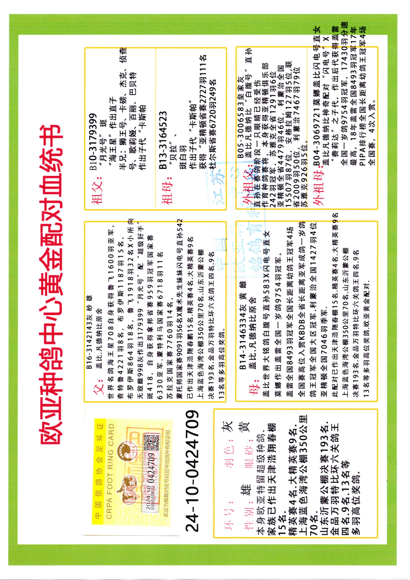 24年秋南京特比环欧亚荣获大团体冠军.小团体冠军551公里大特比13名.14名.16名.19名.20名.21名.24名.26名.27名.28名.42名.52名.54名.57名.65名.66名.68名.70名.71名.72名.74名.76名.80名.82名.83名.84名.85名.86名.90名.92名.110名.116名.121名.122名.128名.131名.158名.161名.164名.165名.166名.172名.174名.177名.182名.195名.196名.201名.205名.208名.210名.216名.253名.269名.275名.276名.294名.296名.299名,,24年秋云南天南铜都公棚决赛415名.天南铜都小棚决赛409名.云南玉活公棚决赛102名.490名.团体32名上笼二羽进二羽,天南铜都大棚506公里决赛445名。热烈祝贺河北省巨鹿县李兰生老师用欧亚泰山号血系连续十一年夺冠军,河北省国家赛冠军.全国季军等多次前十名高位,扬州王军王总用欧亚利奥24年春季获山东翔宇公棚决赛33名盖比53名。南京刘正龙刘总用欧亚盖比获得24年秋山东潍坊国际公棚决赛42名.精英赛30名.三关鸽王71名.决赛86名.加站赛16名.南京市特比环A组鸽王9名.B组鸽王5名.6名.C组鸽王5名.精英赛冠军4名.技能赛A组冠军4名.5名.秦淮区特比环荣获15名.46名.48名.87名。四川西昌徐亮徐总用欧亚利奥获得凉山州聚友决赛177名.第二关亚军双关鸽王19名.三关鸽王105名.云南豪庭公棚决赛603名。热烈祝贺24年四川重庆翔园鸽舍用欧亚泰山号荣获春季400公里冠军.秋季500公里冠军,河北王总用詹森X利奥获得千羽千翔公棚400公里冠军,广东蔡楷焕荣获24年秋爱好者 赛鸽俱乐部三关鸽王季军.一关420公里99名.二关450公里11名.三关520公里32名.单关季军.7名.12名,江西李卫兴荣获贵州红枫公棚8名.共翔俱乐部寄养棚四关综合鸽王30名.一关400公里78名.二关500公里55名.三关520公里37名.四关500公里57名.同父母获公棚18名.雷鸣获得武汉黄浦育翔中心冠军,四川陈文获得四川明鸿俱乐部300公里梦幻2名.3名.4名.9名.10名.13名.14名.15名.31名.34名.40名.41名.42名.43名.69名.71名.72名.73名.74名.94名.95名.97名.98名.99名.419公里决赛荣获总冠军7名.总共归巢9羽,四川徐亮获豪庭决赛603名,山西郑勇获得山西泰鑫公棚决赛255名詹森红狐,热烈祝贺马总获得开尔(飞跃队)决赛9名获奖金1310000万元.第一关52名,天津津福资赛180公里96名.获奖金429543万元,欧亚支持全国鸽友24年秋多人报喜 祝大家取得更好成绩,给欧亚报喜鸽友欧亚决定给每人赠送一羽超级种鸽。欧亚俱乐部特比环多关鸽王成绩:15年秋淮安特比环黑色星期一全会上笼9700多羽,当天无鸽归巢,第二天全会归巢357羽,本舍归巢158羽.前十名八羽.前一百名归巢57羽,16年春季获五关鸽王总冠军,总亚军四名.六名.七名.九名.十名.晶艺俱乐部520公里冠亚季军5名.6名.7名.9名.11名等,火车头冠军.季军6名.8名.9名.10名,16年秋晶艺俱乐部特比环520公里亚军.季军4名.6名.7名.9名,15年春南京白下特比环冠军.亚军.季军6名.7名.8名.9名.10名.指定鸽A B组获得冠军.亚军.季军4名.5名.,17年淮安特比环亚军.4名.5名.7名.8名.10名.六关鸽王总冠军.4名.6名.9名.10名,寄养棚宿迁刘总20羽特比环获冠军.季军.4名.7名.8名.9名等。18年荣获万羽特比环六关鸽王总冠军.总亚军.总季军.6名.8名.十名.单关四羽冠军.二羽亚军.四羽季军.前十名27羽。19年秋万羽特比环六关鸽王总亚军.总季军.5名.8名等,单关二羽冠军.三羽亚军.一羽季军前十名31羽。20年秋淮安市鸽会四关特比环大赛风雨无阻鸽王亚军.鸽王六名,金品俱乐部万羽特比环六关鸽王总冠军,总亚军.四名.五名.六名.七名.八名.十名.前二百名鸽王35羽,单关冠亚季军前十名四十多羽,火车头五关鸽王季军.六名.八名.前二百名鸽王十七羽。20年春荣获淮安五区一市四关鸽王总冠军.亚军.四名.八名.九名。21年秋荣获金品万羽特比环大赛六关鸽王总亚军.总季军.四名.七名.九名.十名.单关冠亚军季军前十名三十多羽。火车头协会鸽王六名.七名.十名.单关前十名十七羽。22年秋荣获鸽王总冠军.总亚军.5名.7名.8名.9名.11名.单关冠亚季军前十名三十多羽,第一关单关前二百名四十多羽,第二关前二百名三十多羽,第三关前二百名四十多羽,第四关前二百名四十多羽,第五关前一百名53羽。23年秋荣获鸽王季军.五名.八名.十名.13名.17名.20名.27名等多羽鸽王.单关前十名二十多羽。公棚.寄养棚部分成绩:16年秋宁夏黄河公棚总冠军电脑戈马力指定通炮冠军,17年送八羽参赛获得鸽王八名进奖四名,支持韩总荣获八名。支持鸽友荣获宁夏中卫公棚决赛总冠军.精英赛冠军,支持18年宁夏黄河公棚决赛冠军詹森X泰山。安徽鼎博寄养棚院内外四关鸽王总冠军.鸽王十七名.三十七名同窝,鸽王39名.42名.58名.67名。18年山东公棚预赛冠军.决赛65名.送八羽进奖五羽.指定获奔驰汽车一辆。支持鸽友获得云南蓝云公棚冠军.盖比X佛卡门。支持鸽友荣获云南银集公棚决赛冠军 詹森427X520血系 速度赛6700羽冠军。17年荣获金马俱乐部寄养棚四关鸽王总冠军.季军.六名.八名.第一关冠军.亚军.季军四名.七名.十一名.金牌教练奖。支持鸽友18年北京费翔公棚预赛九名电脑X桑杰士,支持鸽友荣获陕西威力公棚决赛11名.内蒙古临河寄养棚四关鸽王六名.詹森配泰山,支持河北王总用欧亚詹森427配胡本喜获20年秋开尔青年棚季军。云南东荣公棚16年预赛冠军.决赛77名.17年决赛12名.詹森红狐X泰山,17年平安公棚决赛4名 詹森427。欧亚获得21年金母寄养棚第一关四名.第二关5名.第三关5名.6名.7名.10名.三关鸽王总冠军,四关鸽王14名.十羽鸽王。支持河