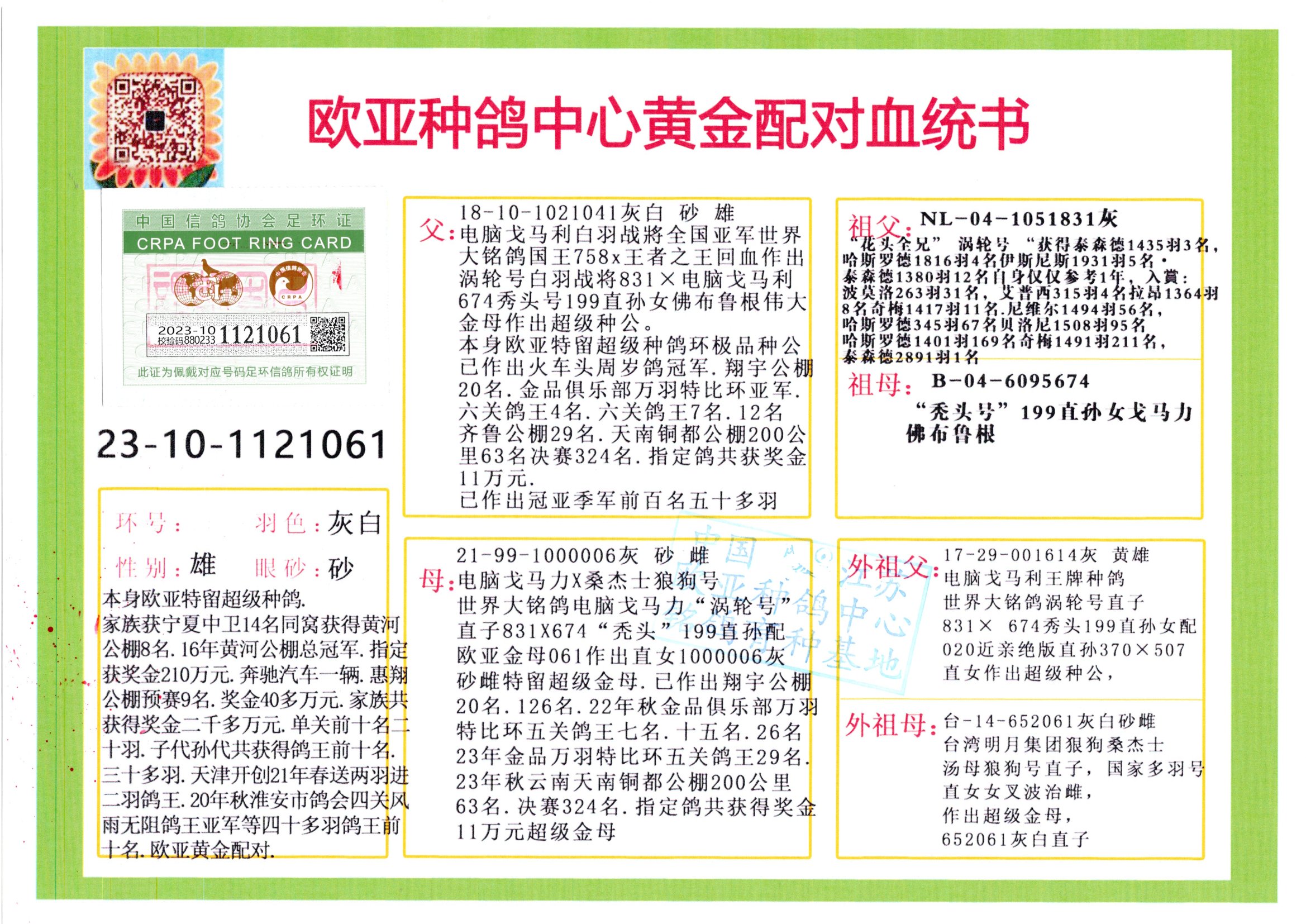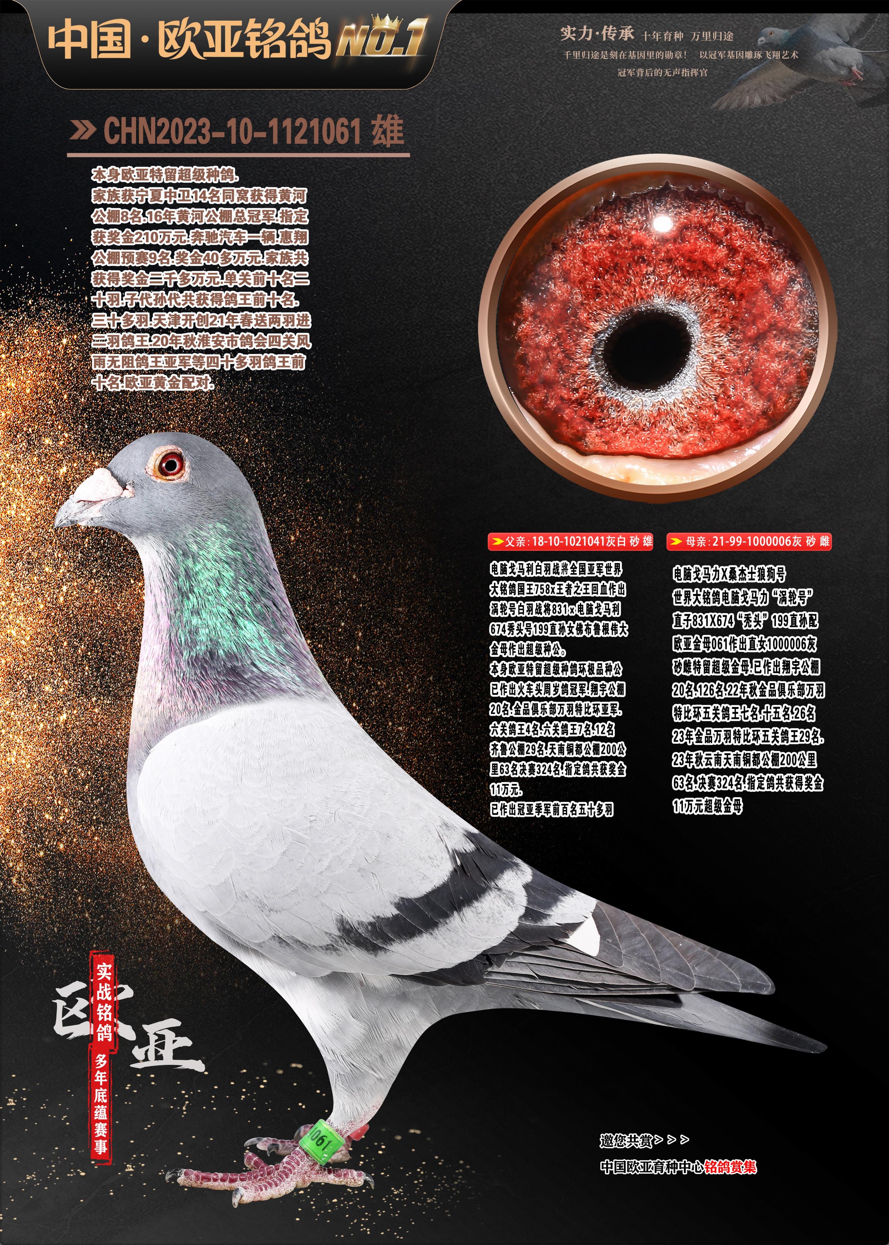 24年秋南京特比环欧亚荣获大团体冠军.小团体冠军551公里大特比13名.14名.16名.19名.20名.21名.24名.26名.27名.28名.42名.52名.54名.57名.65名.66名.68名.70名.71名.72名.74名.76名.80名.82名.83名.84名.85名.86名.90名.92名.110名.116名.121名.122名.128名.131名.158名.161名.164名.165名.166名.172名.174名.177名.182名.195名.196名.201名.205名.208名.210名.216名.253名.269名.275名.276名.294名.296名.299名,,24年秋云南天南铜都公棚决赛415名.天南铜都小棚决赛409名.云南玉活公棚决赛102名.490名.团体32名上笼二羽进二羽,天南铜都大棚506公里决赛445名。热烈祝贺河北省巨鹿县李兰生老师用欧亚泰山号血系连续十一年夺冠军,河北省国家赛冠军.全国季军等多次前十名高位,扬州王军王总用欧亚利奥24年春季获山东翔宇公棚决赛33名盖比53名。南京刘正龙刘总用欧亚盖比获得24年秋山东潍坊国际公棚决赛42名.精英赛30名.三关鸽王71名.决赛86名.加站赛16名.南京市特比环A组鸽王9名.B组鸽王5名.6名.C组鸽王5名.精英赛冠军4名.技能赛A组冠军4名.5名.秦淮区特比环荣获15名.46名.48名.87名。四川西昌徐亮徐总用欧亚利奥获得凉山州聚友决赛177名.第二关亚军双关鸽王19名.三关鸽王105名.云南豪庭公棚决赛603名。热烈祝贺24年四川重庆翔园鸽舍用欧亚泰山号荣获春季400公里冠军.秋季500公里冠军,河北王总用詹森X利奥获得千羽千翔公棚400公里冠军,广东蔡楷焕荣获24年秋爱好者 赛鸽俱乐部三关鸽王季军.一关420公里99名.二关450公里11名.三关520公里32名.单关季军.7名.12名,江西李卫兴荣获贵州红枫公棚8名.共翔俱乐部寄养棚四关综合鸽王30名.一关400公里78名.二关500公里55名.三关520公里37名.四关500公里57名.同父母获公棚18名.雷鸣获得武汉黄浦育翔中心冠军,四川陈文获得四川明鸿俱乐部300公里梦幻2名.3名.4名.9名.10名.13名.14名.15名.31名.34名.40名.41名.42名.43名.69名.71名.72名.73名.74名.94名.95名.97名.98名.99名.419公里决赛荣获总冠军7名.总共归巢9羽,四川徐亮获豪庭决赛603名,山西郑勇获得山西泰鑫公棚决赛255名詹森红狐,热烈祝贺马总获得开尔(飞跃队)决赛9名获奖金1310000万元.第一关52名,天津津福资赛180公里96名.获奖金429543万元,欧亚支持全国鸽友24年秋多人报喜 祝大家取得更好成绩,给欧亚报喜鸽友欧亚决定给每人赠送一羽超级种鸽。欧亚俱乐部特比环多关鸽王成绩:15年秋淮安特比环黑色星期一全会上笼9700多羽,当天无鸽归巢,第二天全会归巢357羽,本舍归巢158羽.前十名八羽.前一百名归巢57羽,16年春季获五关鸽王总冠军,总亚军四名.六名.七名.九名.十名.晶艺俱乐部520公里冠亚季军5名.6名.7名.9名.11名等,火车头冠军.季军6名.8名.9名.10名,16年秋晶艺俱乐部特比环520公里亚军.季军4名.6名.7名.9名,15年春南京白下特比环冠军.亚军.季军6名.7名.8名.9名.10名.指定鸽A B组获得冠军.亚军.季军4名.5名.,17年淮安特比环亚军.4名.5名.7名.8名.10名.六关鸽王总冠军.4名.6名.9名.10名,寄养棚宿迁刘总20羽特比环获冠军.季军.4名.7名.8名.9名等。18年荣获万羽特比环六关鸽王总冠军.总亚军.总季军.6名.8名.十名.单关四羽冠军.二羽亚军.四羽季军.前十名27羽。19年秋万羽特比环六关鸽王总亚军.总季军.5名.8名等,单关二羽冠军.三羽亚军.一羽季军前十名31羽。20年秋淮安市鸽会四关特比环大赛风雨无阻鸽王亚军.鸽王六名,金品俱乐部万羽特比环六关鸽王总冠军,总亚军.四名.五名.六名.七名.八名.十名.前二百名鸽王35羽,单关冠亚季军前十名四十多羽,火车头五关鸽王季军.六名.八名.前二百名鸽王十七羽。20年春荣获淮安五区一市四关鸽王总冠军.亚军.四名.八名.九名。21年秋荣获金品万羽特比环大赛六关鸽王总亚军.总季军.四名.七名.九名.十名.单关冠亚军季军前十名三十多羽。火车头协会鸽王六名.七名.十名.单关前十名十七羽。22年秋荣获鸽王总冠军.总亚军.5名.7名.8名.9名.11名.单关冠亚季军前十名三十多羽,第一关单关前二百名四十多羽,第二关前二百名三十多羽,第三关前二百名四十多羽,第四关前二百名四十多羽,第五关前一百名53羽。23年秋荣获鸽王季军.五名.八名.十名.13名.17名.20名.27名等多羽鸽王.单关前十名二十多羽。公棚.寄养棚部分成绩:16年秋宁夏黄河公棚总冠军电脑戈马力指定通炮冠军,17年送八羽参赛获得鸽王八名进奖四名,支持韩总荣获八名。支持鸽友荣获宁夏中卫公棚决赛总冠军.精英赛冠军,支持18年宁夏黄河公棚决赛冠军詹森X泰山。安徽鼎博寄养棚院内外四关鸽王总冠军.鸽王十七名.三十七名同窝,鸽王39名.42名.58名.67名。18年山东公棚预赛冠军.决赛65名.送八羽进奖五羽.指定获奔驰汽车一辆。支持鸽友获得云南蓝云公棚冠军.盖比X佛卡门。支持鸽友荣获云南银集公棚决赛冠军 詹森427X520血系 速度赛6700羽冠军。17年荣获金马俱乐部寄养棚四关鸽王总冠军.季军.六名.八名.第一关冠军.亚军.季军四名.七名.十一名.金牌教练奖。支持鸽友18年北京费翔公棚预赛九名电脑X桑杰士,支持鸽友荣获陕西威力公棚决赛11名.内蒙古临河寄养棚四关鸽王六名.詹森配泰山,支持河北王总用欧亚詹森427配胡本喜获20年秋开尔青年棚季军。云南东荣公棚16年预赛冠军.决赛77名.17年决赛12名.詹森红狐X泰山,17年平安公棚决赛4名 詹森427。欧亚获得21年金母寄养棚第一关四名.第二关5名.第三关5名.6名.7名.10名.三关鸽王总冠军,四关鸽王14名.十羽鸽王。支持河
