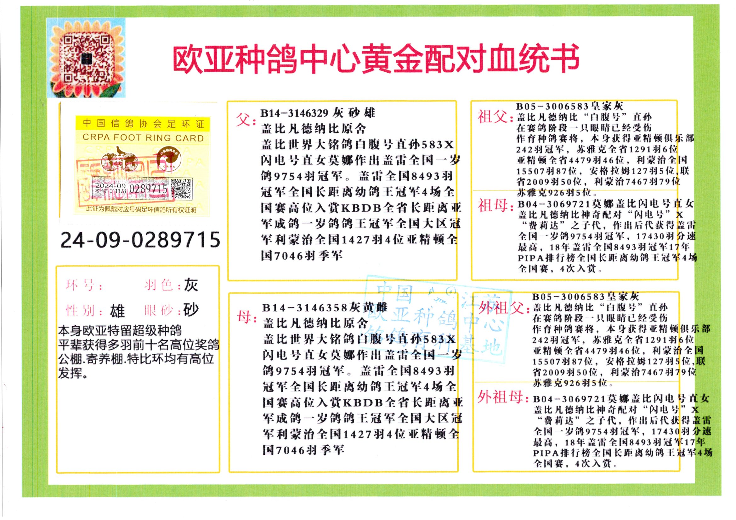 24年秋南京特比环欧亚荣获大团体冠军.小团体冠军551公里大特比13名.14名.16名.19名.20名.21名.24名.26名.27名.28名.42名.52名.54名.57名.65名.66名.68名.70名.71名.72名.74名.76名.80名.82名.83名.84名.85名.86名.90名.92名.110名.116名.121名.122名.128名.131名.158名.161名.164名.165名.166名.172名.174名.177名.182名.195名.196名.201名.205名.208名.210名.216名.253名.269名.275名.276名.294名.296名.299名,,24年秋云南天南铜都公棚决赛415名.天南铜都小棚决赛409名.云南玉活公棚决赛102名.490名.团体32名上笼二羽进二羽,天南铜都大棚506公里决赛445名。热烈祝贺河北省巨鹿县李兰生老师用欧亚泰山号血系连续十一年夺冠军,河北省国家赛冠军.全国季军等多次前十名高位,扬州王军王总用欧亚利奥24年春季获山东翔宇公棚决赛33名盖比53名。南京刘正龙刘总用欧亚盖比获得24年秋山东潍坊国际公棚决赛42名.精英赛30名.三关鸽王71名.决赛86名.加站赛16名.南京市特比环A组鸽王9名.B组鸽王5名.6名.C组鸽王5名.精英赛冠军4名.技能赛A组冠军4名.5名.秦淮区特比环荣获15名.46名.48名.87名。四川西昌徐亮徐总用欧亚利奥获得凉山州聚友决赛177名.第二关亚军双关鸽王19名.三关鸽王105名.云南豪庭公棚决赛603名。热烈祝贺24年四川重庆翔园鸽舍用欧亚泰山号荣获春季400公里冠军.秋季500公里冠军,河北王总用詹森X利奥获得千羽千翔公棚400公里冠军,广东蔡楷焕荣获24年秋爱好者 赛鸽俱乐部三关鸽王季军.一关420公里99名.二关450公里11名.三关520公里32名.单关季军.7名.12名,江西李卫兴荣获贵州红枫公棚8名.共翔俱乐部寄养棚四关综合鸽王30名.一关400公里78名.二关500公里55名.三关520公里37名.四关500公里57名.同父母获公棚18名.雷鸣获得武汉黄浦育翔中心冠军,四川陈文获得四川明鸿俱乐部300公里梦幻2名.3名.4名.9名.10名.13名.14名.15名.31名.34名.40名.41名.42名.43名.69名.71名.72名.73名.74名.94名.95名.97名.98名.99名.419公里决赛荣获总冠军7名.总共归巢9羽,四川徐亮获豪庭决赛603名,山西郑勇获得山西泰鑫公棚决赛255名詹森红狐,热烈祝贺马总获得开尔(飞跃队)决赛9名获奖金1310000万元.第一关52名,天津津福资赛180公里96名.获奖金429543万元,欧亚支持全国鸽友24年秋多人报喜 祝大家取得更好成绩,给欧亚报喜鸽友欧亚决定给每人赠送一羽超级种鸽。欧亚俱乐部特比环多关鸽王成绩:15年秋淮安特比环黑色星期一全会上笼9700多羽,当天无鸽归巢,第二天全会归巢357羽,本舍归巢158羽.前十名八羽.前一百名归巢57羽,16年春季获五关鸽王总冠军,总亚军四名.六名.七名.九名.十名.晶艺俱乐部520公里冠亚季军5名.6名.7名.9名.11名等,火车头冠军.季军6名.8名.9名.10名,16年秋晶艺俱乐部特比环520公里亚军.季军4名.6名.7名.9名,15年春南京白下特比环冠军.亚军.季军6名.7名.8名.9名.10名.指定鸽A B组获得冠军.亚军.季军4名.5名.,17年淮安特比环亚军.4名.5名.7名.8名.10名.六关鸽王总冠军.4名.6名.9名.10名,寄养棚宿迁刘总20羽特比环获冠军.季军.4名.7名.8名.9名等。18年荣获万羽特比环六关鸽王总冠军.总亚军.总季军.6名.8名.十名.单关四羽冠军.二羽亚军.四羽季军.前十名27羽。19年秋万羽特比环六关鸽王总亚军.总季军.5名.8名等,单关二羽冠军.三羽亚军.一羽季军前十名31羽。20年秋淮安市鸽会四关特比环大赛风雨无阻鸽王亚军.鸽王六名,金品俱乐部万羽特比环六关鸽王总冠军,总亚军.四名.五名.六名.七名.八名.十名.前二百名鸽王35羽,单关冠亚季军前十名四十多羽,火车头五关鸽王季军.六名.八名.前二百名鸽王十七羽。20年春荣获淮安五区一市四关鸽王总冠军.亚军.四名.八名.九名。21年秋荣获金品万羽特比环大赛六关鸽王总亚军.总季军.四名.七名.九名.十名.单关冠亚军季军前十名三十多羽。火车头协会鸽王六名.七名.十名.单关前十名十七羽。22年秋荣获鸽王总冠军.总亚军.5名.7名.8名.9名.11名.单关冠亚季军前十名三十多羽,第一关单关前二百名四十多羽,第二关前二百名三十多羽,第三关前二百名四十多羽,第四关前二百名四十多羽,第五关前一百名53羽。23年秋荣获鸽王季军.五名.八名.十名.13名.17名.20名.27名等多羽鸽王.单关前十名二十多羽。公棚.寄养棚部分成绩:16年秋宁夏黄河公棚总冠军电脑戈马力指定通炮冠军,17年送八羽参赛获得鸽王八名进奖四名,支持韩总荣获八名。支持鸽友荣获宁夏中卫公棚决赛总冠军.精英赛冠军,支持18年宁夏黄河公棚决赛冠军詹森X泰山。安徽鼎博寄养棚院内外四关鸽王总冠军.鸽王十七名.三十七名同窝,鸽王39名.42名.58名.67名。18年山东公棚预赛冠军.决赛65名.送八羽进奖五羽.指定获奔驰汽车一辆。支持鸽友获得云南蓝云公棚冠军.盖比X佛卡门。支持鸽友荣获云南银集公棚决赛冠军 詹森427X520血系 速度赛6700羽冠军。17年荣获金马俱乐部寄养棚四关鸽王总冠军.季军.六名.八名.第一关冠军.亚军.季军四名.七名.十一名.金牌教练奖。支持鸽友18年北京费翔公棚预赛九名电脑X桑杰士,支持鸽友荣获陕西威力公棚决赛11名.内蒙古临河寄养棚四关鸽王六名.詹森配泰山,支持河北王总用欧亚詹森427配胡本喜获20年秋开尔青年棚季军。云南东荣公棚16年预赛冠军.决赛77名.17年决赛12名.詹森红狐X泰山,17年平安公棚决赛4名 詹森427。欧亚获得21年金母寄养棚第一关四名.第二关5名.第三关5名.6名.7名.10名.三关鸽王总冠军,四关鸽王14名.十羽鸽王。支持河