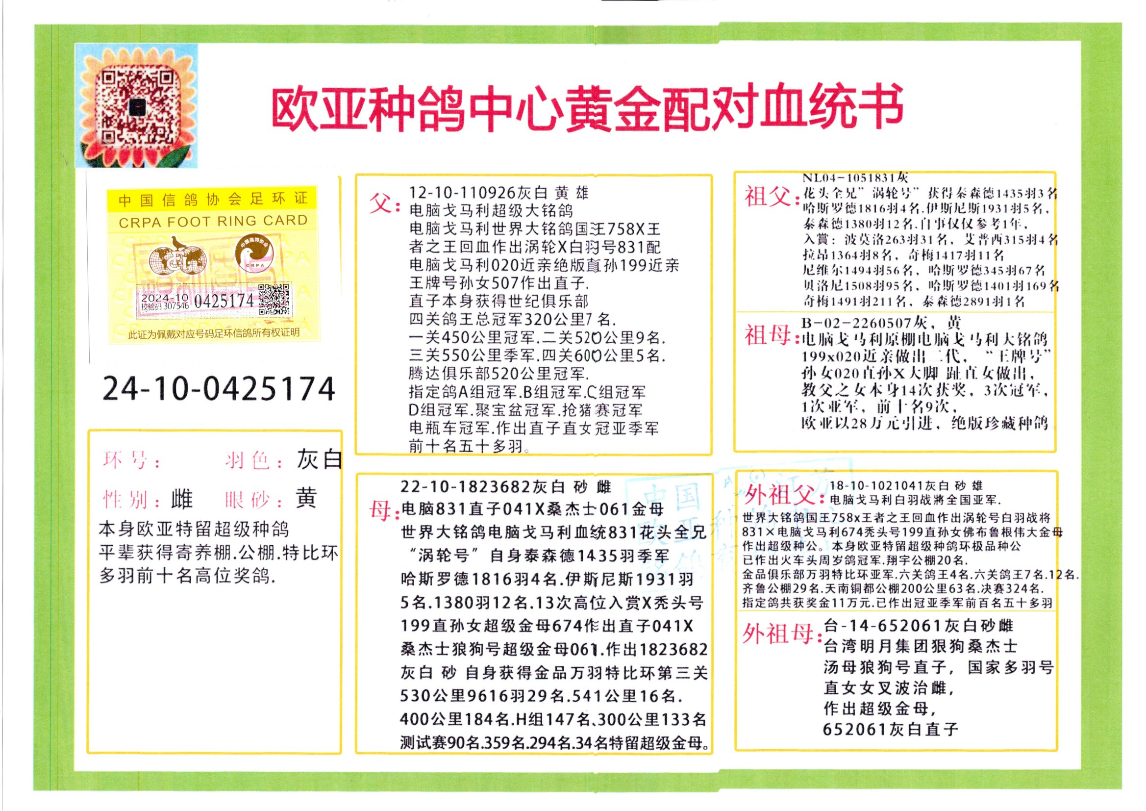 24年秋南京特比环欧亚荣获大团体冠军.小团体冠军551公里大特比13名.14名.16名.19名.20名.21名.24名.26名.27名.28名.42名.52名.54名.57名.65名.66名.68名.70名.71名.72名.74名.76名.80名.82名.83名.84名.85名.86名.90名.92名.110名.116名.121名.122名.128名.131名.158名.161名.164名.165名.166名.172名.174名.177名.182名.195名.196名.201名.205名.208名.210名.216名.253名.269名.275名.276名.294名.296名.299名,,24年秋云南天南铜都公棚决赛415名.天南铜都小棚决赛409名.云南玉活公棚决赛102名.490名.团体32名上笼二羽进二羽,天南铜都大棚506公里决赛445名。热烈祝贺河北省巨鹿县李兰生老师用欧亚泰山号血系连续十一年夺冠军,河北省国家赛冠军.全国季军等多次前十名高位,扬州王军王总用欧亚利奥24年春季获山东翔宇公棚决赛33名盖比53名。南京刘正龙刘总用欧亚盖比获得24年秋山东潍坊国际公棚决赛42名.精英赛30名.三关鸽王71名.决赛86名.加站赛16名.南京市特比环A组鸽王9名.B组鸽王5名.6名.C组鸽王5名.精英赛冠军4名.技能赛A组冠军4名.5名.秦淮区特比环荣获15名.46名.48名.87名。四川西昌徐亮徐总用欧亚利奥获得凉山州聚友决赛177名.第二关亚军双关鸽王19名.三关鸽王105名.云南豪庭公棚决赛603名。热烈祝贺24年四川重庆翔园鸽舍用欧亚泰山号荣获春季400公里冠军.秋季500公里冠军,河北王总用詹森X利奥获得千羽千翔公棚400公里冠军,广东蔡楷焕荣获24年秋爱好者 赛鸽俱乐部三关鸽王季军.一关420公里99名.二关450公里11名.三关520公里32名.单关季军.7名.12名,江西李卫兴荣获贵州红枫公棚8名.共翔俱乐部寄养棚四关综合鸽王30名.一关400公里78名.二关500公里55名.三关520公里37名.四关500公里57名.同父母获公棚18名.雷鸣获得武汉黄浦育翔中心冠军,四川陈文获得四川明鸿俱乐部300公里梦幻2名.3名.4名.9名.10名.13名.14名.15名.31名.34名.40名.41名.42名.43名.69名.71名.72名.73名.74名.94名.95名.97名.98名.99名.419公里决赛荣获总冠军7名.总共归巢9羽,四川徐亮获豪庭决赛603名,山西郑勇获得山西泰鑫公棚决赛255名詹森红狐,热烈祝贺马总获得开尔(飞跃队)决赛9名获奖金1310000万元.第一关52名,天津津福资赛180公里96名.获奖金429543万元,欧亚支持全国鸽友24年秋多人报喜 祝大家取得更好成绩,给欧亚报喜鸽友欧亚决定给每人赠送一羽超级种鸽。欧亚俱乐部特比环多关鸽王成绩:15年秋淮安特比环黑色星期一全会上笼9700多羽,当天无鸽归巢,第二天全会归巢357羽,本舍归巢158羽.前十名八羽.前一百名归巢57羽,16年春季获五关鸽王总冠军,总亚军四名.六名.七名.九名.十名.晶艺俱乐部520公里冠亚季军5名.6名.7名.9名.11名等,火车头冠军.季军6名.8名.9名.10名,16年秋晶艺俱乐部特比环520公里亚军.季军4名.6名.7名.9名,15年春南京白下特比环冠军.亚军.季军6名.7名.8名.9名.10名.指定鸽A B组获得冠军.亚军.季军4名.5名.,17年淮安特比环亚军.4名.5名.7名.8名.10名.六关鸽王总冠军.4名.6名.9名.10名,寄养棚宿迁刘总20羽特比环获冠军.季军.4名.7名.8名.9名等。18年荣获万羽特比环六关鸽王总冠军.总亚军.总季军.6名.8名.十名.单关四羽冠军.二羽亚军.四羽季军.前十名27羽。19年秋万羽特比环六关鸽王总亚军.总季军.5名.8名等,单关二羽冠军.三羽亚军.一羽季军前十名31羽。20年秋淮安市鸽会四关特比环大赛风雨无阻鸽王亚军.鸽王六名,金品俱乐部万羽特比环六关鸽王总冠军,总亚军.四名.五名.六名.七名.八名.十名.前二百名鸽王35羽,单关冠亚季军前十名四十多羽,火车头五关鸽王季军.六名.八名.前二百名鸽王十七羽。20年春荣获淮安五区一市四关鸽王总冠军.亚军.四名.八名.九名。21年秋荣获金品万羽特比环大赛六关鸽王总亚军.总季军.四名.七名.九名.十名.单关冠亚军季军前十名三十多羽。火车头协会鸽王六名.七名.十名.单关前十名十七羽。22年秋荣获鸽王总冠军.总亚军.5名.7名.8名.9名.11名.单关冠亚季军前十名三十多羽,第一关单关前二百名四十多羽,第二关前二百名三十多羽,第三关前二百名四十多羽,第四关前二百名四十多羽,第五关前一百名53羽。23年秋荣获鸽王季军.五名.八名.十名.13名.17名.20名.27名等多羽鸽王.单关前十名二十多羽。公棚.寄养棚部分成绩:16年秋宁夏黄河公棚总冠军电脑戈马力指定通炮冠军,17年送八羽参赛获得鸽王八名进奖四名,支持韩总荣获八名。支持鸽友荣获宁夏中卫公棚决赛总冠军.精英赛冠军,支持18年宁夏黄河公棚决赛冠军詹森X泰山。安徽鼎博寄养棚院内外四关鸽王总冠军.鸽王十七名.三十七名同窝,鸽王39名.42名.58名.67名。18年山东公棚预赛冠军.决赛65名.送八羽进奖五羽.指定获奔驰汽车一辆。支持鸽友获得云南蓝云公棚冠军.盖比X佛卡门。支持鸽友荣获云南银集公棚决赛冠军 詹森427X520血系 速度赛6700羽冠军。17年荣获金马俱乐部寄养棚四关鸽王总冠军.季军.六名.八名.第一关冠军.亚军.季军四名.七名.十一名.金牌教练奖。支持鸽友18年北京费翔公棚预赛九名电脑X桑杰士,支持鸽友荣获陕西威力公棚决赛11名.内蒙古临河寄养棚四关鸽王六名.詹森配泰山,支持河北王总用欧亚詹森427配胡本喜获20年秋开尔青年棚季军。云南东荣公棚16年预赛冠军.决赛77名.17年决赛12名.詹森红狐X泰山,17年平安公棚决赛4名 詹森427。欧亚获得21年金母寄养棚第一关四名.第二关5名.第三关5名.6名.7名.10名.三关鸽王总冠军,四关鸽王14名.十羽鸽王。支持河