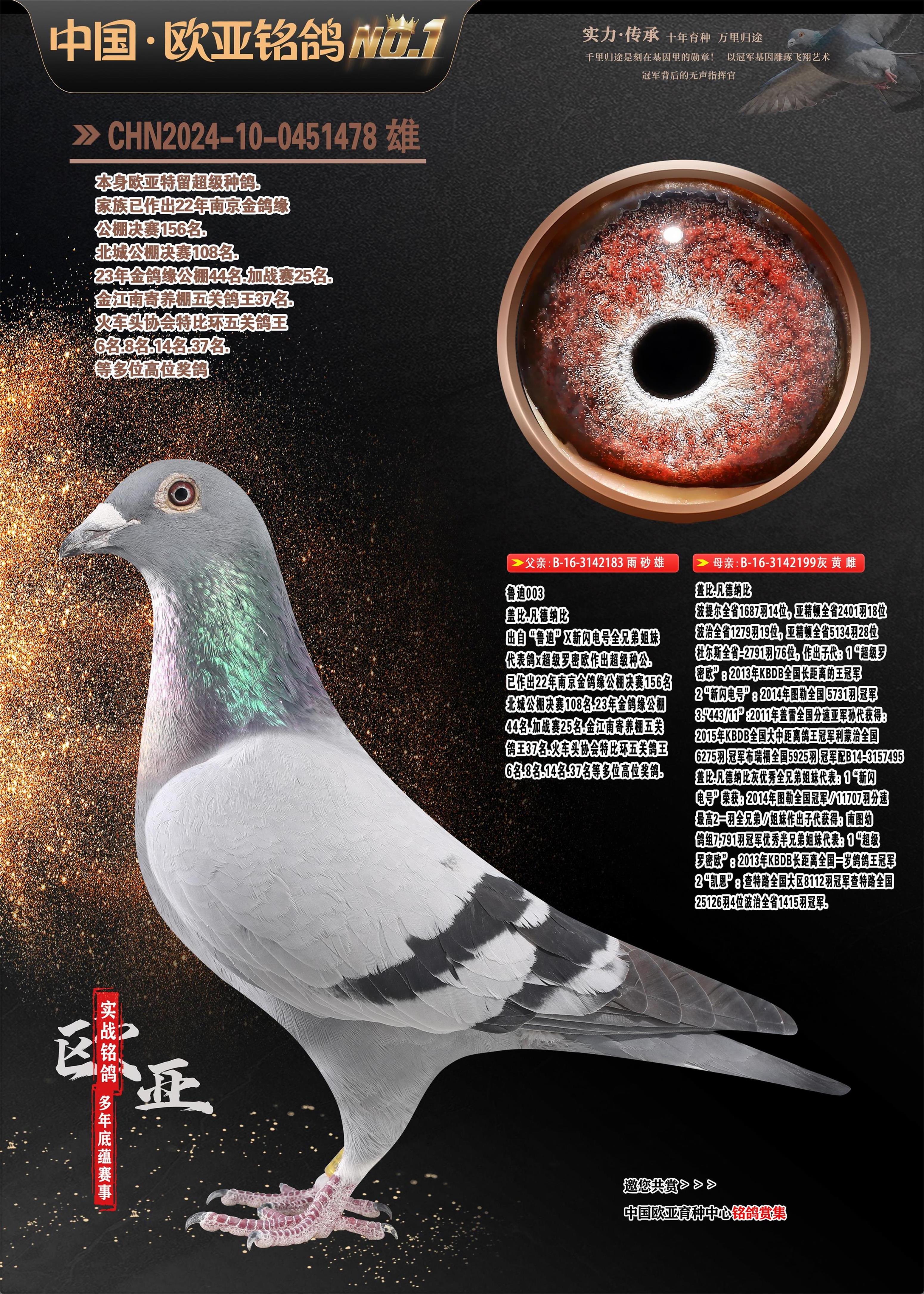 24年秋南京特比环欧亚荣获大团体冠军.小团体冠军551公里大特比13名.14名.16名.19名.20名.21名.24名.26名.27名.28名.42名.52名.54名.57名.65名.66名.68名.70名.71名.72名.74名.76名.80名.82名.83名.84名.85名.86名.90名.92名.110名.116名.121名.122名.128名.131名.158名.161名.164名.165名.166名.172名.174名.177名.182名.195名.196名.201名.205名.208名.210名.216名.253名.269名.275名.276名.294名.296名.299名,,24年秋云南天南铜都公棚决赛415名.天南铜都小棚决赛409名.云南玉活公棚决赛102名.490名.团体32名上笼二羽进二羽,天南铜都大棚506公里决赛445名。热烈祝贺河北省巨鹿县李兰生老师用欧亚泰山号血系连续十一年夺冠军,河北省国家赛冠军.全国季军等多次前十名高位,扬州王军王总用欧亚利奥24年春季获山东翔宇公棚决赛33名盖比53名。南京刘正龙刘总用欧亚盖比获得24年秋山东潍坊国际公棚决赛42名.精英赛30名.三关鸽王71名.决赛86名.加站赛16名.南京市特比环A组鸽王9名.B组鸽王5名.6名.C组鸽王5名.精英赛冠军4名.技能赛A组冠军4名.5名.秦淮区特比环荣获15名.46名.48名.87名。四川西昌徐亮徐总用欧亚利奥获得凉山州聚友决赛177名.第二关亚军双关鸽王19名.三关鸽王105名.云南豪庭公棚决赛603名。热烈祝贺24年四川重庆翔园鸽舍用欧亚泰山号荣获春季400公里冠军.秋季500公里冠军,河北王总用詹森X利奥获得千羽千翔公棚400公里冠军,广东蔡楷焕荣获24年秋爱好者 赛鸽俱乐部三关鸽王季军.一关420公里99名.二关450公里11名.三关520公里32名.单关季军.7名.12名,江西李卫兴荣获贵州红枫公棚8名.共翔俱乐部寄养棚四关综合鸽王30名.一关400公里78名.二关500公里55名.三关520公里37名.四关500公里57名.同父母获公棚18名.雷鸣获得武汉黄浦育翔中心冠军,四川陈文获得四川明鸿俱乐部300公里梦幻2名.3名.4名.9名.10名.13名.14名.15名.31名.34名.40名.41名.42名.43名.69名.71名.72名.73名.74名.94名.95名.97名.98名.99名.419公里决赛荣获总冠军7名.总共归巢9羽,四川徐亮获豪庭决赛603名,山西郑勇获得山西泰鑫公棚决赛255名詹森红狐,热烈祝贺马总获得开尔(飞跃队)决赛9名获奖金1310000万元.第一关52名,天津津福资赛180公里96名.获奖金429543万元,欧亚支持全国鸽友24年秋多人报喜 祝大家取得更好成绩,给欧亚报喜鸽友欧亚决定给每人赠送一羽超级种鸽。欧亚俱乐部特比环多关鸽王成绩:15年秋淮安特比环黑色星期一全会上笼9700多羽,当天无鸽归巢,第二天全会归巢357羽,本舍归巢158羽.前十名八羽.前一百名归巢57羽,16年春季获五关鸽王总冠军,总亚军四名.六名.七名.九名.十名.晶艺俱乐部520公里冠亚季军5名.6名.7名.9名.11名等,火车头冠军.季军6名.8名.9名.10名,16年秋晶艺俱乐部特比环520公里亚军.季军4名.6名.7名.9名,15年春南京白下特比环冠军.亚军.季军6名.7名.8名.9名.10名.指定鸽A B组获得冠军.亚军.季军4名.5名.,17年淮安特比环亚军.4名.5名.7名.8名.10名.六关鸽王总冠军.4名.6名.9名.10名,寄养棚宿迁刘总20羽特比环获冠军.季军.4名.7名.8名.9名等。18年荣获万羽特比环六关鸽王总冠军.总亚军.总季军.6名.8名.十名.单关四羽冠军.二羽亚军.四羽季军.前十名27羽。19年秋万羽特比环六关鸽王总亚军.总季军.5名.8名等,单关二羽冠军.三羽亚军.一羽季军前十名31羽。20年秋淮安市鸽会四关特比环大赛风雨无阻鸽王亚军.鸽王六名,金品俱乐部万羽特比环六关鸽王总冠军,总亚军.四名.五名.六名.七名.八名.十名.前二百名鸽王35羽,单关冠亚季军前十名四十多羽,火车头五关鸽王季军.六名.八名.前二百名鸽王十七羽。20年春荣获淮安五区一市四关鸽王总冠军.亚军.四名.八名.九名。21年秋荣获金品万羽特比环大赛六关鸽王总亚军.总季军.四名.七名.九名.十名.单关冠亚军季军前十名三十多羽。火车头协会鸽王六名.七名.十名.单关前十名十七羽。22年秋荣获鸽王总冠军.总亚军.5名.7名.8名.9名.11名.单关冠亚季军前十名三十多羽,第一关单关前二百名四十多羽,第二关前二百名三十多羽,第三关前二百名四十多羽,第四关前二百名四十多羽,第五关前一百名53羽。23年秋荣获鸽王季军.五名.八名.十名.13名.17名.20名.27名等多羽鸽王.单关前十名二十多羽。公棚.寄养棚部分成绩:16年秋宁夏黄河公棚总冠军电脑戈马力指定通炮冠军,17年送八羽参赛获得鸽王八名进奖四名,支持韩总荣获八名。支持鸽友荣获宁夏中卫公棚决赛总冠军.精英赛冠军,支持18年宁夏黄河公棚决赛冠军詹森X泰山。安徽鼎博寄养棚院内外四关鸽王总冠军.鸽王十七名.三十七名同窝,鸽王39名.42名.58名.67名。18年山东公棚预赛冠军.决赛65名.送八羽进奖五羽.指定获奔驰汽车一辆。支持鸽友获得云南蓝云公棚冠军.盖比X佛卡门。支持鸽友荣获云南银集公棚决赛冠军 詹森427X520血系 速度赛6700羽冠军。17年荣获金马俱乐部寄养棚四关鸽王总冠军.季军.六名.八名.第一关冠军.亚军.季军四名.七名.十一名.金牌教练奖。支持鸽友18年北京费翔公棚预赛九名电脑X桑杰士,支持鸽友荣获陕西威力公棚决赛11名.内蒙古临河寄养棚四关鸽王六名.詹森配泰山,支持河北王总用欧亚詹森427配胡本喜获20年秋开尔青年棚季军。云南东荣公棚16年预赛冠军.决赛77名.17年决赛12名.詹森红狐X泰山,17年平安公棚决赛4名 詹森427。欧亚获得21年金母寄养棚第一关四名.第二关5名.第三关5名.6名.7名.10名.三关鸽王总冠军,四关鸽王14名.十羽鸽王。支持河