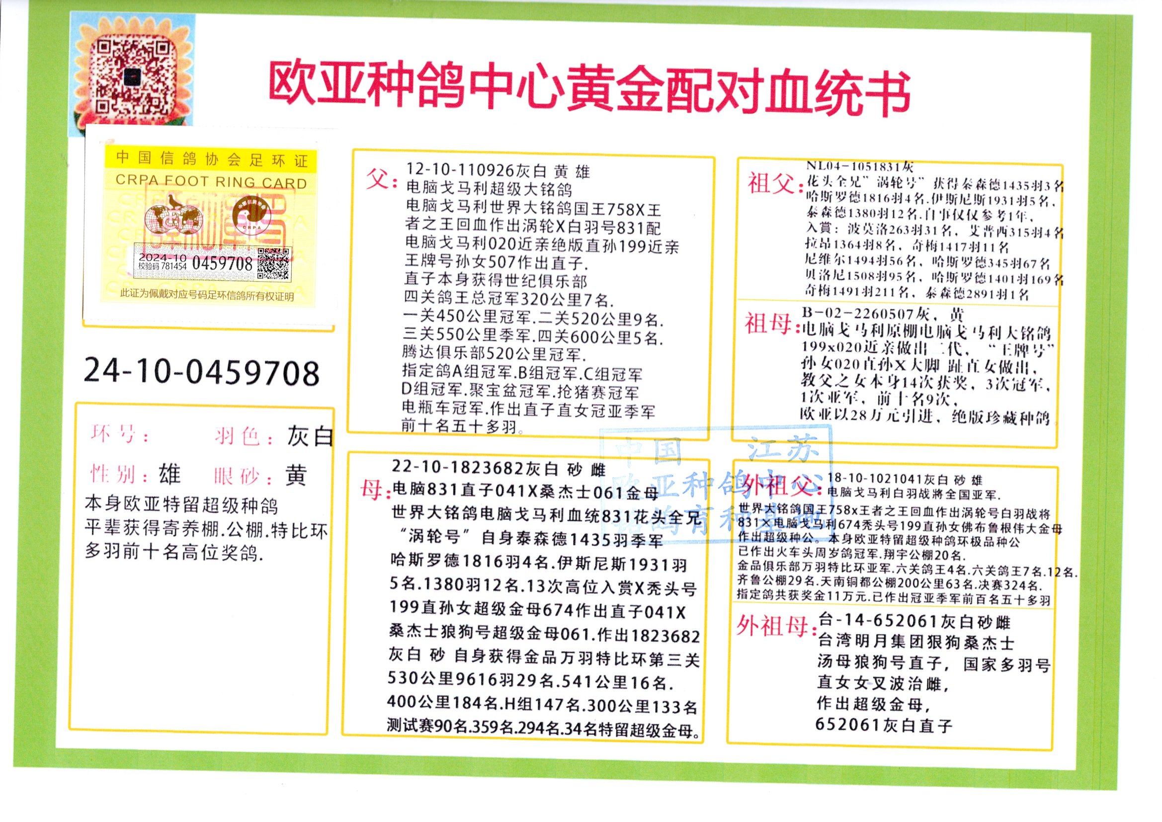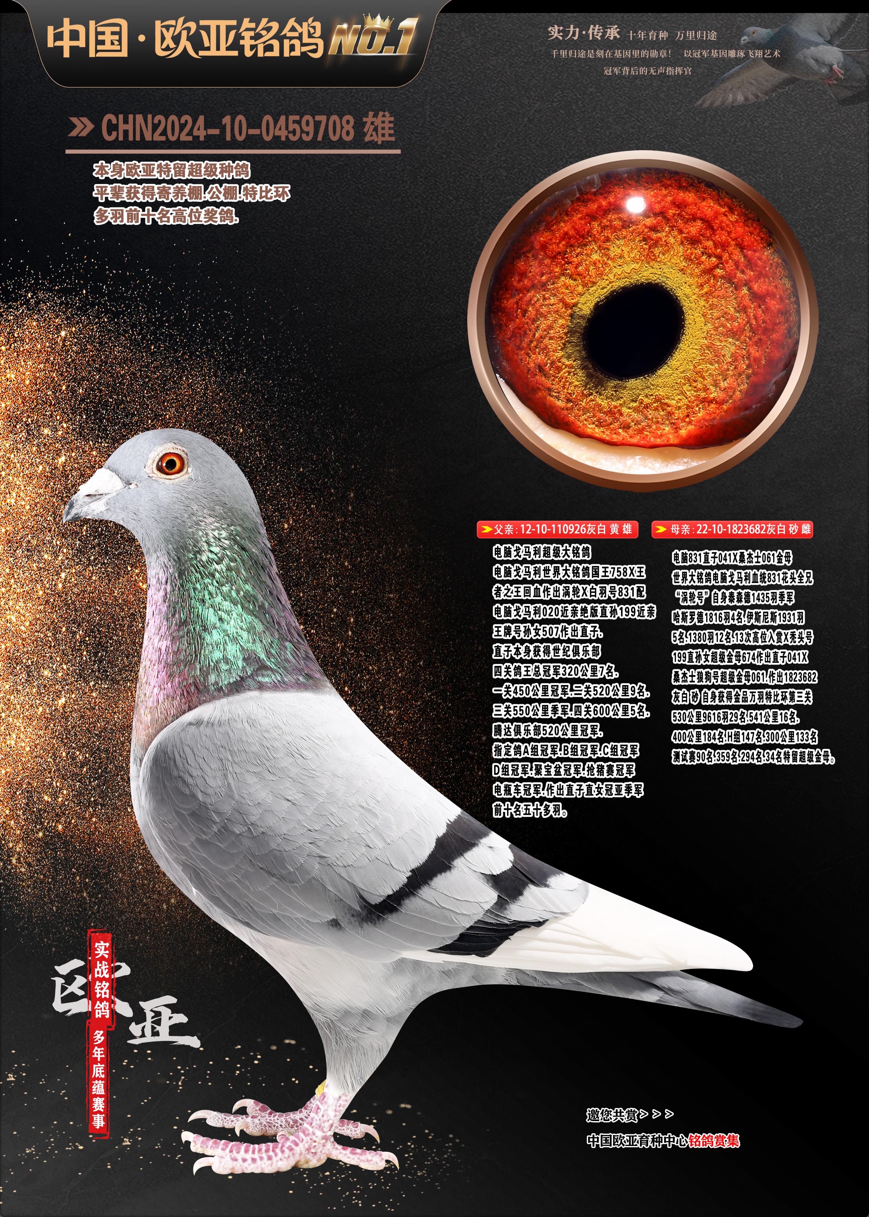 24年秋南京特比环欧亚荣获大团体冠军.小团体冠军551公里大特比13名.14名.16名.19名.20名.21名.24名.26名.27名.28名.42名.52名.54名.57名.65名.66名.68名.70名.71名.72名.74名.76名.80名.82名.83名.84名.85名.86名.90名.92名.110名.116名.121名.122名.128名.131名.158名.161名.164名.165名.166名.172名.174名.177名.182名.195名.196名.201名.205名.208名.210名.216名.253名.269名.275名.276名.294名.296名.299名,,24年秋云南天南铜都公棚决赛415名.天南铜都小棚决赛409名.云南玉活公棚决赛102名.490名.团体32名上笼二羽进二羽,天南铜都大棚506公里决赛445名。热烈祝贺河北省巨鹿县李兰生老师用欧亚泰山号血系连续十一年夺冠军,河北省国家赛冠军.全国季军等多次前十名高位,扬州王军王总用欧亚利奥24年春季获山东翔宇公棚决赛33名盖比53名。南京刘正龙刘总用欧亚盖比获得24年秋山东潍坊国际公棚决赛42名.精英赛30名.三关鸽王71名.决赛86名.加站赛16名.南京市特比环A组鸽王9名.B组鸽王5名.6名.C组鸽王5名.精英赛冠军4名.技能赛A组冠军4名.5名.秦淮区特比环荣获15名.46名.48名.87名。四川西昌徐亮徐总用欧亚利奥获得凉山州聚友决赛177名.第二关亚军双关鸽王19名.三关鸽王105名.云南豪庭公棚决赛603名。热烈祝贺24年四川重庆翔园鸽舍用欧亚泰山号荣获春季400公里冠军.秋季500公里冠军,河北王总用詹森X利奥获得千羽千翔公棚400公里冠军,广东蔡楷焕荣获24年秋爱好者 赛鸽俱乐部三关鸽王季军.一关420公里99名.二关450公里11名.三关520公里32名.单关季军.7名.12名,江西李卫兴荣获贵州红枫公棚8名.共翔俱乐部寄养棚四关综合鸽王30名.一关400公里78名.二关500公里55名.三关520公里37名.四关500公里57名.同父母获公棚18名.雷鸣获得武汉黄浦育翔中心冠军,四川陈文获得四川明鸿俱乐部300公里梦幻2名.3名.4名.9名.10名.13名.14名.15名.31名.34名.40名.41名.42名.43名.69名.71名.72名.73名.74名.94名.95名.97名.98名.99名.419公里决赛荣获总冠军7名.总共归巢9羽,四川徐亮获豪庭决赛603名,山西郑勇获得山西泰鑫公棚决赛255名詹森红狐,热烈祝贺马总获得开尔(飞跃队)决赛9名获奖金1310000万元.第一关52名,天津津福资赛180公里96名.获奖金429543万元,欧亚支持全国鸽友24年秋多人报喜 祝大家取得更好成绩,给欧亚报喜鸽友欧亚决定给每人赠送一羽超级种鸽。欧亚俱乐部特比环多关鸽王成绩:15年秋淮安特比环黑色星期一全会上笼9700多羽,当天无鸽归巢,第二天全会归巢357羽,本舍归巢158羽.前十名八羽.前一百名归巢57羽,16年春季获五关鸽王总冠军,总亚军四名.六名.七名.九名.十名.晶艺俱乐部520公里冠亚季军5名.6名.7名.9名.11名等,火车头冠军.季军6名.8名.9名.10名,16年秋晶艺俱乐部特比环520公里亚军.季军4名.6名.7名.9名,15年春南京白下特比环冠军.亚军.季军6名.7名.8名.9名.10名.指定鸽A B组获得冠军.亚军.季军4名.5名.,17年淮安特比环亚军.4名.5名.7名.8名.10名.六关鸽王总冠军.4名.6名.9名.10名,寄养棚宿迁刘总20羽特比环获冠军.季军.4名.7名.8名.9名等。18年荣获万羽特比环六关鸽王总冠军.总亚军.总季军.6名.8名.十名.单关四羽冠军.二羽亚军.四羽季军.前十名27羽。19年秋万羽特比环六关鸽王总亚军.总季军.5名.8名等,单关二羽冠军.三羽亚军.一羽季军前十名31羽。20年秋淮安市鸽会四关特比环大赛风雨无阻鸽王亚军.鸽王六名,金品俱乐部万羽特比环六关鸽王总冠军,总亚军.四名.五名.六名.七名.八名.十名.前二百名鸽王35羽,单关冠亚季军前十名四十多羽,火车头五关鸽王季军.六名.八名.前二百名鸽王十七羽。20年春荣获淮安五区一市四关鸽王总冠军.亚军.四名.八名.九名。21年秋荣获金品万羽特比环大赛六关鸽王总亚军.总季军.四名.七名.九名.十名.单关冠亚军季军前十名三十多羽。火车头协会鸽王六名.七名.十名.单关前十名十七羽。22年秋荣获鸽王总冠军.总亚军.5名.7名.8名.9名.11名.单关冠亚季军前十名三十多羽,第一关单关前二百名四十多羽,第二关前二百名三十多羽,第三关前二百名四十多羽,第四关前二百名四十多羽,第五关前一百名53羽。23年秋荣获鸽王季军.五名.八名.十名.13名.17名.20名.27名等多羽鸽王.单关前十名二十多羽。公棚.寄养棚部分成绩:16年秋宁夏黄河公棚总冠军电脑戈马力指定通炮冠军,17年送八羽参赛获得鸽王八名进奖四名,支持韩总荣获八名。支持鸽友荣获宁夏中卫公棚决赛总冠军.精英赛冠军,支持18年宁夏黄河公棚决赛冠军詹森X泰山。安徽鼎博寄养棚院内外四关鸽王总冠军.鸽王十七名.三十七名同窝,鸽王39名.42名.58名.67名。18年山东公棚预赛冠军.决赛65名.送八羽进奖五羽.指定获奔驰汽车一辆。支持鸽友获得云南蓝云公棚冠军.盖比X佛卡门。支持鸽友荣获云南银集公棚决赛冠军 詹森427X520血系 速度赛6700羽冠军。17年荣获金马俱乐部寄养棚四关鸽王总冠军.季军.六名.八名.第一关冠军.亚军.季军四名.七名.十一名.金牌教练奖。支持鸽友18年北京费翔公棚预赛九名电脑X桑杰士,支持鸽友荣获陕西威力公棚决赛11名.内蒙古临河寄养棚四关鸽王六名.詹森配泰山,支持河北王总用欧亚詹森427配胡本喜获20年秋开尔青年棚季军。云南东荣公棚16年预赛冠军.决赛77名.17年决赛12名.詹森红狐X泰山,17年平安公棚决赛4名 詹森427。欧亚获得21年金母寄养棚第一关四名.第二关5名.第三关5名.6名.7名.10名.三关鸽王总冠军,四关鸽王14名.十羽鸽王。支持河