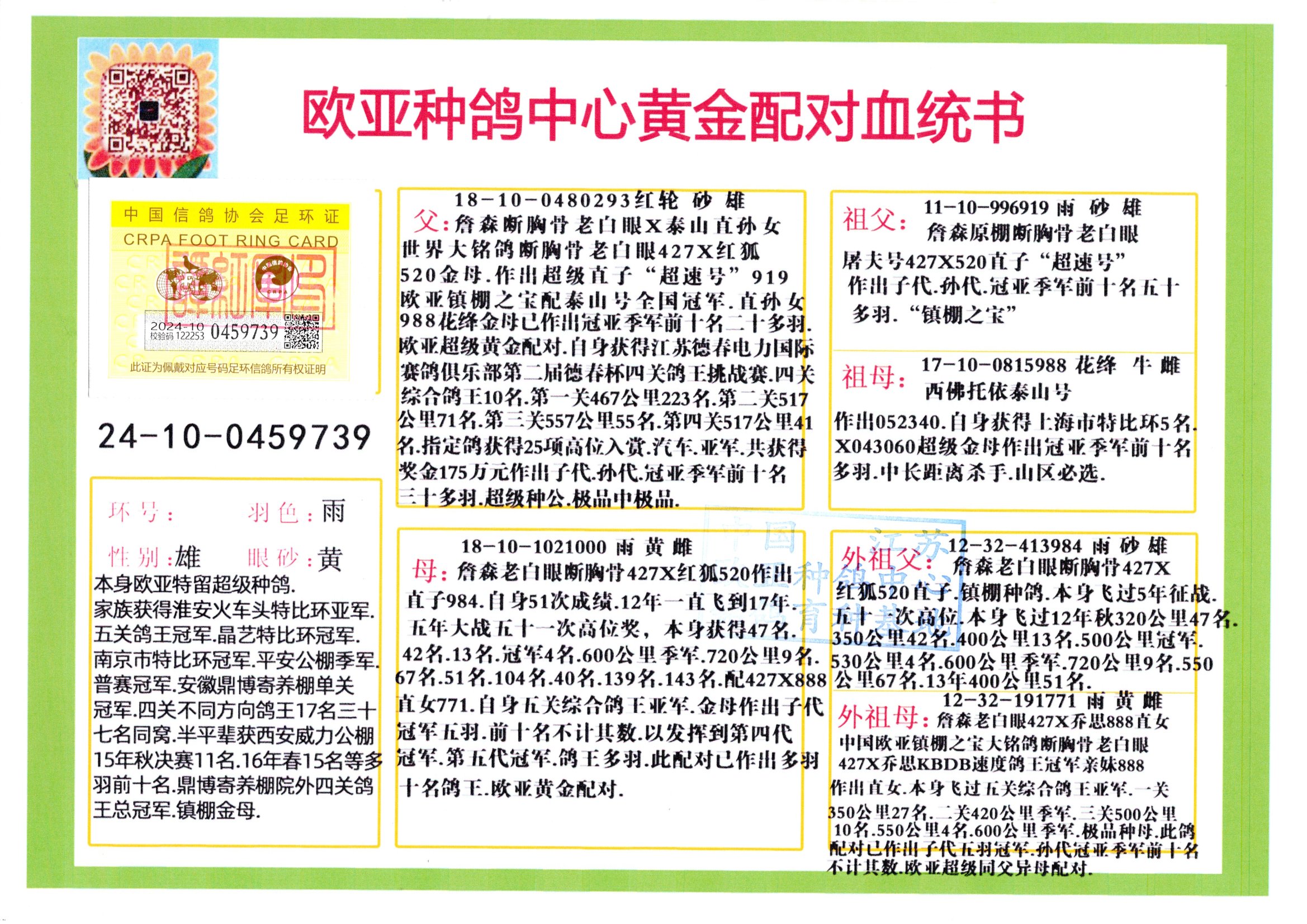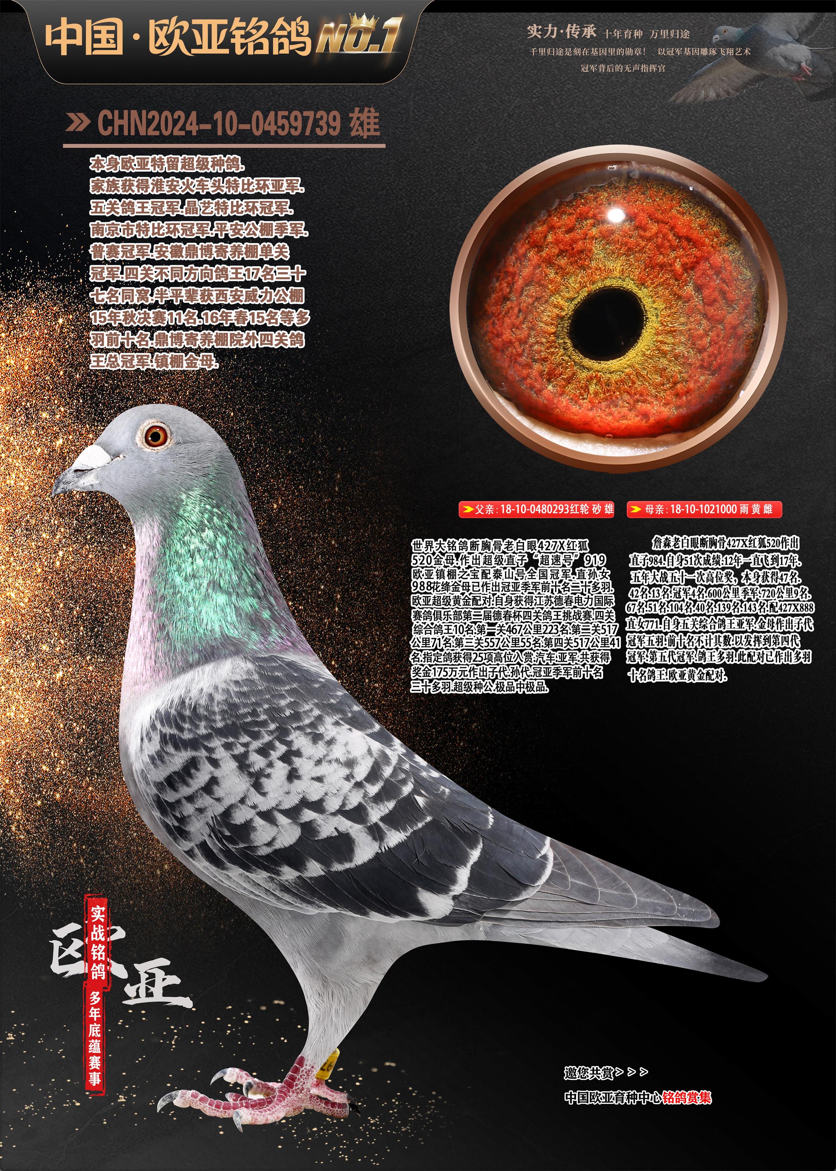 24年秋南京特比环欧亚荣获大团体冠军.小团体冠军551公里大特比13名.14名.16名.19名.20名.21名.24名.26名.27名.28名.42名.52名.54名.57名.65名.66名.68名.70名.71名.72名.74名.76名.80名.82名.83名.84名.85名.86名.90名.92名.110名.116名.121名.122名.128名.131名.158名.161名.164名.165名.166名.172名.174名.177名.182名.195名.196名.201名.205名.208名.210名.216名.253名.269名.275名.276名.294名.296名.299名,,24年秋云南天南铜都公棚决赛415名.天南铜都小棚决赛409名.云南玉活公棚决赛102名.490名.团体32名上笼二羽进二羽,天南铜都大棚506公里决赛445名。热烈祝贺河北省巨鹿县李兰生老师用欧亚泰山号血系连续十一年夺冠军,河北省国家赛冠军.全国季军等多次前十名高位,扬州王军王总用欧亚利奥24年春季获山东翔宇公棚决赛33名盖比53名。南京刘正龙刘总用欧亚盖比获得24年秋山东潍坊国际公棚决赛42名.精英赛30名.三关鸽王71名.决赛86名.加站赛16名.南京市特比环A组鸽王9名.B组鸽王5名.6名.C组鸽王5名.精英赛冠军4名.技能赛A组冠军4名.5名.秦淮区特比环荣获15名.46名.48名.87名。四川西昌徐亮徐总用欧亚利奥获得凉山州聚友决赛177名.第二关亚军双关鸽王19名.三关鸽王105名.云南豪庭公棚决赛603名。热烈祝贺24年四川重庆翔园鸽舍用欧亚泰山号荣获春季400公里冠军.秋季500公里冠军,河北王总用詹森X利奥获得千羽千翔公棚400公里冠军,广东蔡楷焕荣获24年秋爱好者 赛鸽俱乐部三关鸽王季军.一关420公里99名.二关450公里11名.三关520公里32名.单关季军.7名.12名,江西李卫兴荣获贵州红枫公棚8名.共翔俱乐部寄养棚四关综合鸽王30名.一关400公里78名.二关500公里55名.三关520公里37名.四关500公里57名.同父母获公棚18名.雷鸣获得武汉黄浦育翔中心冠军,四川陈文获得四川明鸿俱乐部300公里梦幻2名.3名.4名.9名.10名.13名.14名.15名.31名.34名.40名.41名.42名.43名.69名.71名.72名.73名.74名.94名.95名.97名.98名.99名.419公里决赛荣获总冠军7名.总共归巢9羽,四川徐亮获豪庭决赛603名,山西郑勇获得山西泰鑫公棚决赛255名詹森红狐,热烈祝贺马总获得开尔(飞跃队)决赛9名获奖金1310000万元.第一关52名,天津津福资赛180公里96名.获奖金429543万元,欧亚支持全国鸽友24年秋多人报喜 祝大家取得更好成绩,给欧亚报喜鸽友欧亚决定给每人赠送一羽超级种鸽。欧亚俱乐部特比环多关鸽王成绩:15年秋淮安特比环黑色星期一全会上笼9700多羽,当天无鸽归巢,第二天全会归巢357羽,本舍归巢158羽.前十名八羽.前一百名归巢57羽,16年春季获五关鸽王总冠军,总亚军四名.六名.七名.九名.十名.晶艺俱乐部520公里冠亚季军5名.6名.7名.9名.11名等,火车头冠军.季军6名.8名.9名.10名,16年秋晶艺俱乐部特比环520公里亚军.季军4名.6名.7名.9名,15年春南京白下特比环冠军.亚军.季军6名.7名.8名.9名.10名.指定鸽A B组获得冠军.亚军.季军4名.5名.,17年淮安特比环亚军.4名.5名.7名.8名.10名.六关鸽王总冠军.4名.6名.9名.10名,寄养棚宿迁刘总20羽特比环获冠军.季军.4名.7名.8名.9名等。18年荣获万羽特比环六关鸽王总冠军.总亚军.总季军.6名.8名.十名.单关四羽冠军.二羽亚军.四羽季军.前十名27羽。19年秋万羽特比环六关鸽王总亚军.总季军.5名.8名等,单关二羽冠军.三羽亚军.一羽季军前十名31羽。20年秋淮安市鸽会四关特比环大赛风雨无阻鸽王亚军.鸽王六名,金品俱乐部万羽特比环六关鸽王总冠军,总亚军.四名.五名.六名.七名.八名.十名.前二百名鸽王35羽,单关冠亚季军前十名四十多羽,火车头五关鸽王季军.六名.八名.前二百名鸽王十七羽。20年春荣获淮安五区一市四关鸽王总冠军.亚军.四名.八名.九名。21年秋荣获金品万羽特比环大赛六关鸽王总亚军.总季军.四名.七名.九名.十名.单关冠亚军季军前十名三十多羽。火车头协会鸽王六名.七名.十名.单关前十名十七羽。22年秋荣获鸽王总冠军.总亚军.5名.7名.8名.9名.11名.单关冠亚季军前十名三十多羽,第一关单关前二百名四十多羽,第二关前二百名三十多羽,第三关前二百名四十多羽,第四关前二百名四十多羽,第五关前一百名53羽。23年秋荣获鸽王季军.五名.八名.十名.13名.17名.20名.27名等多羽鸽王.单关前十名二十多羽。公棚.寄养棚部分成绩:16年秋宁夏黄河公棚总冠军电脑戈马力指定通炮冠军,17年送八羽参赛获得鸽王八名进奖四名,支持韩总荣获八名。支持鸽友荣获宁夏中卫公棚决赛总冠军.精英赛冠军,支持18年宁夏黄河公棚决赛冠军詹森X泰山。安徽鼎博寄养棚院内外四关鸽王总冠军.鸽王十七名.三十七名同窝,鸽王39名.42名.58名.67名。18年山东公棚预赛冠军.决赛65名.送八羽进奖五羽.指定获奔驰汽车一辆。支持鸽友获得云南蓝云公棚冠军.盖比X佛卡门。支持鸽友荣获云南银集公棚决赛冠军 詹森427X520血系 速度赛6700羽冠军。17年荣获金马俱乐部寄养棚四关鸽王总冠军.季军.六名.八名.第一关冠军.亚军.季军四名.七名.十一名.金牌教练奖。支持鸽友18年北京费翔公棚预赛九名电脑X桑杰士,支持鸽友荣获陕西威力公棚决赛11名.内蒙古临河寄养棚四关鸽王六名.詹森配泰山,支持河北王总用欧亚詹森427配胡本喜获20年秋开尔青年棚季军。云南东荣公棚16年预赛冠军.决赛77名.17年决赛12名.詹森红狐X泰山,17年平安公棚决赛4名 詹森427。欧亚获得21年金母寄养棚第一关四名.第二关5名.第三关5名.6名.7名.10名.三关鸽王总冠军,四关鸽王14名.十羽鸽王。支持河
