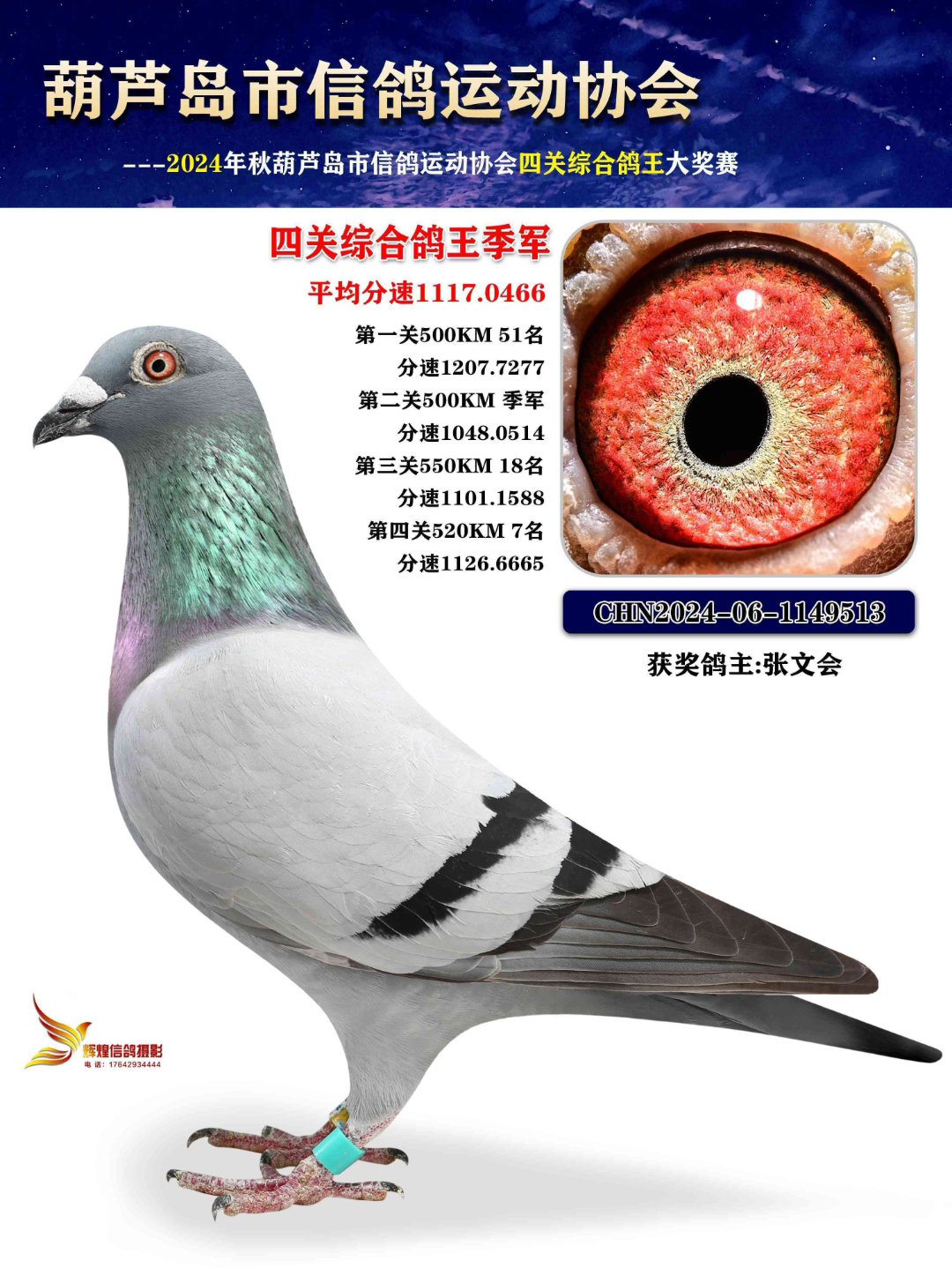张文会教练从2024年秋季开始担任本舍葫芦岛顺翔寄养棚团队院外教练(本地区比赛登记的都是教练名字,不加鸽主名,不管院内和院外,都是只登记教练名),荣获: