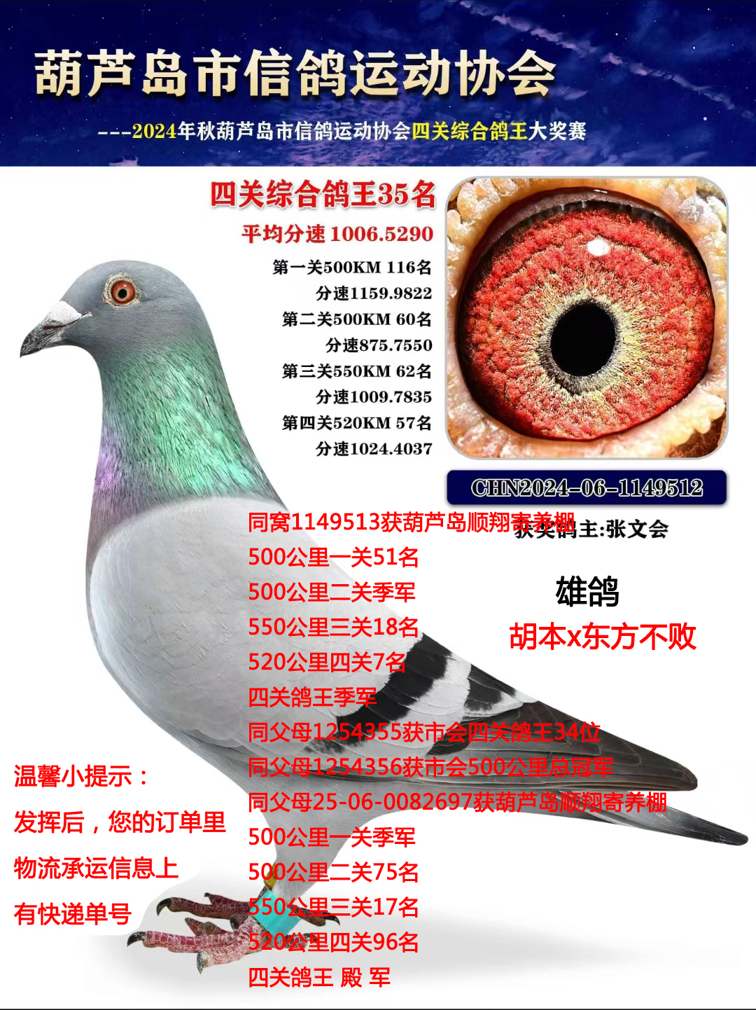 连续两年秋季赛事获得四关鸽王高位成绩,并获秋季院外职业组团体冠军,今年本舍在翔铃俱乐部又获得四关鸽王团体冠军,成功源于实战,本舍依靠着东方不败,胡本两大血系,一直延续至今。而且不光是本舍自己飞的好,卖出去的鸽子依旧给鸽友们飞出鸽王高位奖很多,每年都会收到很多鸽友的报喜,这就证明了辉煌的赛绩后面依靠的是强大的家族,只有拥有实战家族,才会带来源源不断的辉煌赛绩。