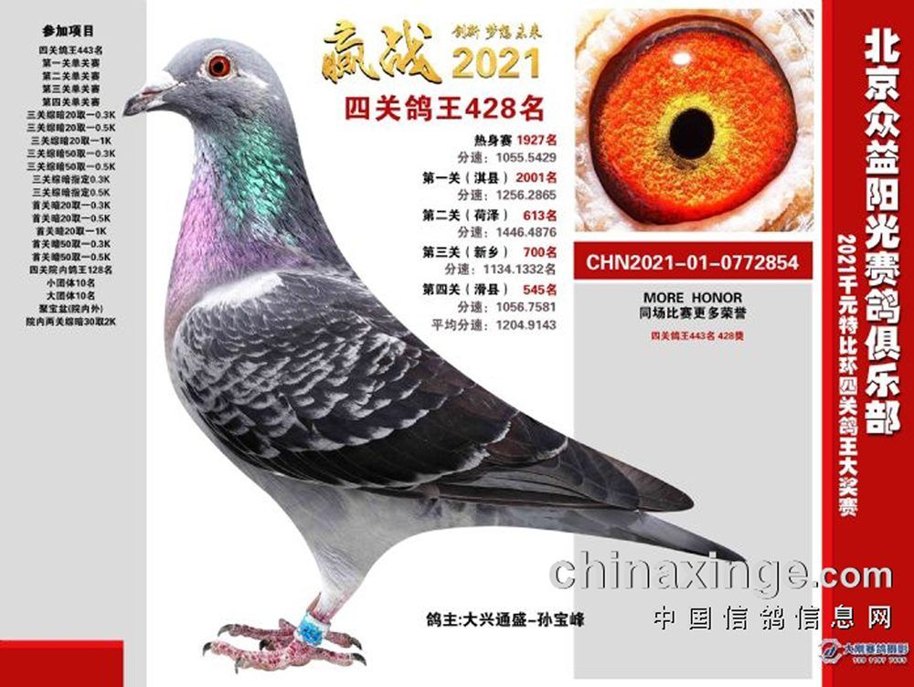 北京众益阳光赛鸽俱乐部千元特比环四关综合鸽王428名;