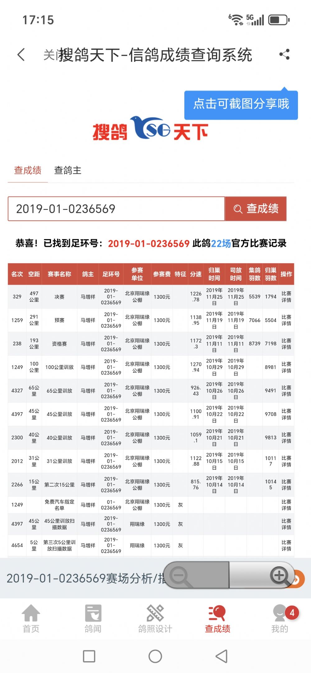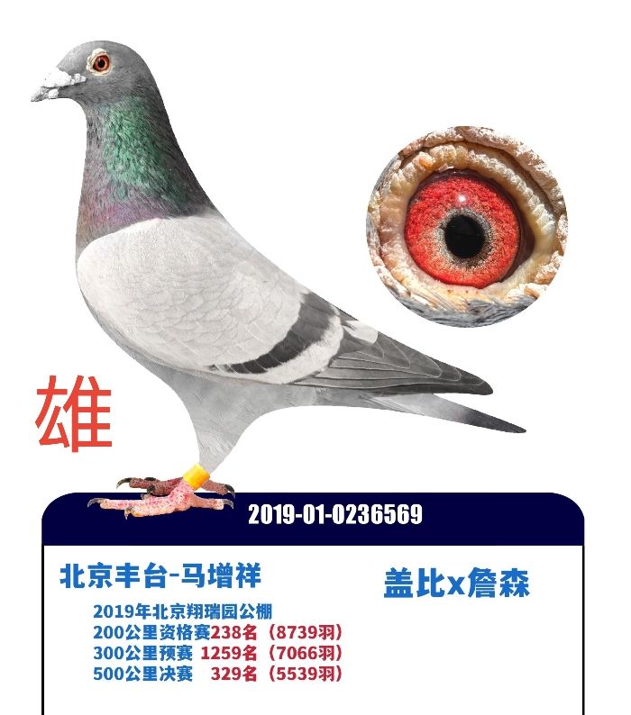 2019年北京丰台马增祥,送北京翔瑞园赛鸽公棚,200公里资格赛238名(8739羽),300公里预赛1259名(7066羽),500公里决赛329名(5539羽),雄,自身质量非常高级,血统,盖比x詹森。