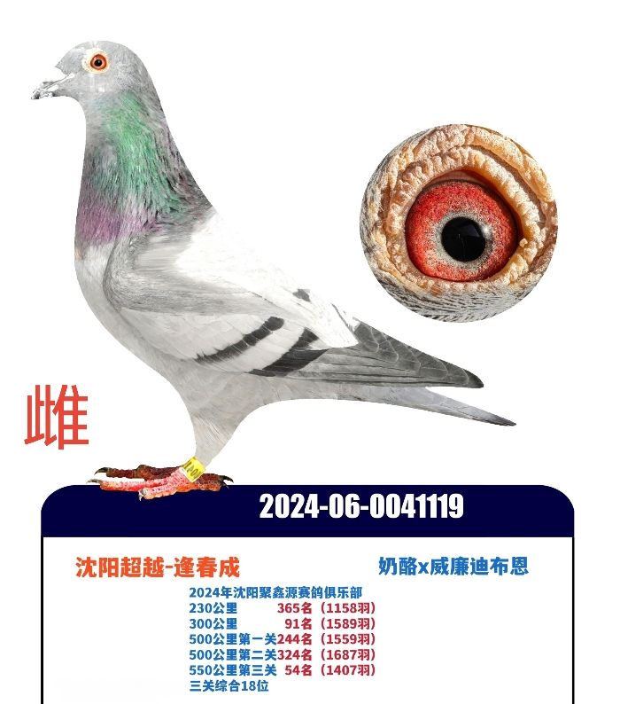 2024年辽宁实战赛鸽强豪,辽宁超越-逢春成,沈阳信鸽协会,230公里365名(1158羽)分速:1213.91,300公里91名(1589羽)分速:1480.2,500公里第一关244名(1559羽)分速:590.52,灭关赛,500公里第二关324名(1687羽)分速:1606.3,550公里决杀关54名(1407羽)分速:1425.87。雌,自身质量高级,血统,奶酪x威廉迪布恩。