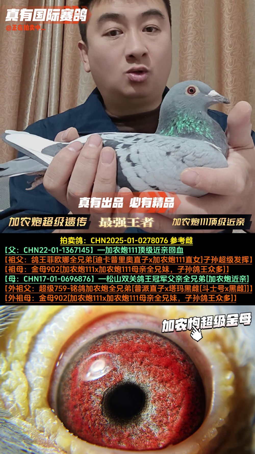 由于所有拍卖鸽均没有作育记录,因此无法100%保证雌雄的正确性,拍卖视频中的雌雄仅供参考,最终以实物为主。如有雌雄特殊要求请及时联系真有国际确认,所有拍卖鸽均享受7天免费换鸽服务(运费自理),由于拍卖形式的鸽子具备商品的唯一性,因此不支持退款服务,感谢大家的理解与支持!谢谢!